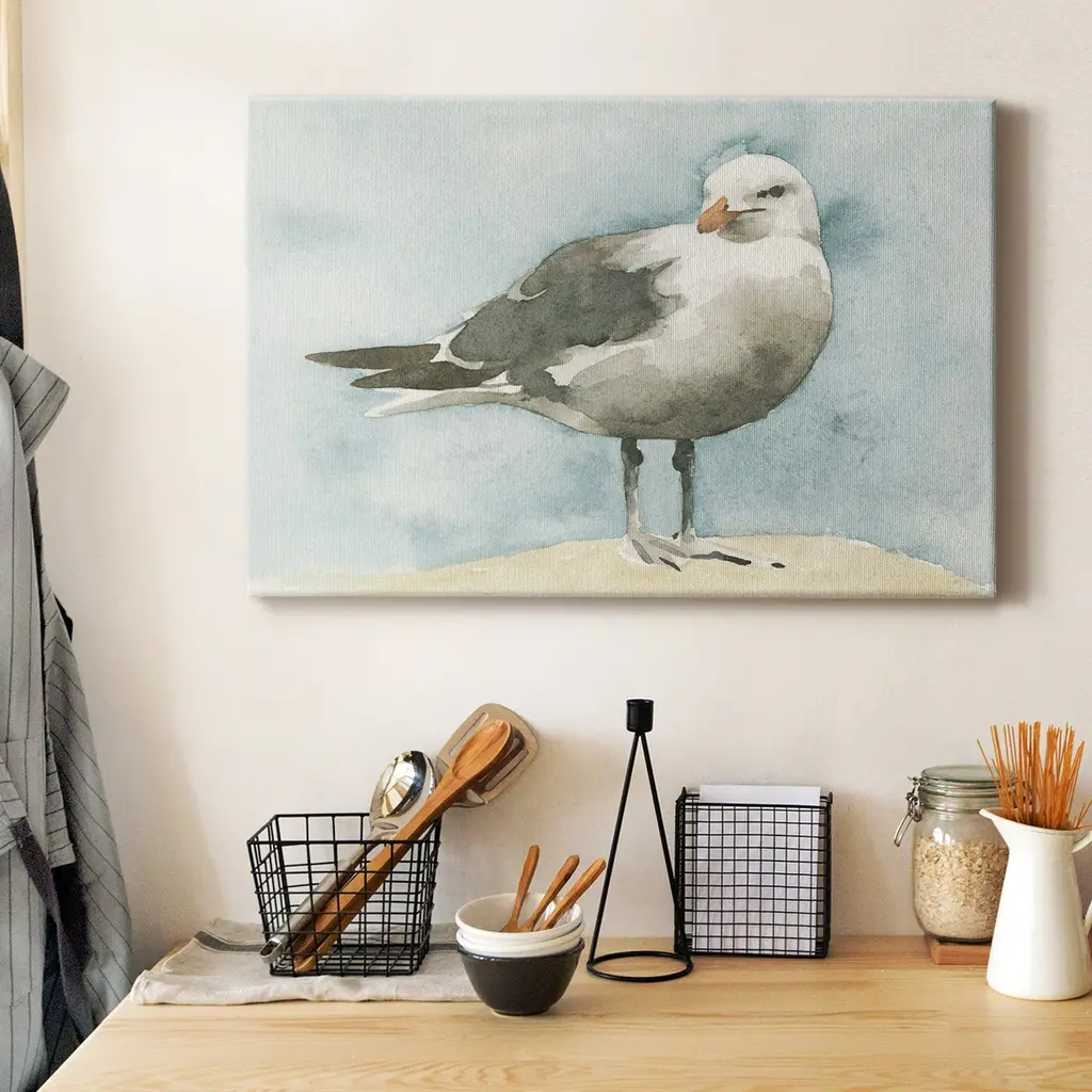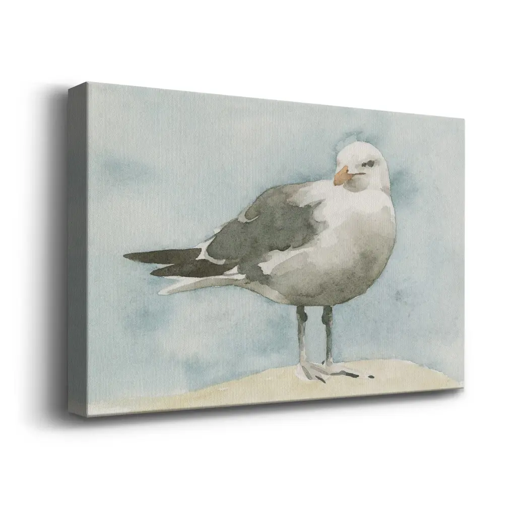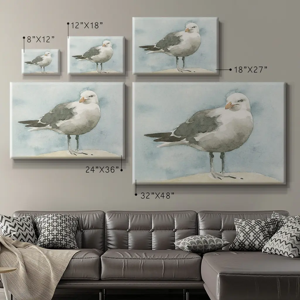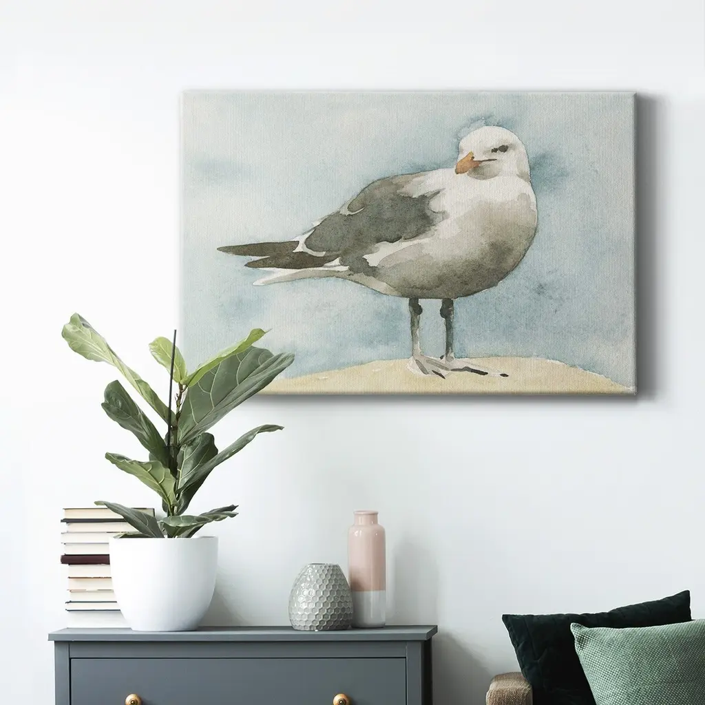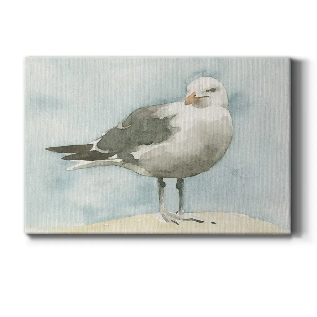 Simple Seagull I Premium Gallery Wrapped Canvas - Ready to Hang A premium hand stretched gallery wrapped canvas print created to last. Featuring a beveled a solid wood stretcher bar, each piece comes ready to hand 6 SIZES AVAILABLE 8''X12'' - Overall Size 12''X18'' - Overall Size 18''X27'' - Overall Size 24''x36'' - Overall Size 32''x48'' - Overall Size 40''x60'' - Overall Size Each piece is made to order. Built to Last Each piece comes ready to hang Solid wood stretcher Fade and Water resistant Made domestically