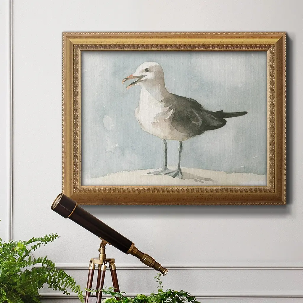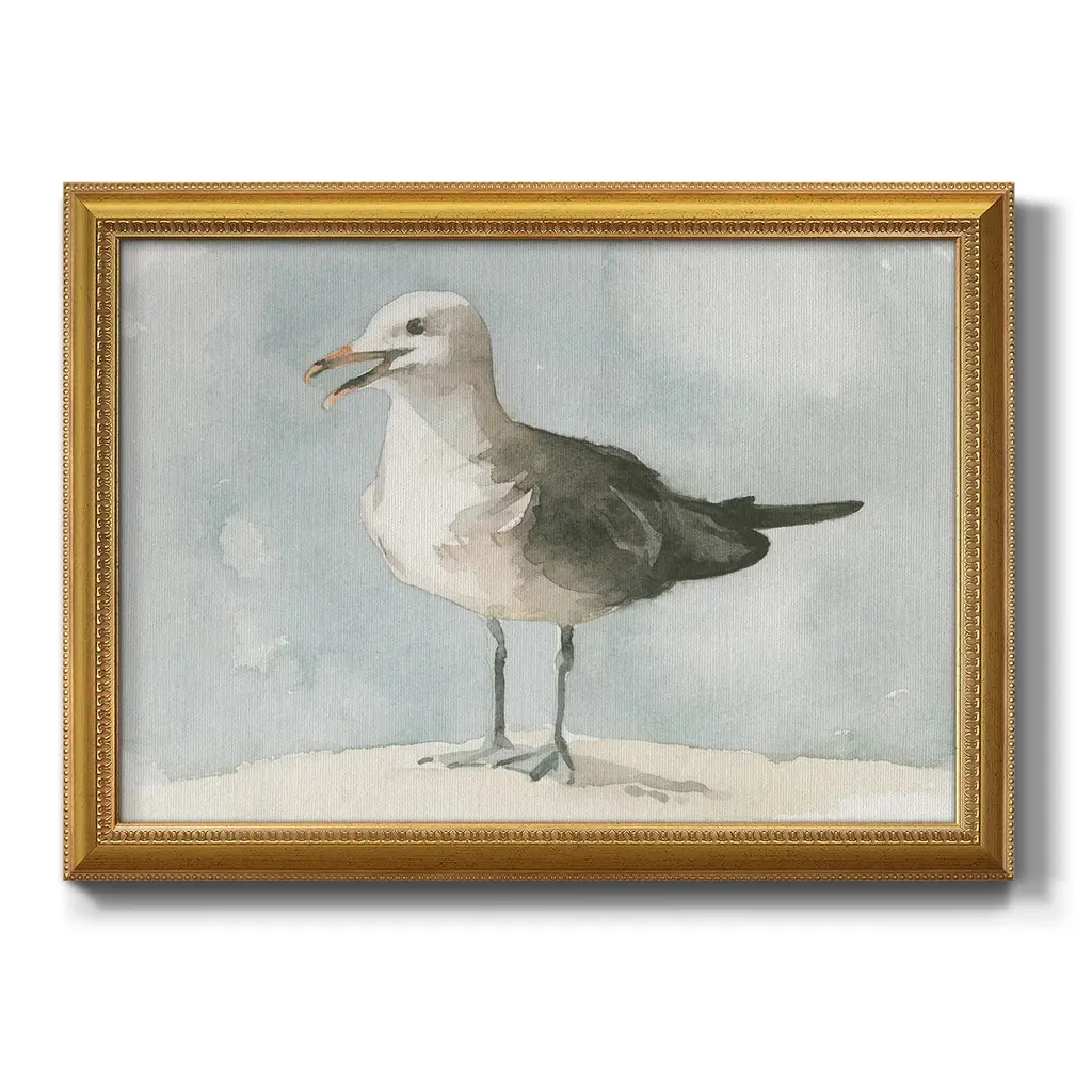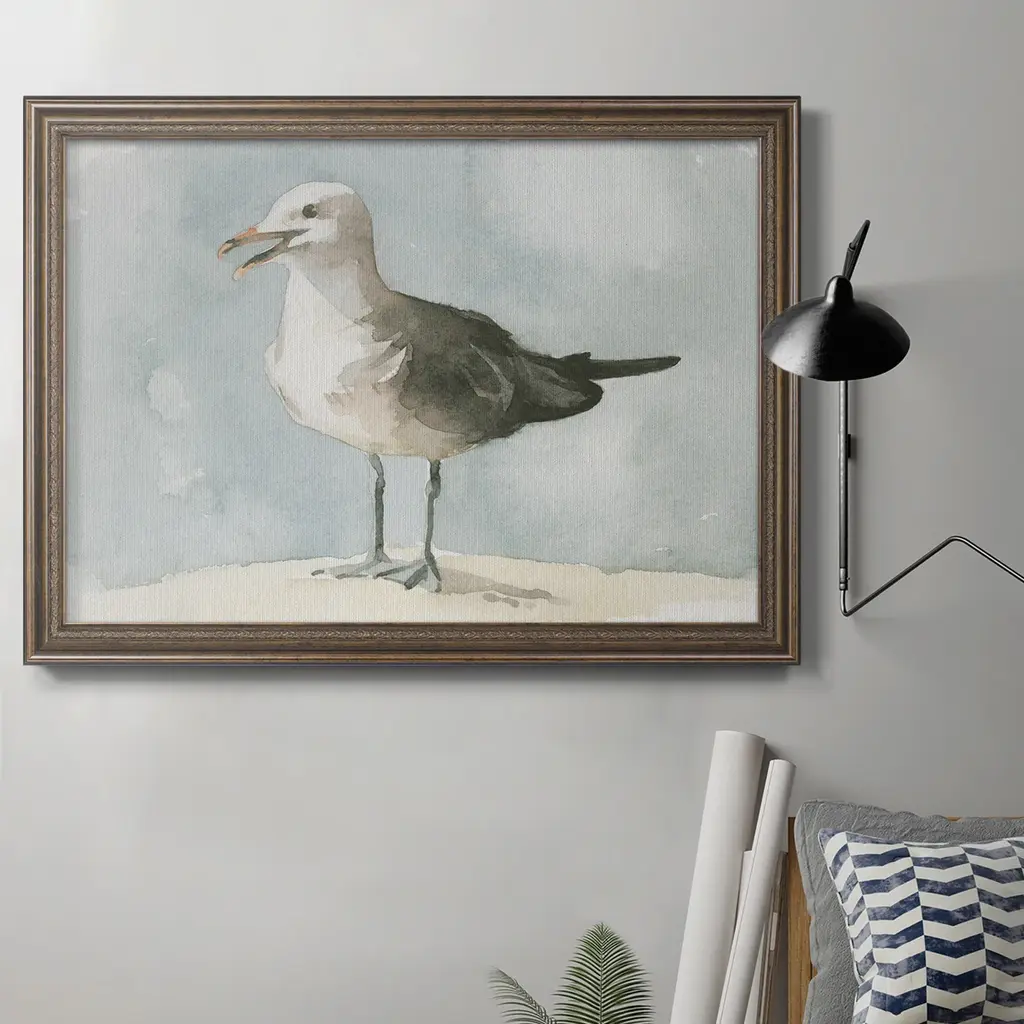 Simple Seagull II Premium Framed Canvas- Ready to Hang A Premium Framed Canvas created to last. Framed in distressed wood and available in an array of sizes and colors Featuring a beveled a solid wood stretcher bar, each piece comes ready to hand 3 SIZES AVAILABLE 16''X20'' - Overall Size 18'X27'' - Overall Size 24''x36'' - Overall Size Each piece is made to order. Each piece comes with hanging hardware. Made in the USA Ready to Hang Giclee Paper Print Acrylic Glass Beveled Matt Board
