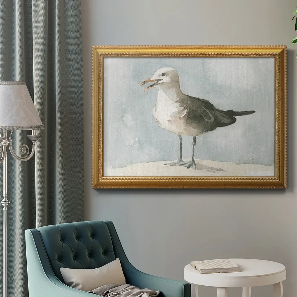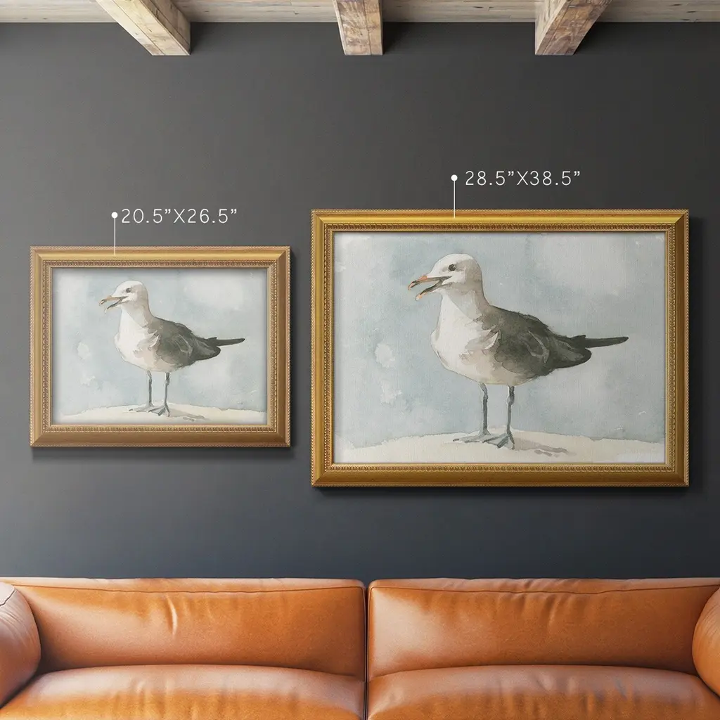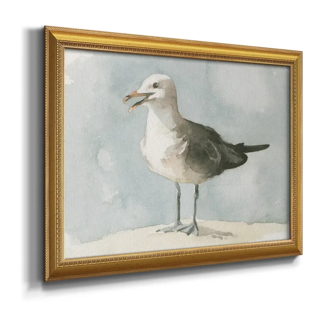 Simple Seagull II Premium Framed Canvas- Ready to Hang A Premium Framed Canvas created to last. Framed in distressed wood and available in an array of sizes and colors Featuring a beveled a solid wood stretcher bar, each piece comes ready to hand 3 SIZES AVAILABLE 16''X20'' - Overall Size 18'X27'' - Overall Size 24''x36'' - Overall Size Each piece is made to order. Each piece comes with hanging hardware. Made in the USA Ready to Hang Giclee Paper Print Acrylic Glass Beveled Matt Board
