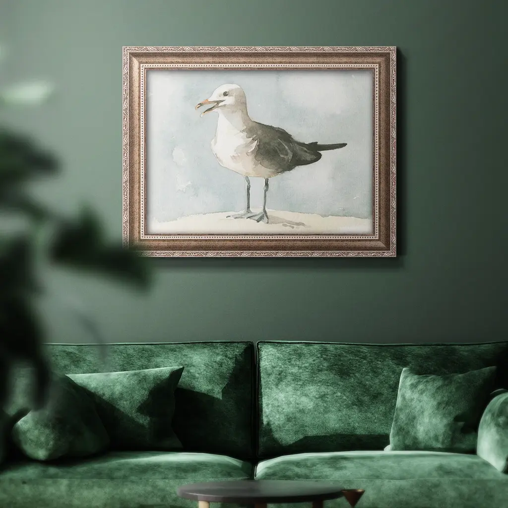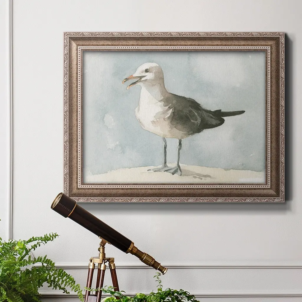Simple Seagull II Premium Framed Canvas- Ready to Hang A Premium Framed Canvas created to last. Framed in distressed wood and available in an array of sizes and colors Featuring a beveled a solid wood stretcher bar, each piece comes ready to hand 3 SIZES AVAILABLE 16''X20'' - Overall Size 18'X27'' - Overall Size 24''x36'' - Overall Size Each piece is made to order. Each piece comes with hanging hardware. Made in the USA Ready to Hang Giclee Paper Print Acrylic Glass Beveled Matt Board