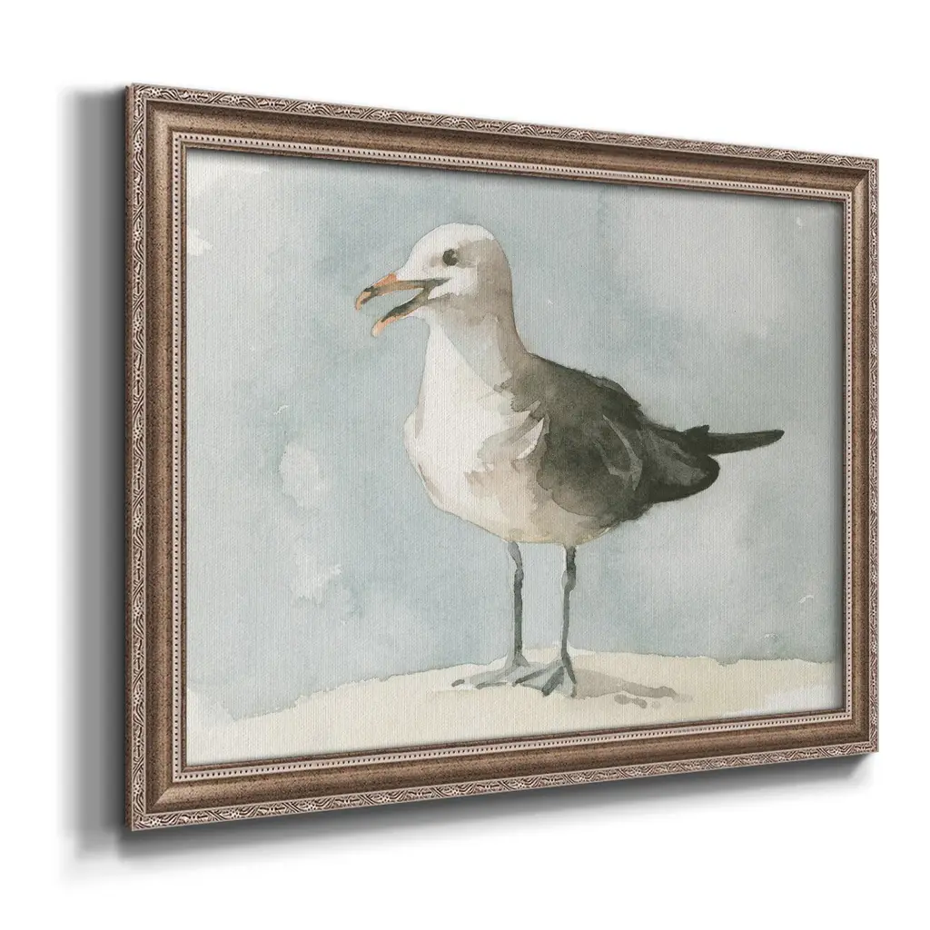 Simple Seagull II Premium Framed Canvas- Ready to Hang A Premium Framed Canvas created to last. Framed in distressed wood and available in an array of sizes and colors Featuring a beveled a solid wood stretcher bar, each piece comes ready to hand 3 SIZES AVAILABLE 16''X20'' - Overall Size 18'X27'' - Overall Size 24''x36'' - Overall Size Each piece is made to order. Each piece comes with hanging hardware. Made in the USA Ready to Hang Giclee Paper Print Acrylic Glass Beveled Matt Board