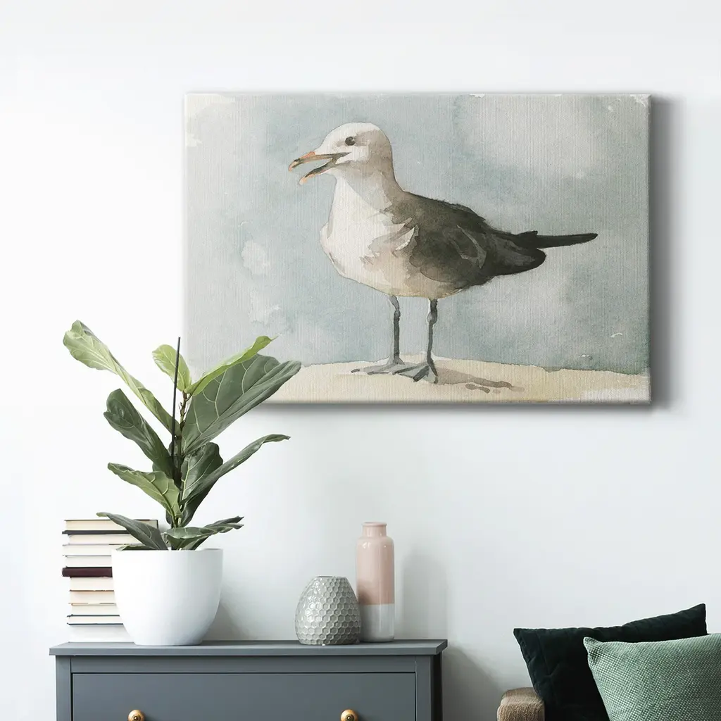Simple Seagull II Premium Gallery Wrapped Canvas - Ready to Hang A premium hand stretched gallery wrapped canvas print created to last. Featuring a beveled a solid wood stretcher bar, each piece comes ready to hand 6 SIZES AVAILABLE 8''X12'' - Overall Size 12''X18'' - Overall Size 18''X27'' - Overall Size 24''x36'' - Overall Size 32''x48'' - Overall Size 40''x60'' - Overall Size Each piece is made to order. Built to Last Each piece comes ready to hang Solid wood stretcher Fade and Water resistant Made domestically