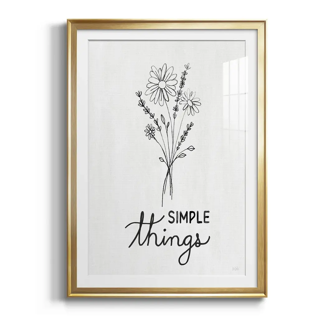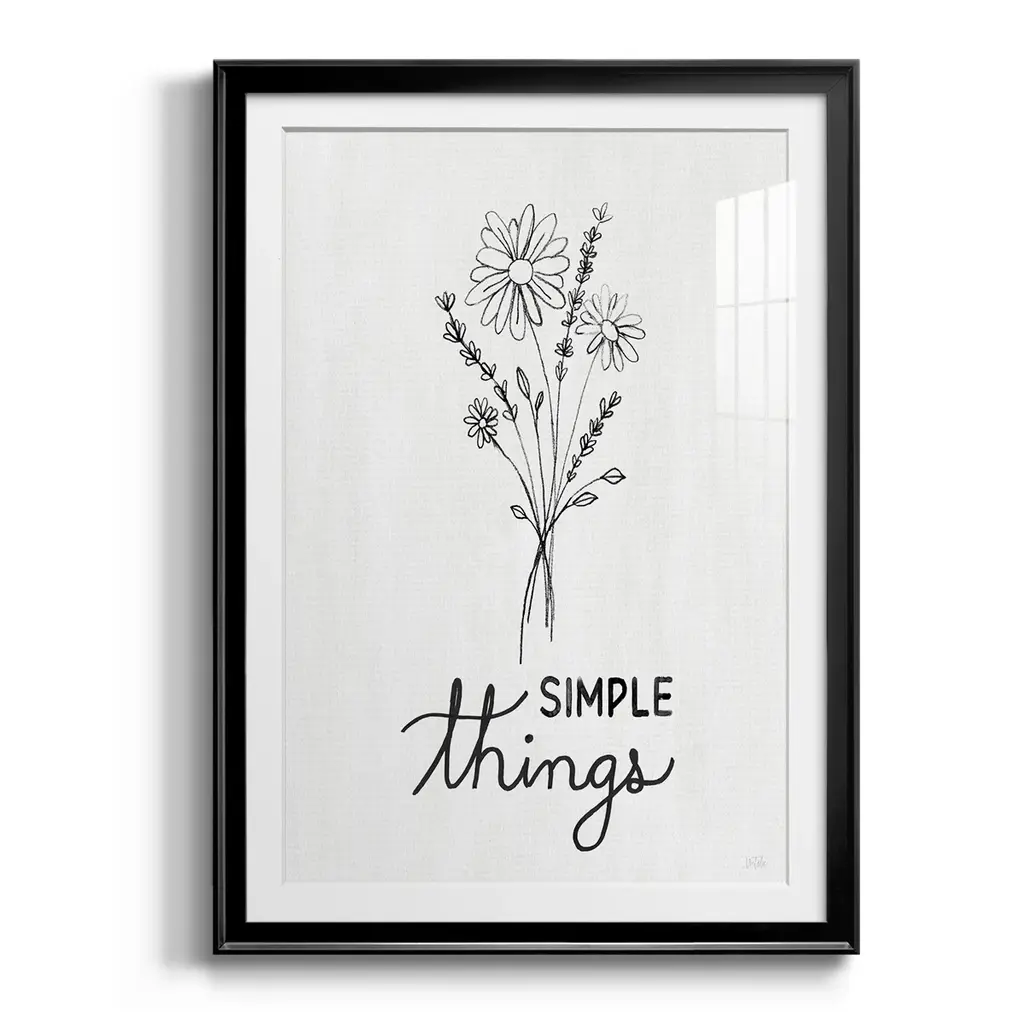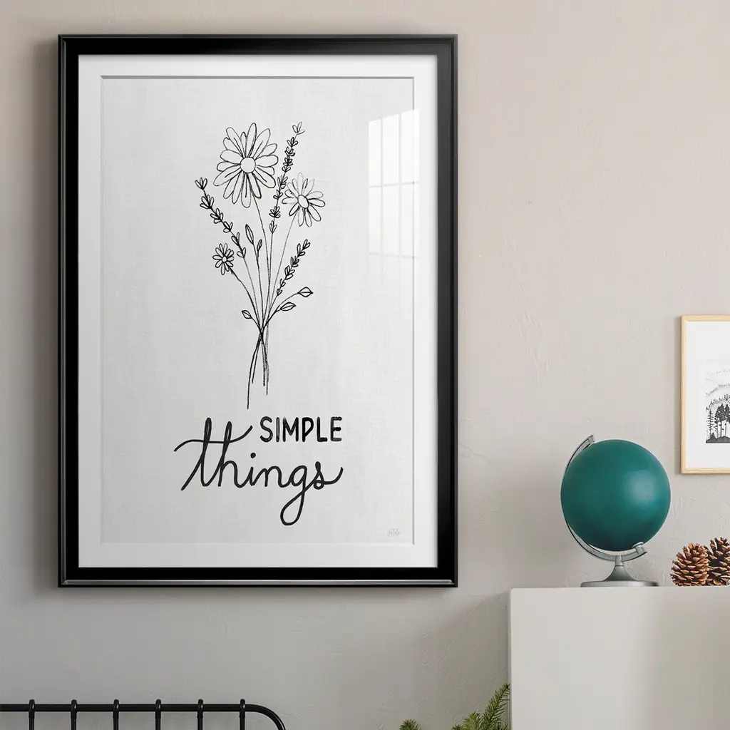 Simple Things Sketch Premium Framed Print - Ready to Hang A Premium Framed Print created to last. Framed in distressed wood and available in an array of sizes and colors Featuring a beveled a solid wood stretcher bar, each piece comes ready to hand 4 SIZES AVAILABLE 30.5''X42.5'' - Overall Size 26.5'X36.5'' - Overall Size 22.5''x30.5'' - Overall Size 18.5''x24.5'' - Overall Size Each piece is made to order. Each piece comes with hanging hardware. Made in the USA Ready to Hang Giclee Paper Print Acrylic Glass Beveled Matt Board