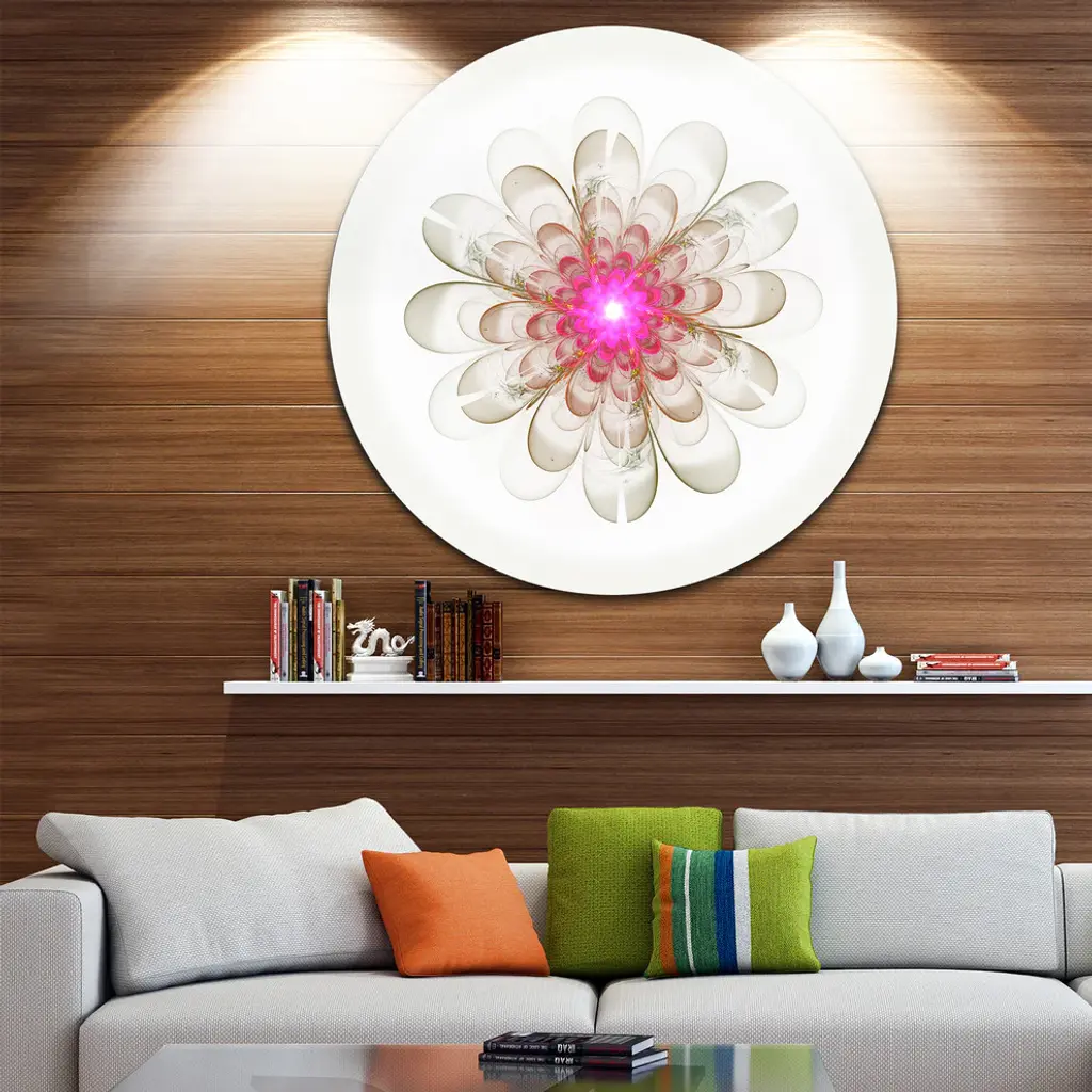 Bring Contemporary Abstraction to your home with this large Circle Metal wall art. This Simple White Pink Fractal Flower Art Metal Artwork makes it the focal point of any room or office. - White Gloss Coating ensures colors are extra vibrant with light reflection.- Aluminum grade Sheet Metal with 1 inch mounting frame on the back giving the illusion that the artwork is floating on the wall..- Mounting Brackets are included along with instructions.- High Quality Digital images are created directly into a glossy aluminum panel producing a stunning and captivating print into the glossy finish of the metal.- Water, Fire and Scratch resistant HD Aluminum panels.- Looks better than any photo paper and guaranteed to last at least 20 years- Easy to clean with a microfiber cloth. Colors are far superior to regular Canvas Art. - Easy to Hang