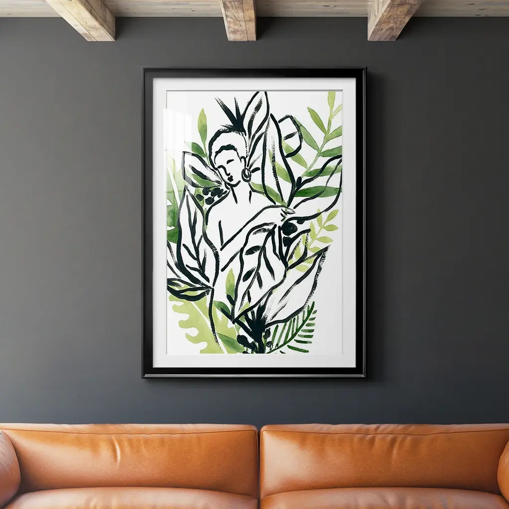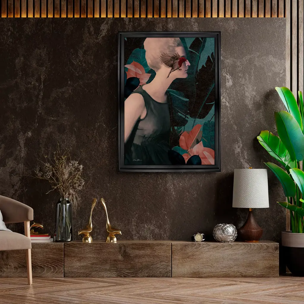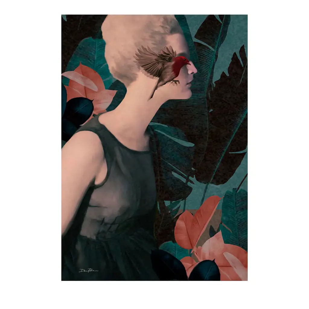 In this marvelous print on fine cotton canvas tropical greenery is the background for a graceful woman whose gaze is concealed behind the one of a flying bird. Rendered in an enthralling palette ranging from antiqued pink to emerald green, it is a unique pop-surrealist artwork coming mounted on a dried pine framework and enclosed within a limewood frame. The artwork belongs to a limited-edition series where every piece is numbered, signed, and supplied with its authenticity certificate,