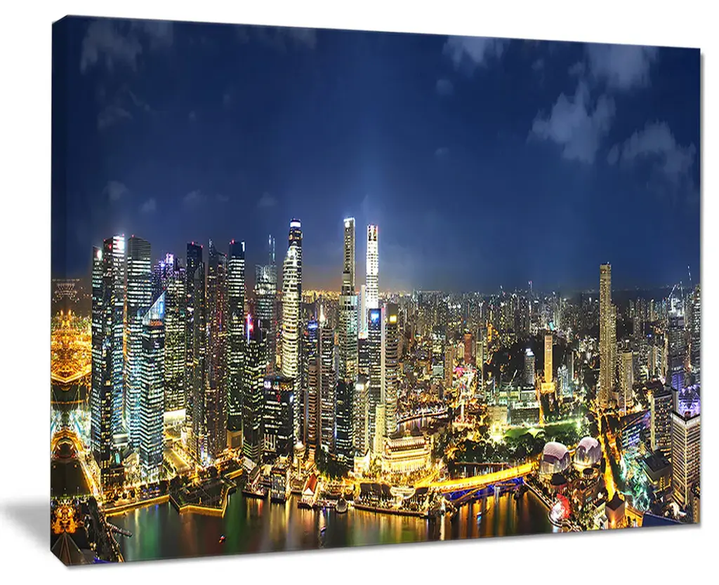 The Singapore Skyline View of Marina Bay canvas art print is sure to make an impression on anyone who sees it. This artwork is gallery wrapped around a 1-inch solid wood frame and arrives carefully packaged and entirely ready to hang on the wall. Design Art only uses the highest resolution and pigments to ensure a crisp colorful print that is never faded or pixelated. This artwork is sure to be a conversation starter in any home or office.