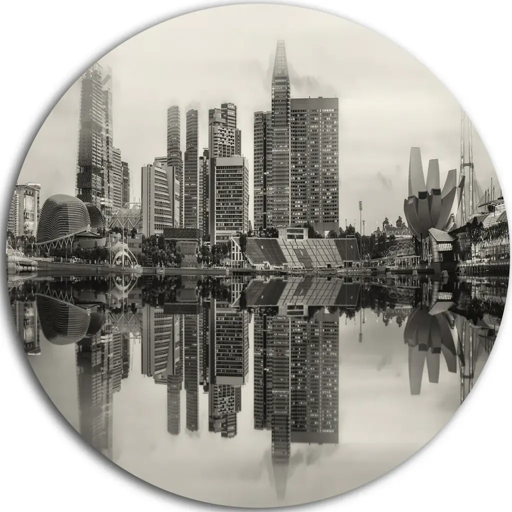 Bring Contemporary Abstraction to your home with this large Circle Metal wall art. This Singapore Skyline View Panorama Metal Artwork makes it the focal point of any room or office. - White Gloss Coating ensures colors are extra vibrant with light reflection.- Aluminum grade Sheet Metal with 1 inch mounting frame on the back giving the illusion that the artwork is floating on the wall..- Mounting Brackets are included along with instructions.- High Quality Digital images are created directly into a glossy aluminum panel producing a stunning and captivating print into the glossy finish of the metal.- Water, Fire and Scratch resistant HD Aluminum panels.- Looks better than any photo paper and guaranteed to last at least 20 years- Easy to clean with a microfiber cloth. Colors are far superior to regular Canvas Art. - Easy to Hang