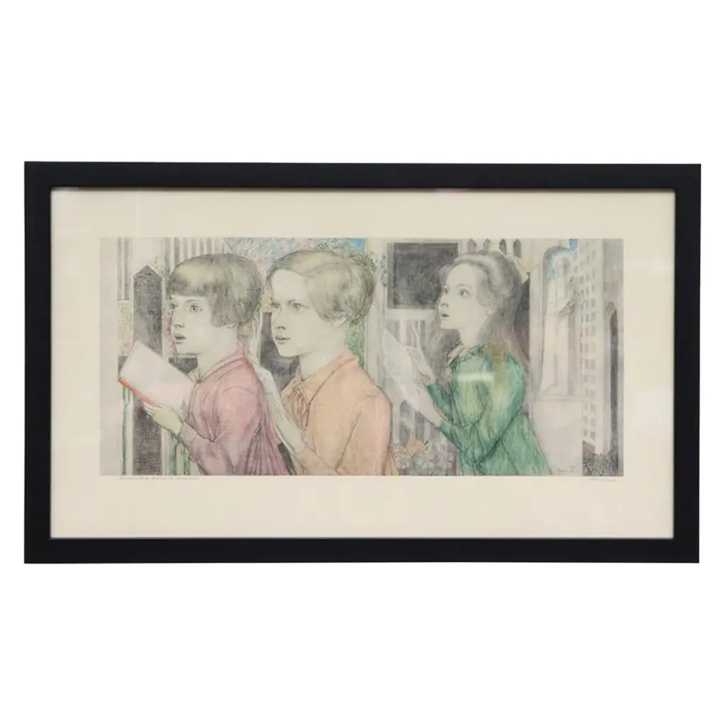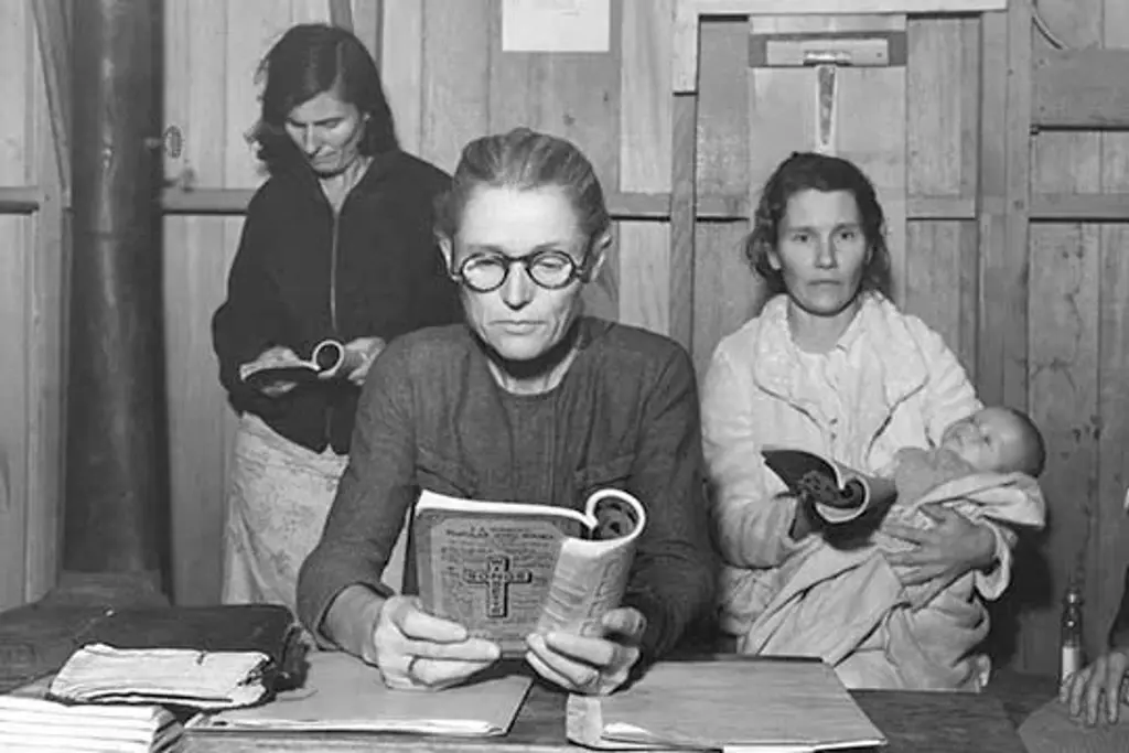Singing hymns before opening of meeting of Mothers' Club at Arvin Farm Security Administration (FSA) camp for migrants, California
