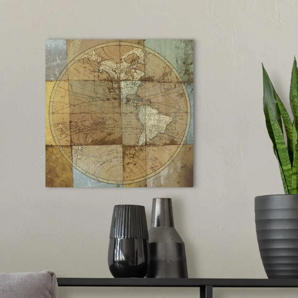 Mixed media artwork with the image of a globe with continents, gridlines, and longitude and latitude overlaying a painting of distressed square tiles.