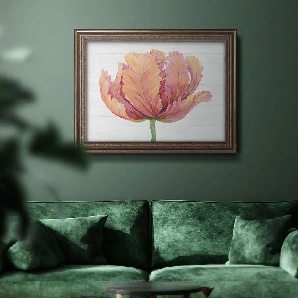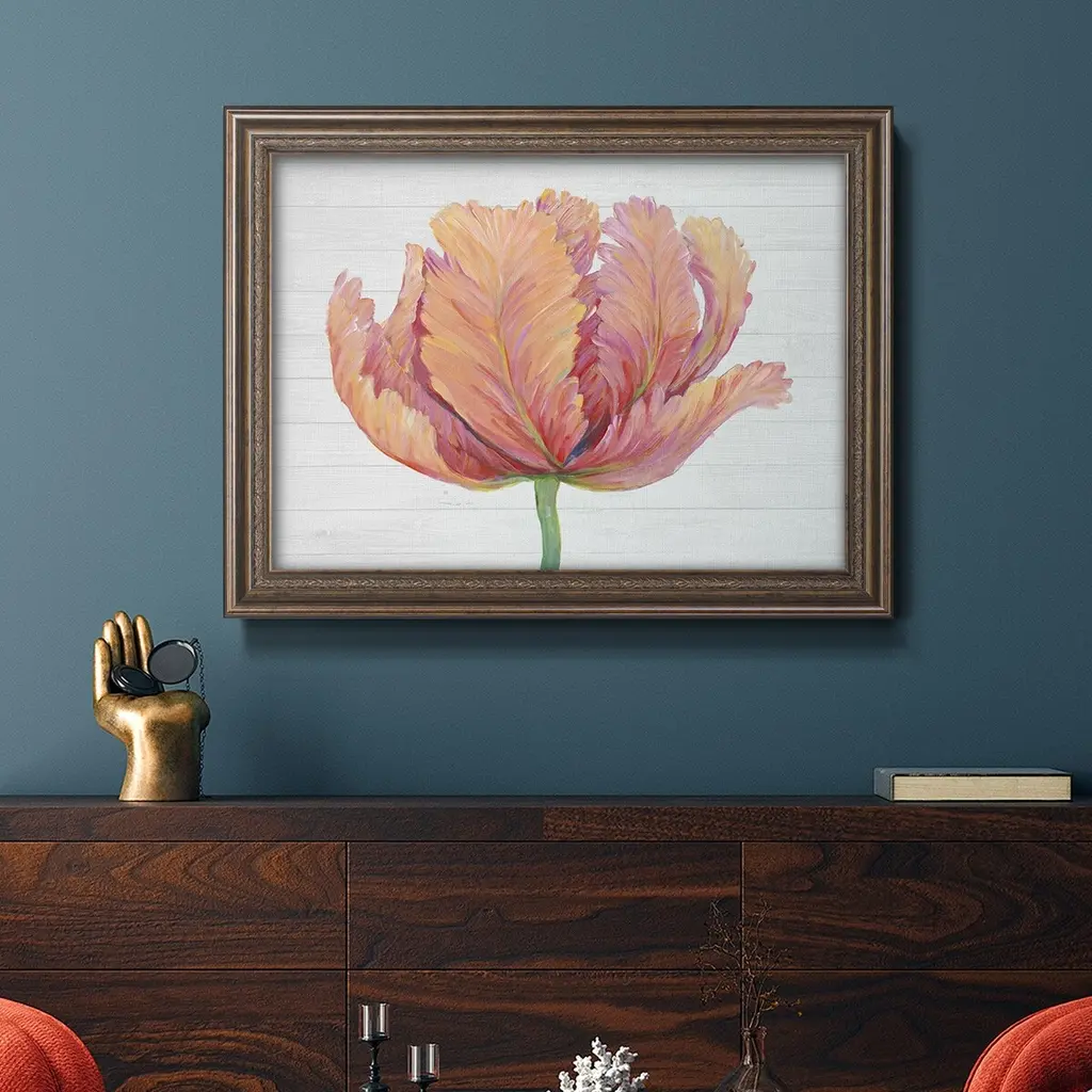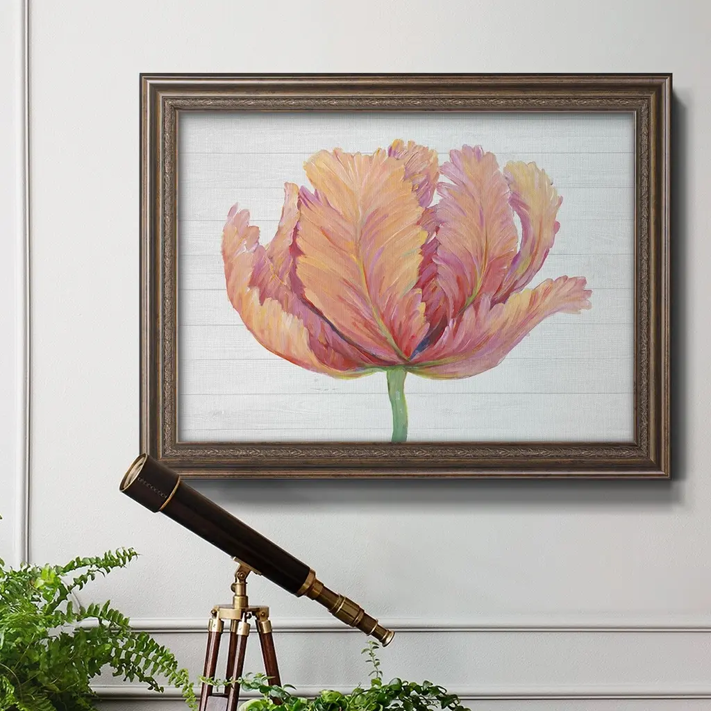Single Pink Bloom I Premium Framed Canvas- Ready to Hang A Premium Framed Canvas created to last. Framed in distressed wood and available in an array of sizes and colors Featuring a beveled a solid wood stretcher bar, each piece comes ready to hand 3 SIZES AVAILABLE 16''X20'' - Overall Size 18'X27'' - Overall Size 24''x36'' - Overall Size Each piece is made to order. Each piece comes with hanging hardware. Made in the USA Ready to Hang Giclee Paper Print Acrylic Glass Beveled Matt Board