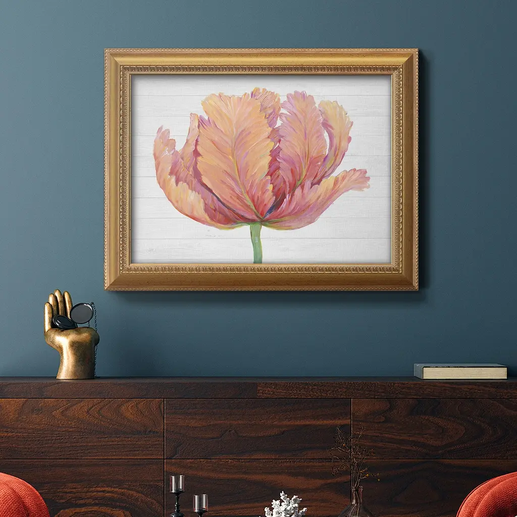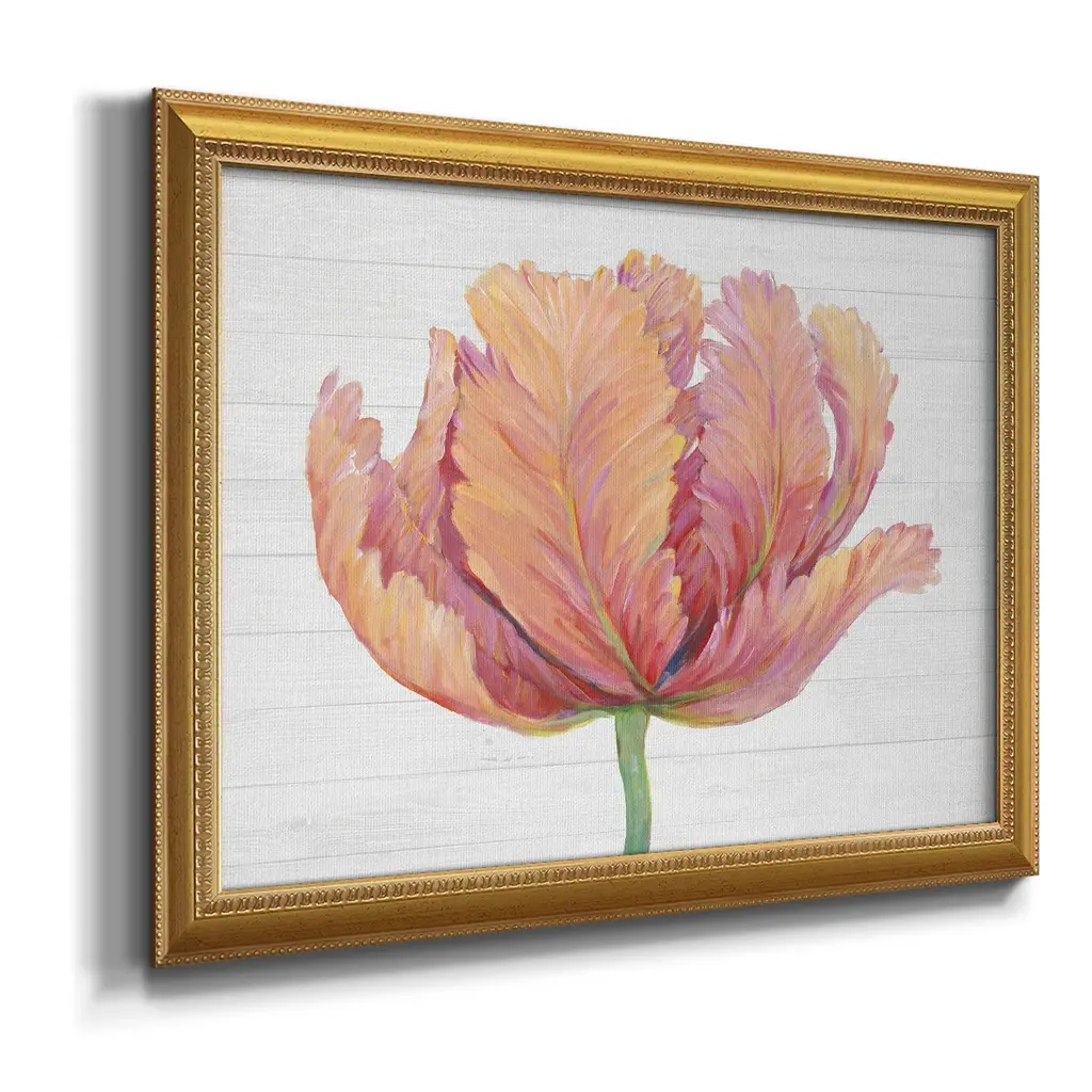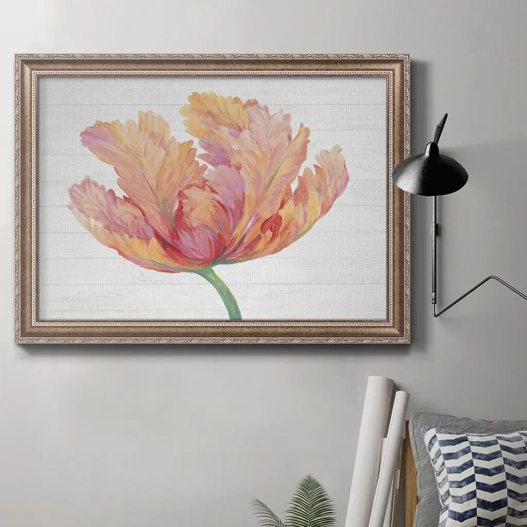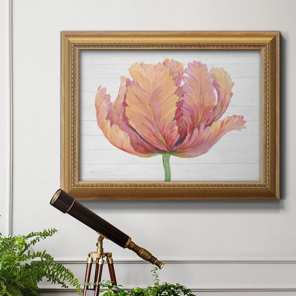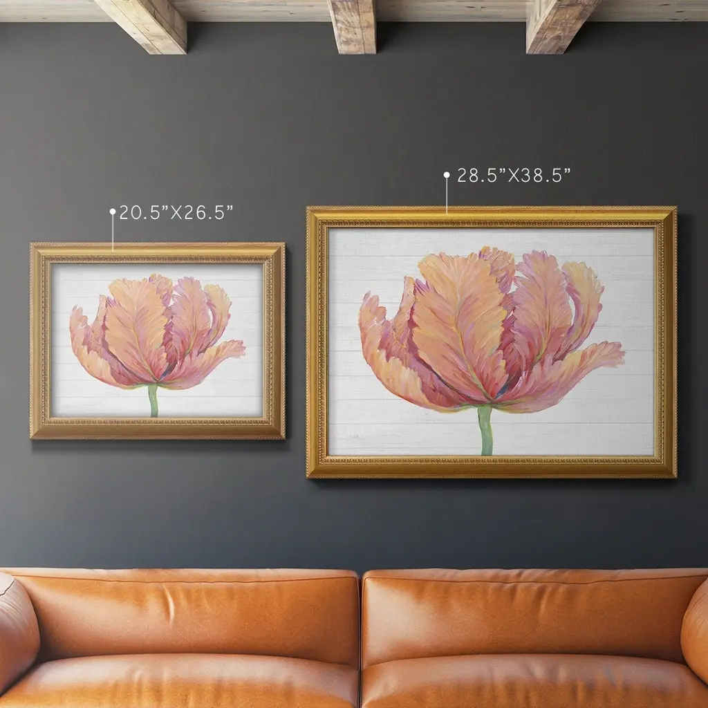 Single Pink Bloom I Premium Framed Canvas- Ready to Hang A Premium Framed Canvas created to last. Framed in distressed wood and available in an array of sizes and colors Featuring a beveled a solid wood stretcher bar, each piece comes ready to hand 3 SIZES AVAILABLE 16''X20'' - Overall Size 18'X27'' - Overall Size 24''x36'' - Overall Size Each piece is made to order. Each piece comes with hanging hardware. Made in the USA Ready to Hang Giclee Paper Print Acrylic Glass Beveled Matt Board