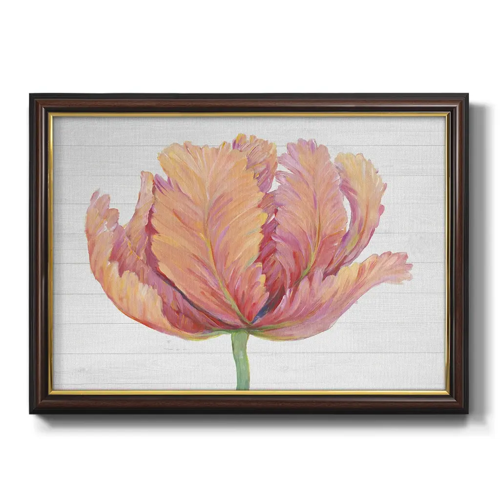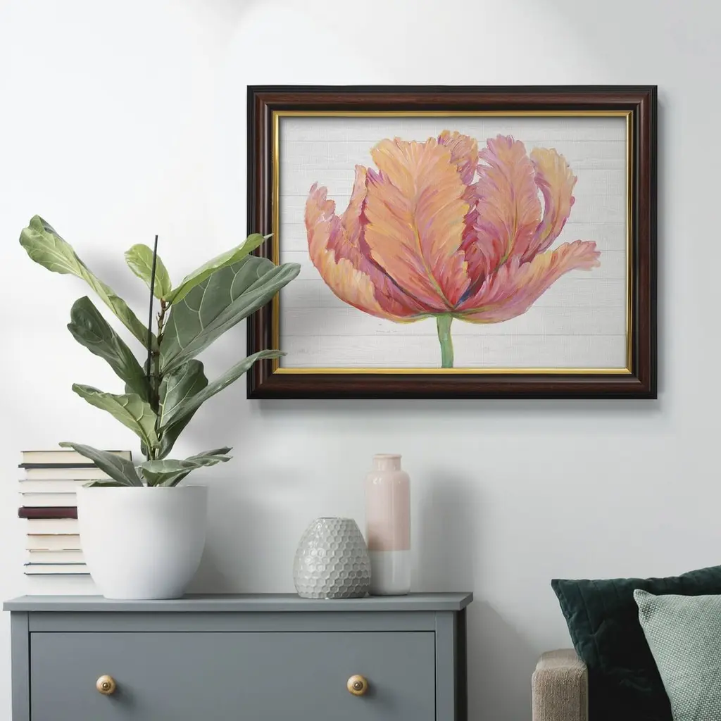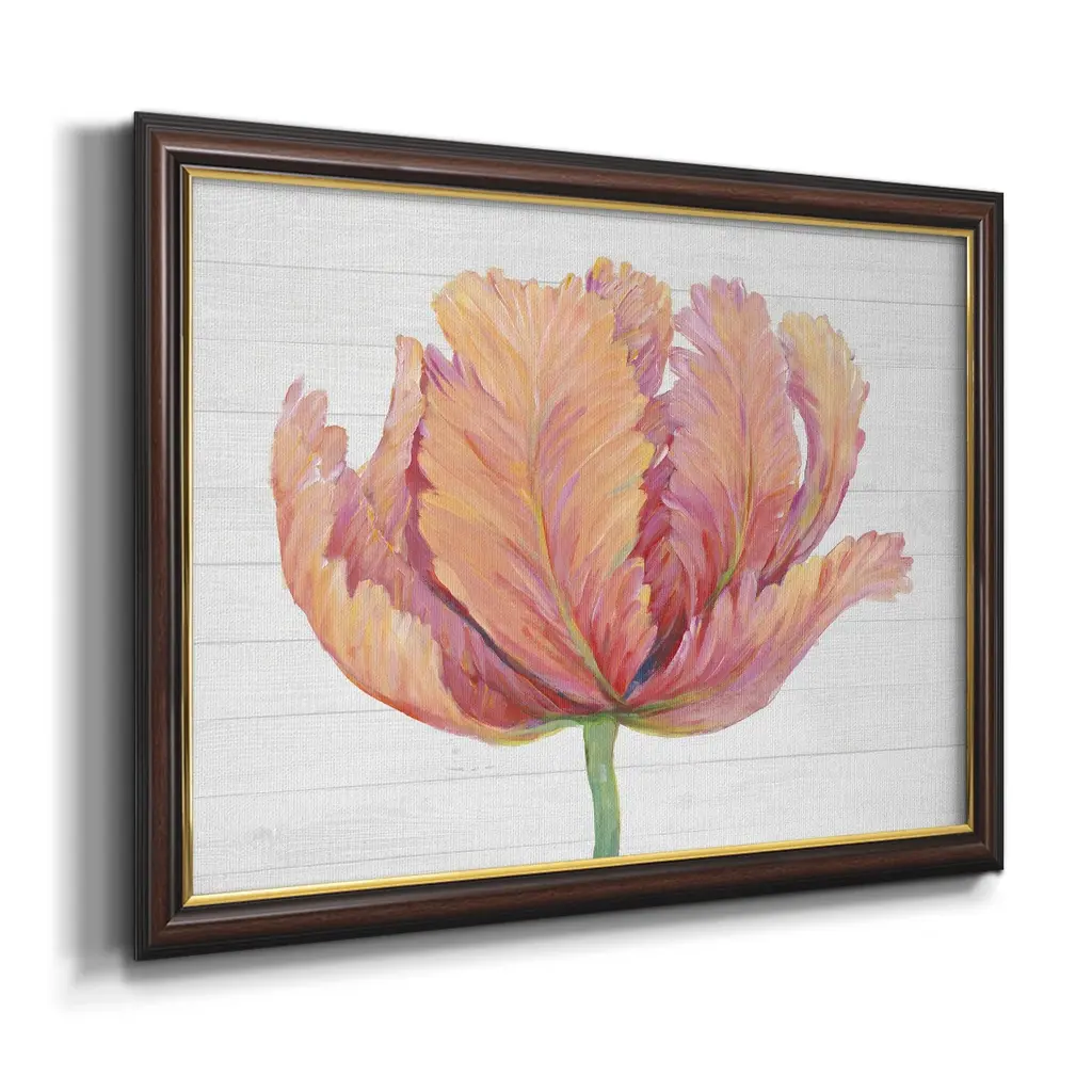 Single Pink Bloom I Premium Framed Canvas- Ready to Hang A Premium Framed Canvas created to last. Framed in distressed wood and available in an array of sizes and colors Featuring a beveled a solid wood stretcher bar, each piece comes ready to hand 3 SIZES AVAILABLE 16''X20'' - Overall Size 18'X27'' - Overall Size 24''x36'' - Overall Size Each piece is made to order. Each piece comes with hanging hardware. Made in the USA Ready to Hang Giclee Paper Print Acrylic Glass Beveled Matt Board