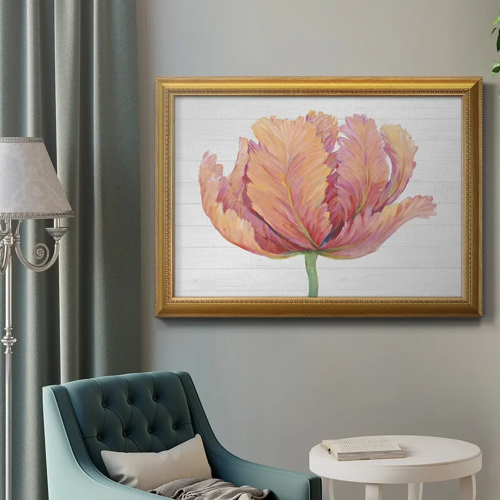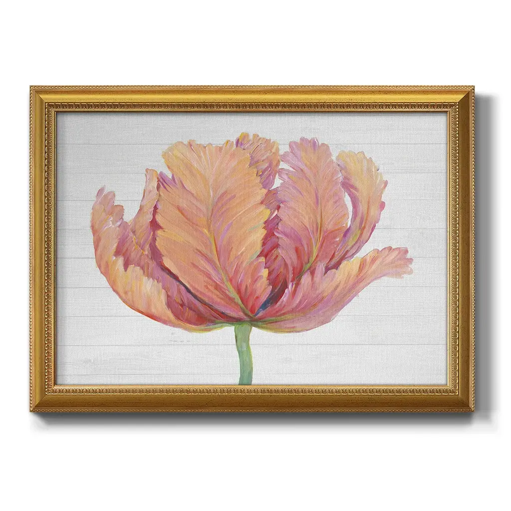 Single Pink Bloom I Premium Framed Canvas- Ready to Hang A Premium Framed Canvas created to last. Framed in distressed wood and available in an array of sizes and colors Featuring a beveled a solid wood stretcher bar, each piece comes ready to hand 3 SIZES AVAILABLE 16''X20'' - Overall Size 18'X27'' - Overall Size 24''x36'' - Overall Size Each piece is made to order. Each piece comes with hanging hardware. Made in the USA Ready to Hang Giclee Paper Print Acrylic Glass Beveled Matt Board