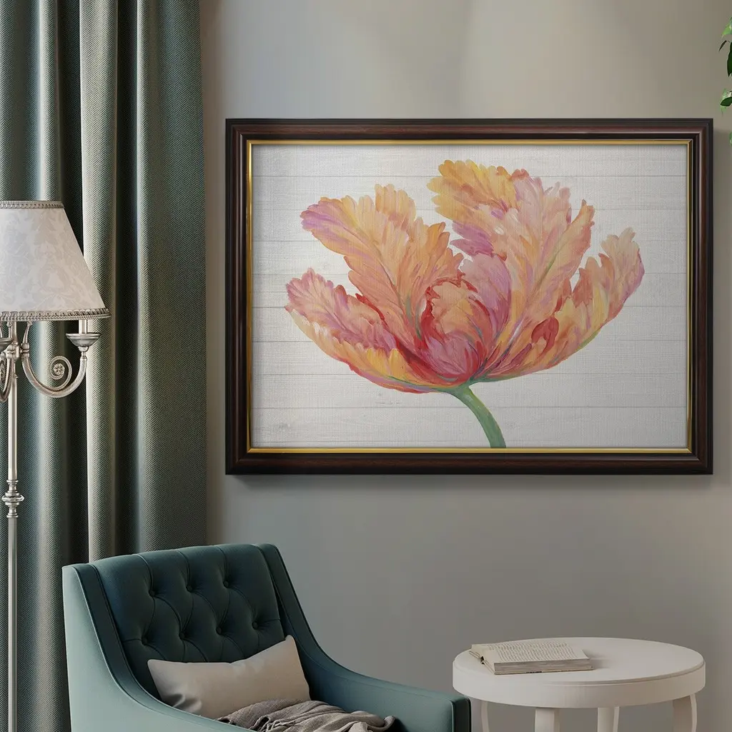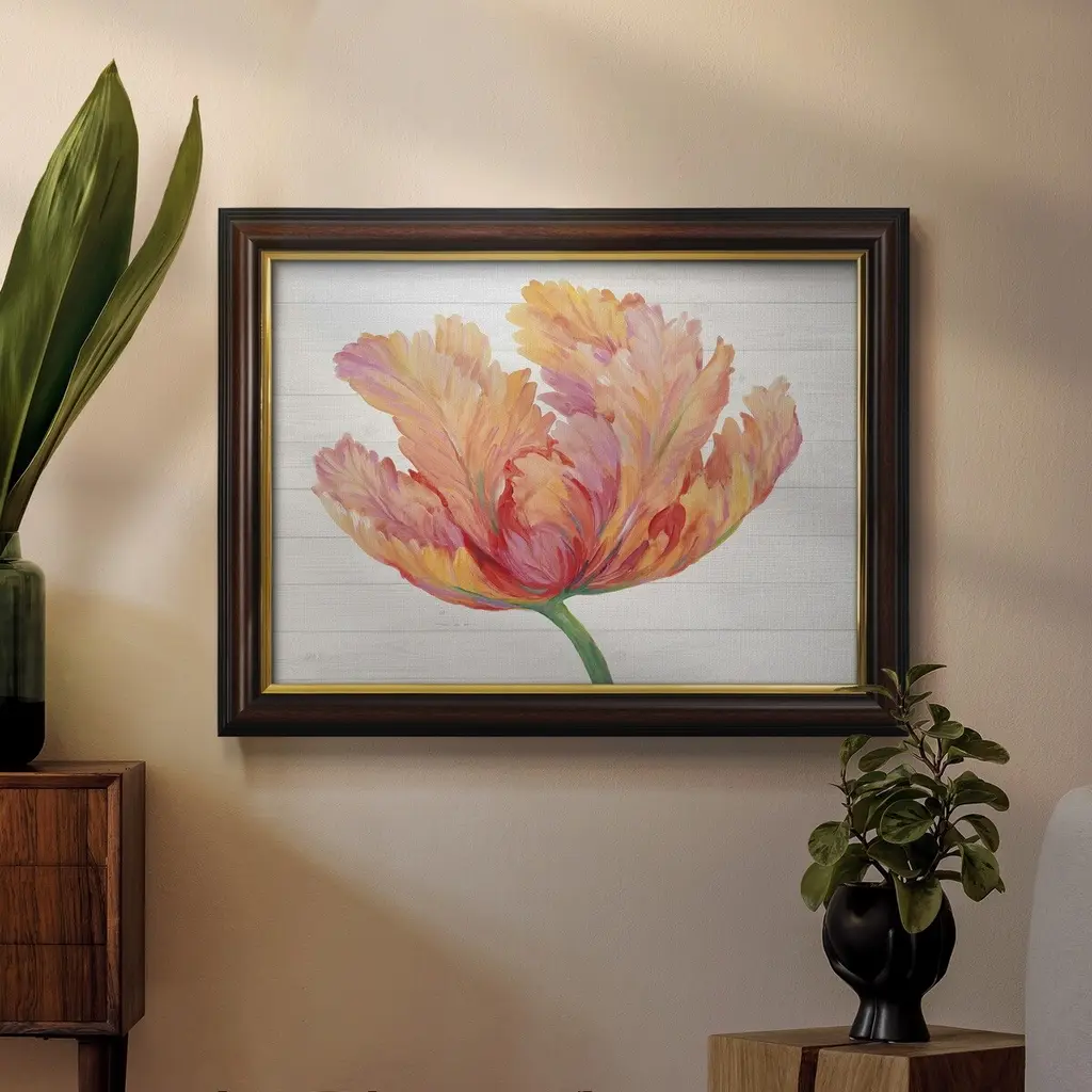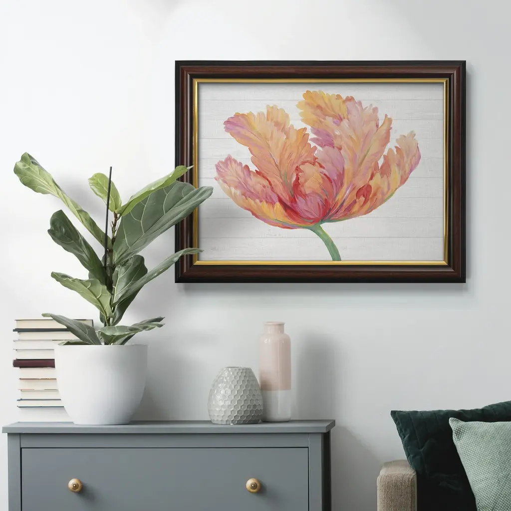 Single Pink Bloom II Premium Framed Canvas- Ready to Hang A Premium Framed Canvas created to last. Framed in distressed wood and available in an array of sizes and colors Featuring a beveled a solid wood stretcher bar, each piece comes ready to hand 3 SIZES AVAILABLE 16''X20'' - Overall Size 18'X27'' - Overall Size 24''x36'' - Overall Size Each piece is made to order. Each piece comes with hanging hardware. Made in the USA Ready to Hang Giclee Paper Print Acrylic Glass Beveled Matt Board