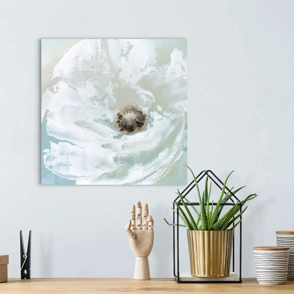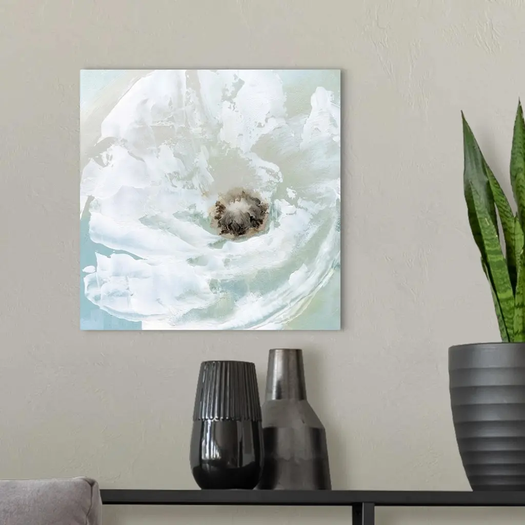 Contemporary painting of a close up view of a white poppy flower with a pale blue background.