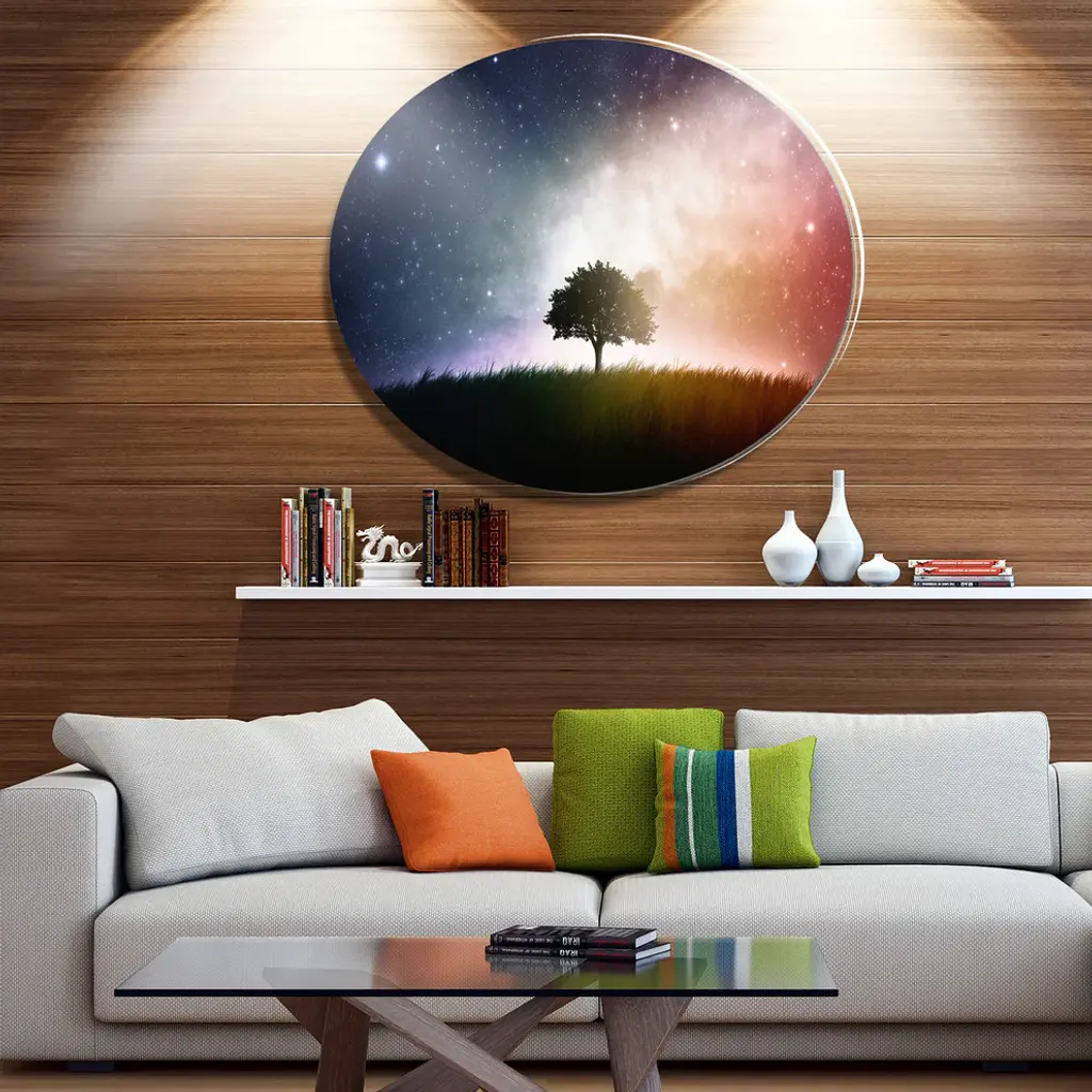 Bring Contemporary Abstraction to your home with this large Circle Metal wall art. This Single Tree Space Background Metal Artwork makes it the focal point of any room or office. - White Gloss Coating ensures colors are extra vibrant with light reflection.- Aluminum grade Sheet Metal with 1 inch mounting frame on the back giving the illusion that the artwork is floating on the wall..- Mounting Brackets are included along with instructions.- High Quality Digital images are created directly into a glossy aluminum panel producing a stunning and captivating print into the glossy finish of the metal.- Water, Fire and Scratch resistant HD Aluminum panels.- Looks better than any photo paper and guaranteed to last at least 20 years- Easy to clean with a microfiber cloth. Colors are far superior to regular Canvas Art. - Easy to Hang