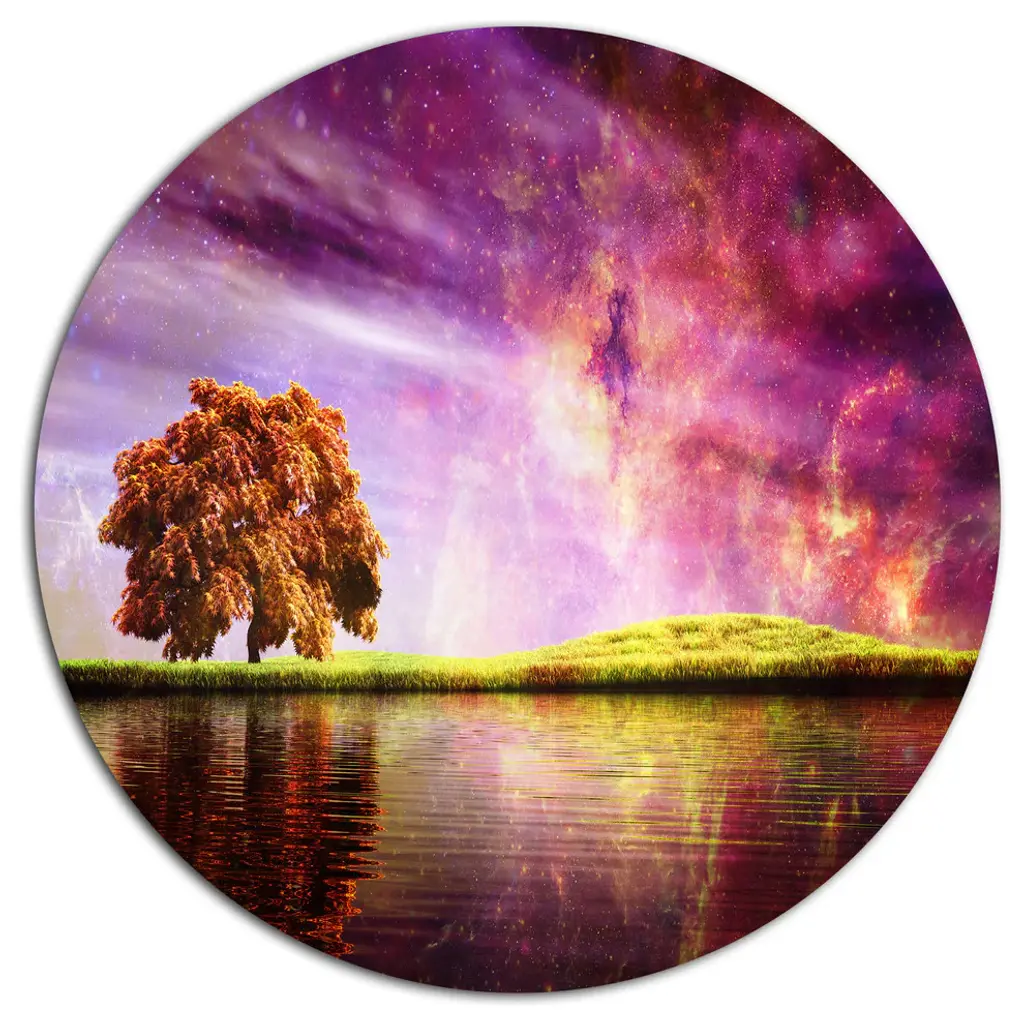 Bring Contemporary Abstraction to your home with this large Circle Metal wall art. This Single Tree Space Background Metal Artwork makes it the focal point of any room or office. - White Gloss Coating ensures colors are extra vibrant with light reflection.- Aluminum grade Sheet Metal with 1 inch mounting frame on the back giving the illusion that the artwork is floating on the wall..- Mounting Brackets are included along with instructions.- High Quality Digital images are created directly into a glossy aluminum panel producing a stunning and captivating print into the glossy finish of the metal.- Water, Fire and Scratch resistant HD Aluminum panels.- Looks better than any photo paper and guaranteed to last at least 20 years- Easy to clean with a microfiber cloth. Colors are far superior to regular Canvas Art. - Easy to Hang