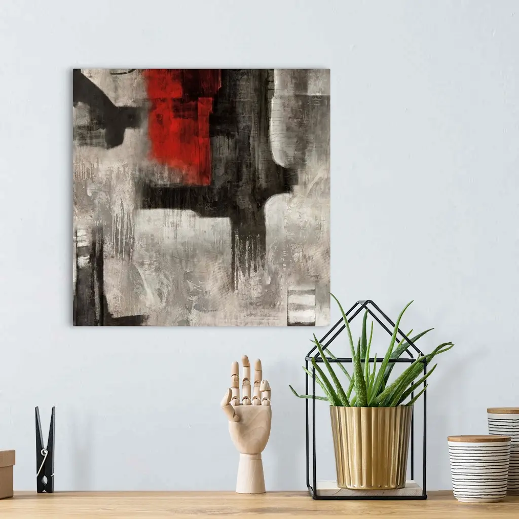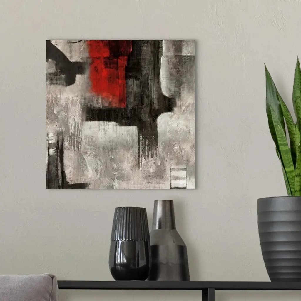 Square abstract painting with bold black and red brushstrokes on top of a white and gray background.