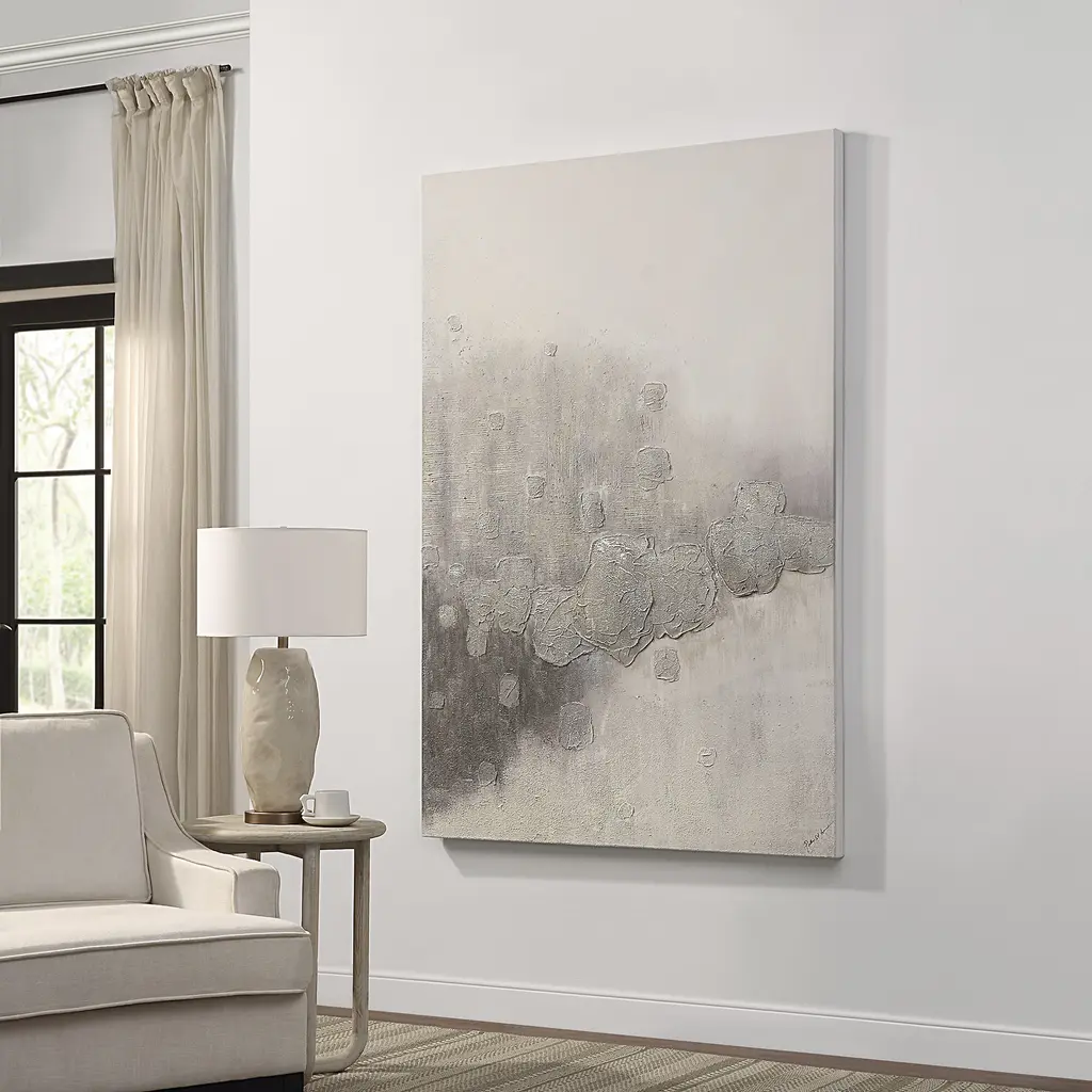 With soft, smooth hand-painted brush strokes creating a cloud-like visual, this art painting exudes ethereal energy. Well-suited for styling in classic and contemporary bedrooms for all ages, it is best complemented by contrasting hues of a significantly lighter or darker variety. One can choose to bring more drama to this piece of canvas art by adding a frame or maintain its calming appeal with a frame-free placement.