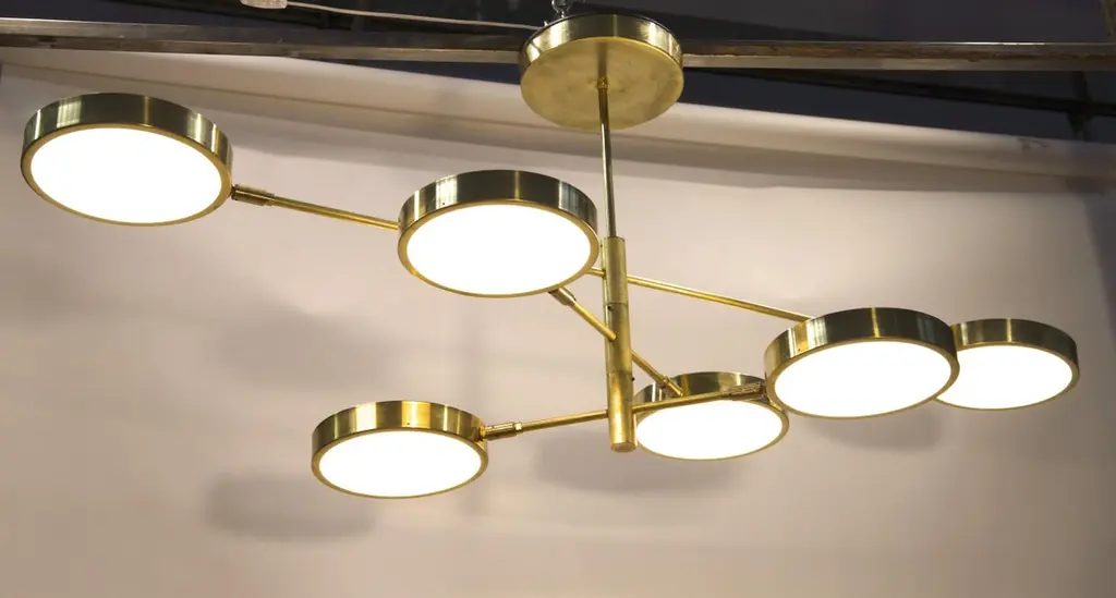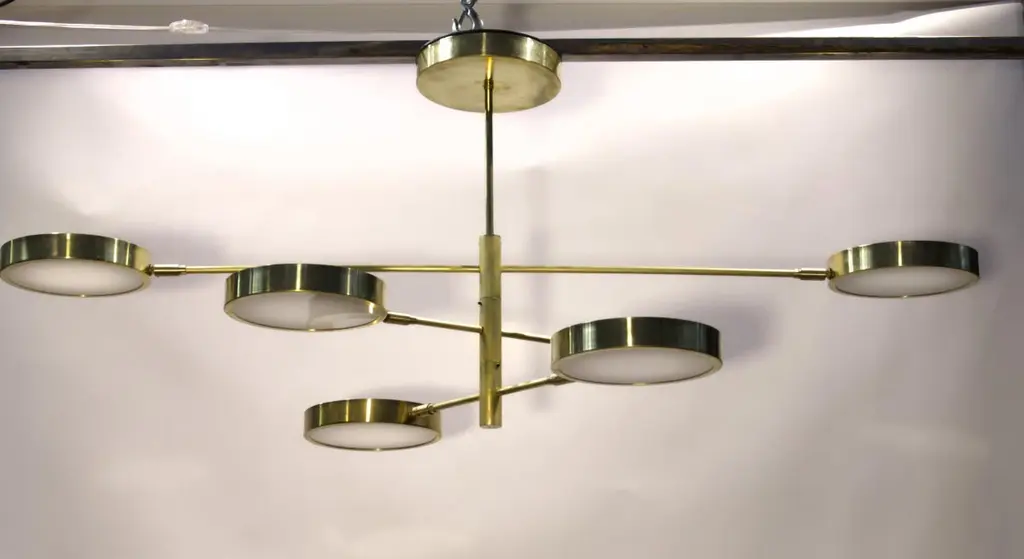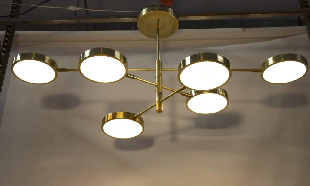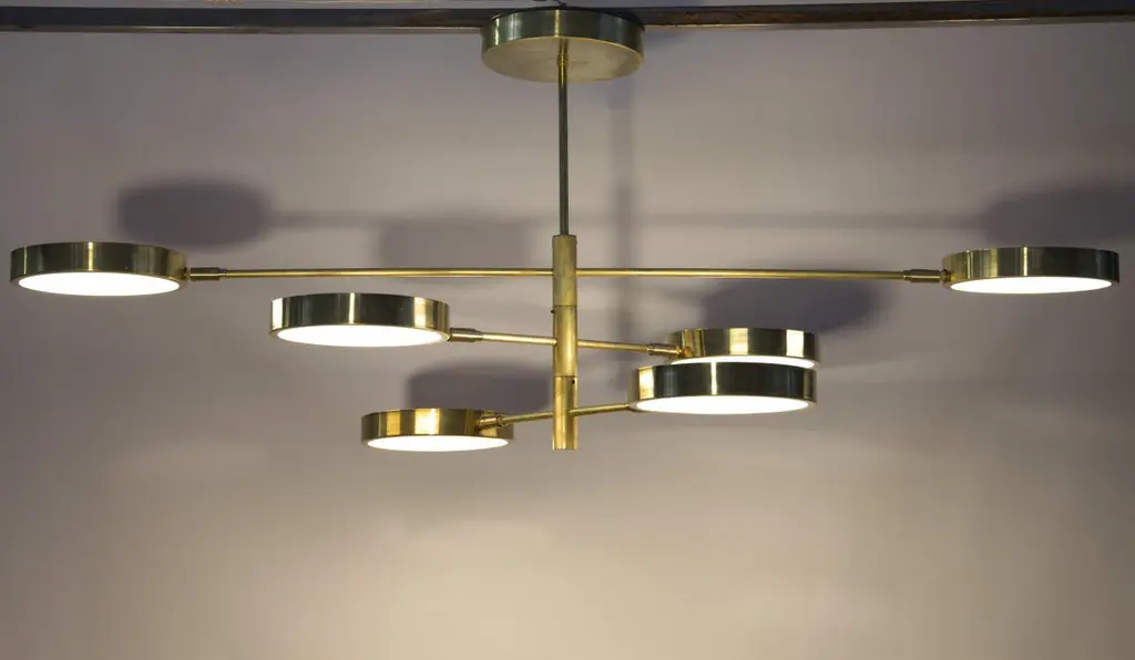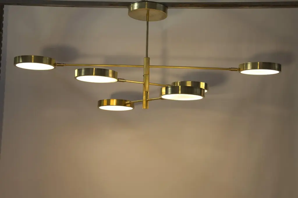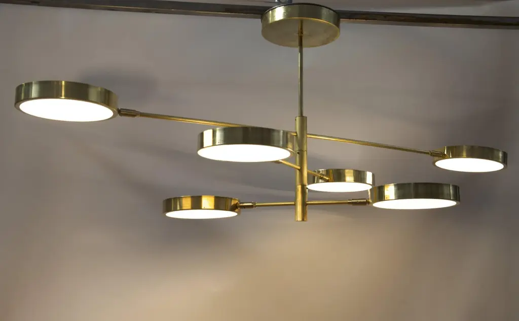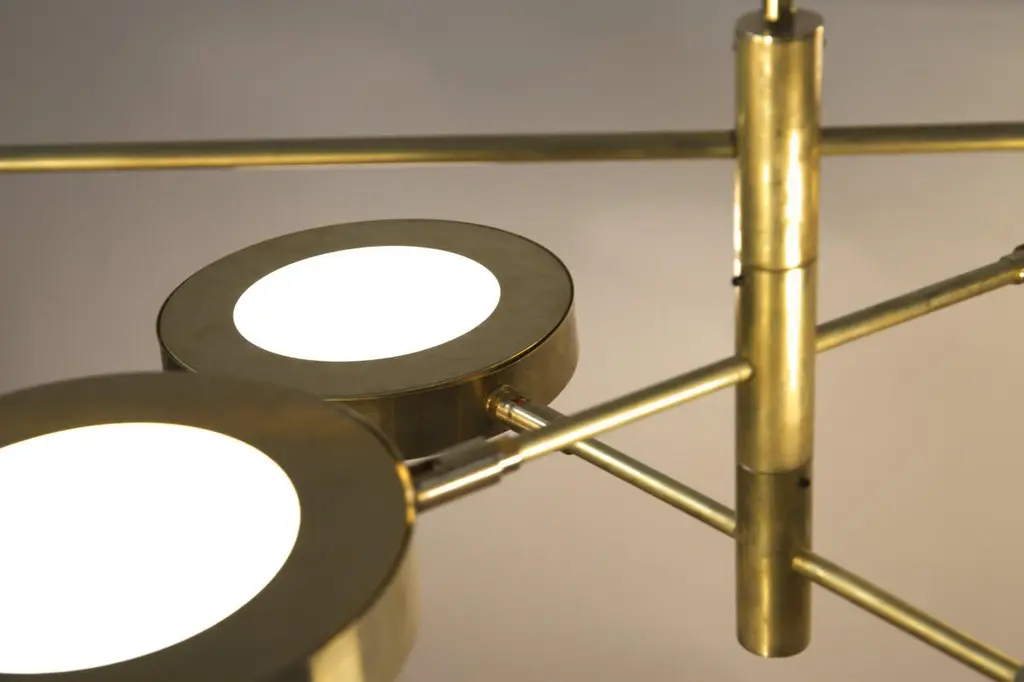 This chandelier uses an ingenious rotating stem structure and features a shallow drum-shaped shade at the end of each arm.The chandelier arms are designed with two lengths so that each can be staggered at different angles. They work well in any space and suit both regular and low-ceilinged rooms wonderfully.This is the medium Sistema chandelier, with 3 arms and 6 shades. Ideal for an oval or long dining table. It works well also over an island.The result is uniform lighting from above the dining table. There is nothing else like this on the market. There are beautiful chandeliers available, but they always tend to give out too much light in the center and too little at either side.Each shade has two LED strips that can be lit separately. In this way you can have either a regular light or a stronger light depending on how you need to use the chandelier. The LEDs are top quality with a CRI of over 80. This ensures that the natural color of food and people can be seen perfectly. See the next to last photo, where there is some fruit and a color chart below the chandelier.The LEDs are on a 24V direct current feed, so there is no flickering.The arms can rotate 180 degrees, for many possible combinations. See the drawing for the two regular positions. The chandelier can also be rotated when it is lit.The shades can be rotated on the arm axis to meet any lighting needs in a living room (paintings, bookshelves etc.). The shades have neutral white glass fixtures. Please see the photos.On the back there is a smaller Lucite opening for giving ambient light.The chandelier has the ingenious brass finishes of the orbitale collection.This listing shows measurements for a dining table and the smallest drop. A change of drop is complimentary.Please see the last image for all sizes and ask for high resolution technical drawings if you need them.Please see the drawing to get an idea of sizes for the different chandeliers. On the upper side of each disc there is a smaller opening to provide ambient light.Top-quality LEDs with over 80 CRI, meaning that the lighting does not alter the color of food and people.The LEDs are on a 24V direct current feed, so there is no flickering. The arms can be rotated 180 degrees to configure various combinations. As well as two rows of evenly-spaced lights over a dining table, a regular 8-shade star or 4-shade star (see photos) are possible, as well as creative sculptural shapes. The arms can be rotated even when the chandelier is lit.The shades can also be rotated on the arm axis to meet any lighting needs in a living room (paintings, bookshelves etc.).This listing shows the smallest drop. A change of drop is complimentary.Silvio Piattelli copyright and design.Specifications (Note: The Sistema chandelier has glass shades, while Sistema Solare has onyx shades).LED source:LED strip based on the new, reliable 2835 chip. UL-CE listed.The lumen/watt rate is 170. The CRI is above 80 and 3000 Kelvins.Each shade has a light output of 13.75 W/ 2312.50 lumens.Sistema/Sistema Solare 8 lights: 110 W and 18,500 lumens.Sistema/Sistema Solare 6 lights: 82.5 W and 13,875 lumens.Sistema/Sistema Solare 4 lights: 55 W and 9,250 lumensNote: The geometry of the shades means that the lumen output is approximately -25% for Sistema and -45% for Sistema Solare (onyx). Sistema Solare has an effective color temperature of around 2400 Kelvins due to the onyx.Driver: US 120 VAC standard driver: 120 W TRIAC dimmable UL listed. Flicker Free PWM, California compliant, 400 HertzEEC 220 VAC standard driver is 150 W TRIAC dimmable TUV SELV CE listed. Flicker Free.