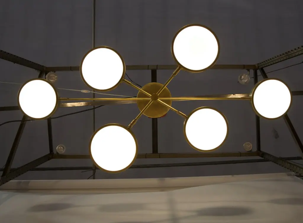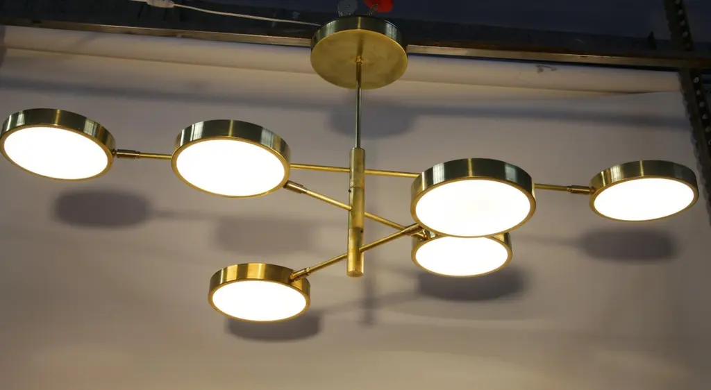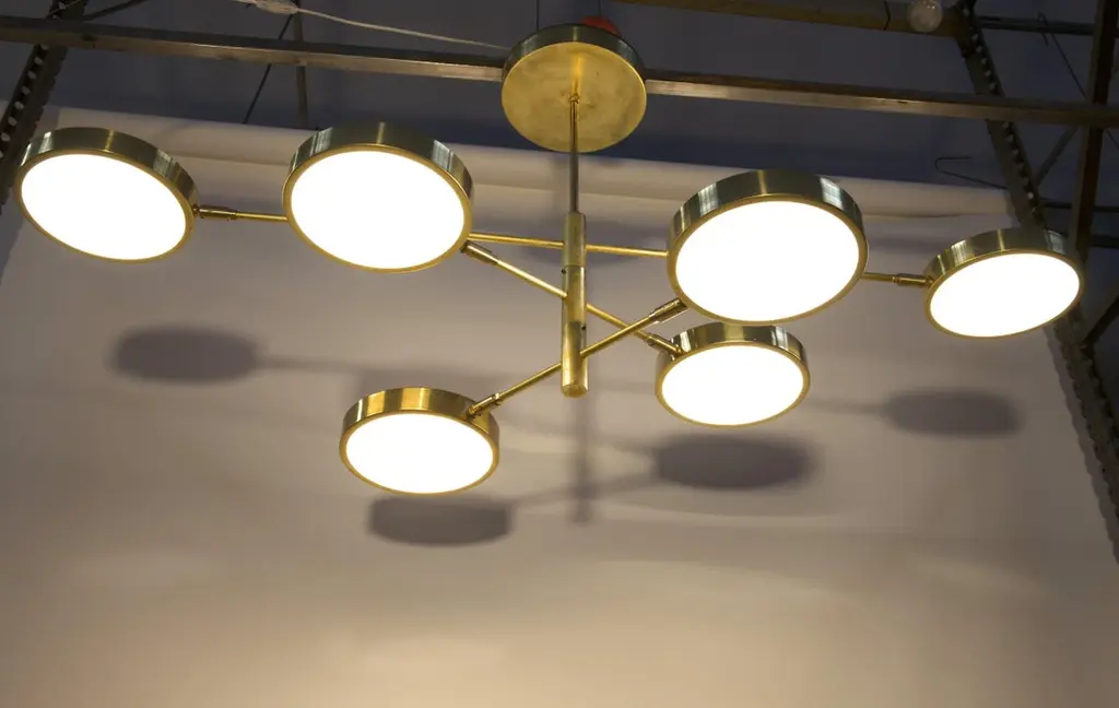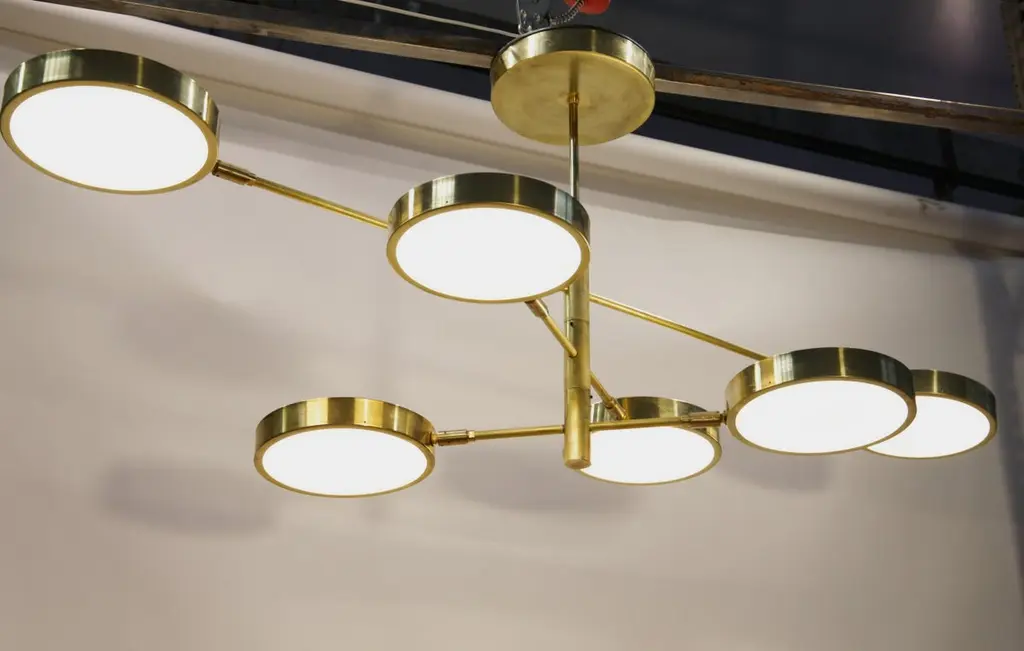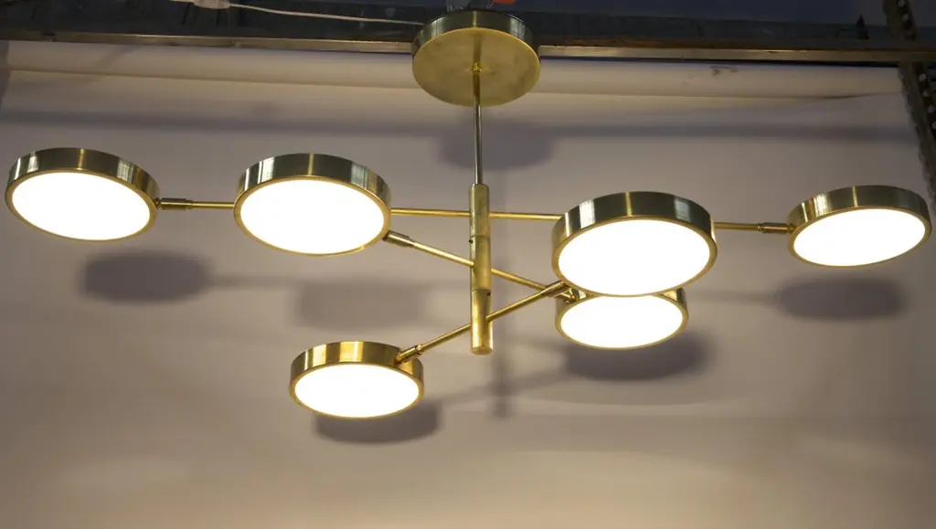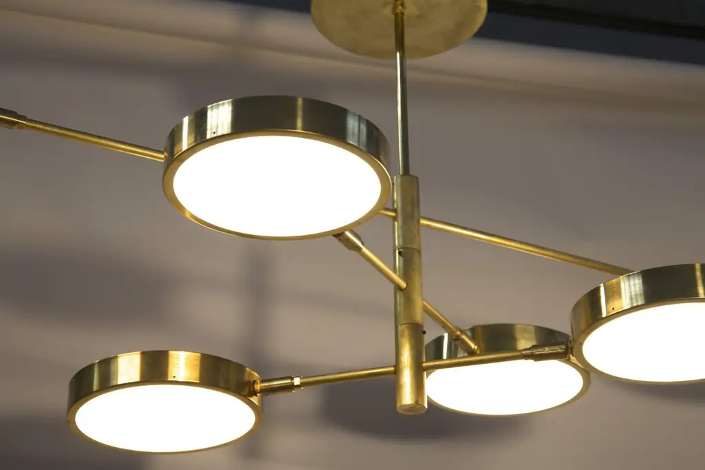 This chandelier uses an ingenious rotating stem structure and features a shallow drum-shaped shade at the end of each arm.The chandelier arms are designed with two lengths so that each can be staggered at different angles. They work well in any space and suit both regular and low-ceilinged rooms wonderfully.This is the medium Sistema chandelier, with 3 arms and 6 shades. Ideal for an oval or long dining table. It works well also over an island.The result is uniform lighting from above the dining table. There is nothing else like this on the market. There are beautiful chandeliers available, but they always tend to give out too much light in the center and too little at either side.Each shade has two LED strips that can be lit separately. In this way you can have either a regular light or a stronger light depending on how you need to use the chandelier. The LEDs are top quality with a CRI of over 80. This ensures that the natural color of food and people can be seen perfectly. See the next to last photo, where there is some fruit and a color chart below the chandelier.The LEDs are on a 24V direct current feed, so there is no flickering.The arms can rotate 180 degrees, for many possible combinations. See the drawing for the two regular positions. The chandelier can also be rotated when it is lit.The shades can be rotated on the arm axis to meet any lighting needs in a living room (paintings, bookshelves etc.). The shades have neutral white glass fixtures. Please see the photos.On the back there is a smaller Lucite opening for giving ambient light.The chandelier has the ingenious brass finishes of the orbitale collection.This listing shows measurements for a dining table and the smallest drop. A change of drop is complimentary.Please see the last image for all sizes and ask for high resolution technical drawings if you need them.Please see the drawing to get an idea of sizes for the different chandeliers. On the upper side of each disc there is a smaller opening to provide ambient light.Top-quality LEDs with over 80 CRI, meaning that the lighting does not alter the color of food and people.The LEDs are on a 24V direct current feed, so there is no flickering. The arms can be rotated 180 degrees to configure various combinations. As well as two rows of evenly-spaced lights over a dining table, a regular 8-shade star or 4-shade star (see photos) are possible, as well as creative sculptural shapes. The arms can be rotated even when the chandelier is lit.The shades can also be rotated on the arm axis to meet any lighting needs in a living room (paintings, bookshelves etc.).This listing shows the smallest drop. A change of drop is complimentary.Silvio Piattelli copyright and design.Specifications (Note: The Sistema chandelier has glass shades, while Sistema Solare has onyx shades).LED source:LED strip based on the new, reliable 2835 chip. UL-CE listed.The lumen/watt rate is 170. The CRI is above 80 and 3000 Kelvins.Each shade has a light output of 13.75 W/ 2312.50 lumens.Sistema/Sistema Solare 8 lights: 110 W and 18,500 lumens.Sistema/Sistema Solare 6 lights: 82.5 W and 13,875 lumens.Sistema/Sistema Solare 4 lights: 55 W and 9,250 lumensNote: The geometry of the shades means that the lumen output is approximately -25% for Sistema and -45% for Sistema Solare (onyx). Sistema Solare has an effective color temperature of around 2400 Kelvins due to the onyx.Driver: US 120 VAC standard driver: 120 W TRIAC dimmable UL listed. Flicker Free PWM, California compliant, 400 HertzEEC 220 VAC standard driver is 150 W TRIAC dimmable TUV SELV CE listed. Flicker Free.