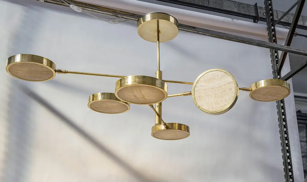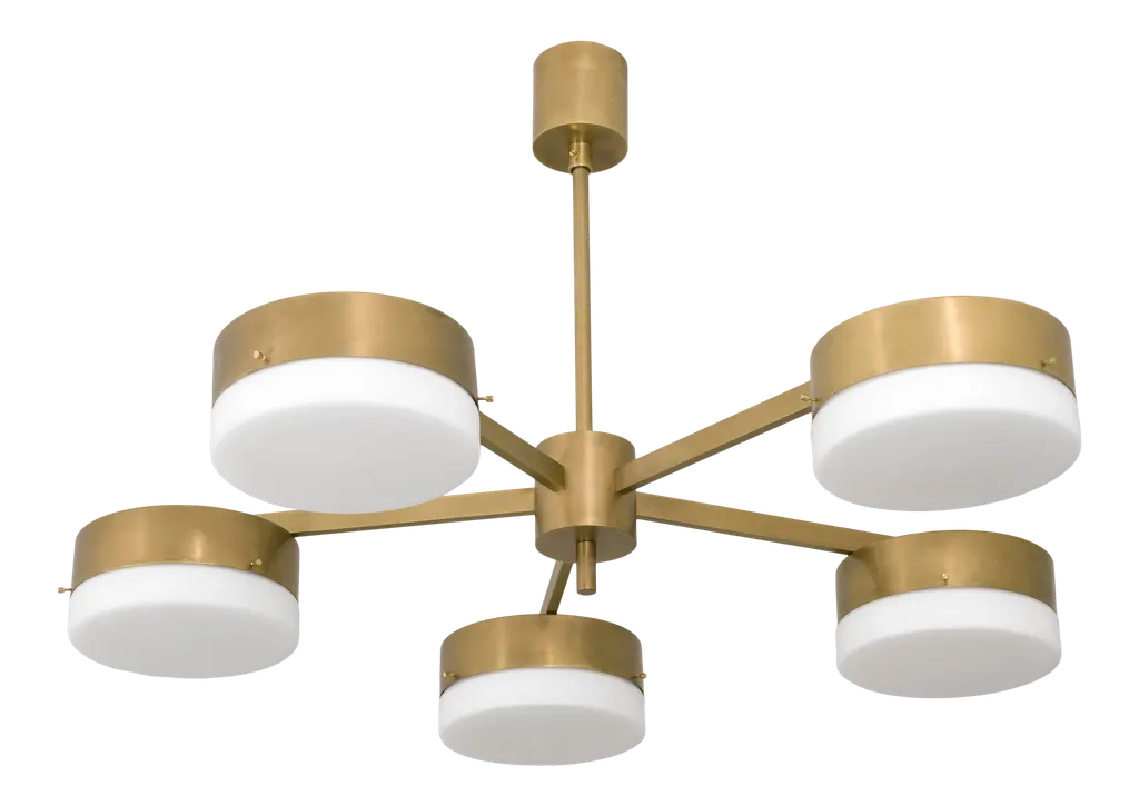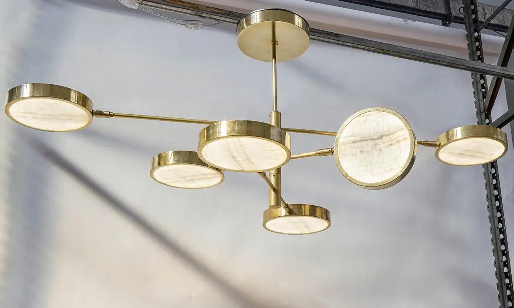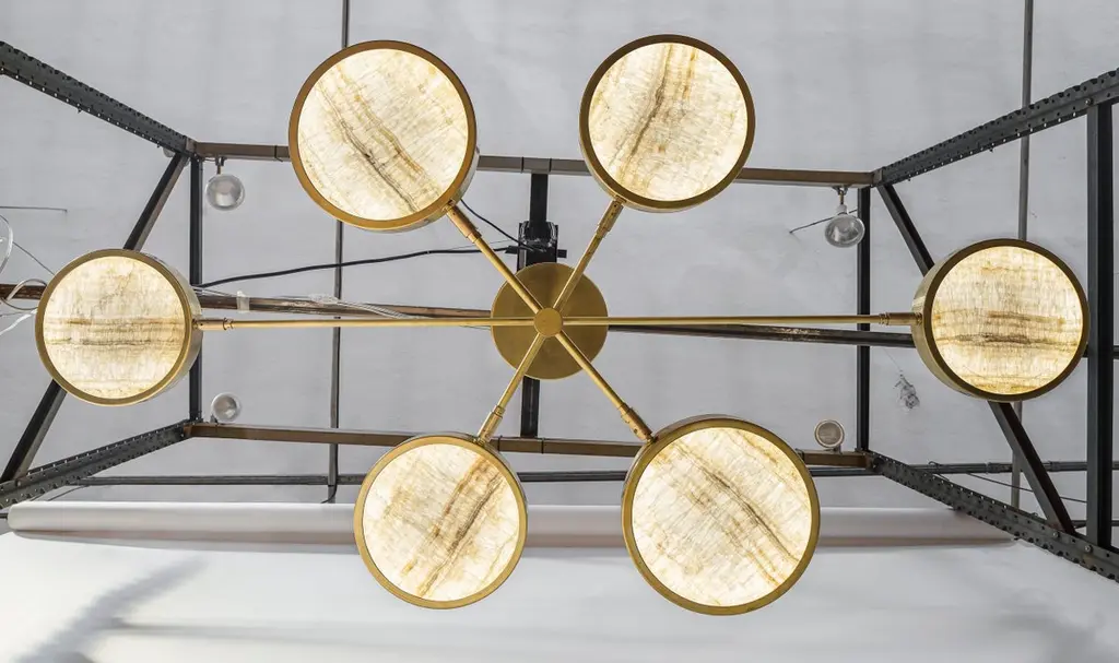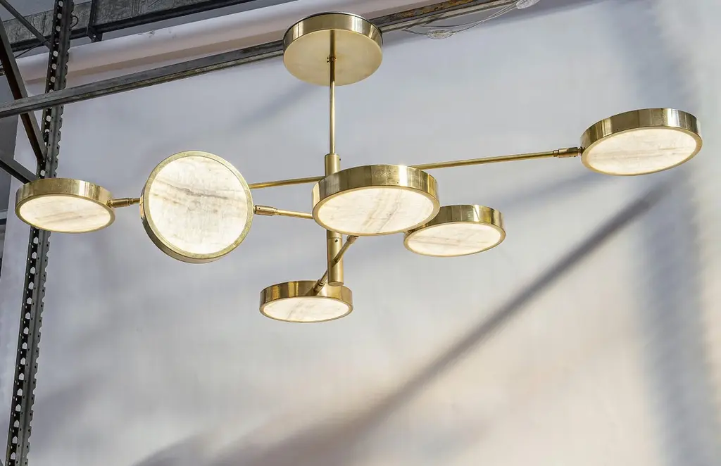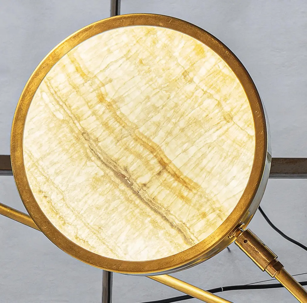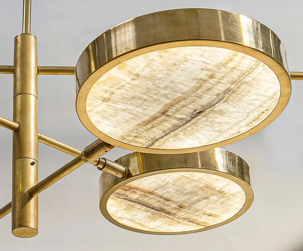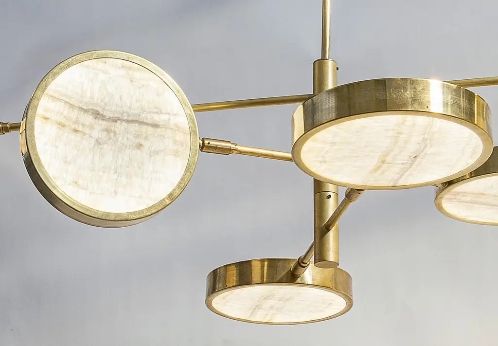 Unique chandelier, made from thinly-cut pieces of exquisite ivory-toned translucent onyx. Ideal to be hung over a table, with versatile configurations.Ivory onyx comes from Middle Eastern quarries and has a unique veining. This translucent stone is carefully worked in Italy, and was chosen because of its combination of interesting patterns, high translucency, and the way it makes the light output look warmer.The 6-shade version is ideal to be hung over an oval dining table.Our onyx supplier has worked in many high-end architectural projects, and these same materials have been used at the Armani hotel in Milan. When he was shown the chandelier designs, he rose to the challenge and adapted his tooling to make us perfect round discs. He worked hard to find exactly the right thickness that would keep the depth of the texture. It could not be too thick, otherwise it would lose transparency. And too thin, it would look like it was printed.The result is stunning. The combination of carefully-worked translucent stone and brass works perfectly, and the use of the ingenious Orbitale structure allows the geometry of the chandelier to be played with, and it can be configured in several ways.There is nothing else like this on the market.The Sistema collection uses a clever rotating stem structure and features a shallow drum-shaped shade at the end of each arm.The chandelier arms are designed with two lengths so that each can be staggered at different angles. They work well in any space and suit both regular and low-ceilinged rooms wonderfully.Please see the drawing to get an idea of sizes for the different chandeliers. On the upper side of each disc there is a smaller opening to provide ambient light.Top-quality LEDs with over 80 CRI, meaning that the lighting does not alter the color of food and people.The LEDs are on a 24V direct current feed, so there is no flickering. The arms can be rotated 180 degrees to configure various combinations. As well as two rows of evenly-spaced lights over a dining table, a regular 8-shade star or 4-shade star (see photos) are possible, as well as creative sculptural shapes. The arms can be rotated even when the chandelier is lit.The shades can also be rotated on the arm axis to meet any lighting needs in a living room (paintings, bookshelves etc.).This listing shows the smallest drop. A change of drop is complimentary.Silvio Piattelli copyright and design.Specifications (Note: The Sistema chandelier has glass shades, while Sistema Solare has onyx shades).LED source:LED strip based on the new, reliable 2835 chip. UL-CE listed.The lumen/watt rate is 170. The CRI is above 80 and 3000 Kelvins.Each shade has a light output of 13.75 W/ 2312.50 lumens.Sistema/Sistema Solare 8 lights: 110 W and 18,500 lumens.Sistema/Sistema Solare 6 lights: 82.5 W and 13,875 lumens.Sistema/Sistema Solare 4 lights: 55 W and 9,250 lumensNote: The geometry of the shades means that the lumen output is approximately -25% for Sistema and -45% for Sistema Solare (onyx). Sistema Solare has an effective color temperature of around 2400 Kelvins due to the onyx.Driver: US 120 VAC standard driver: 120 W TRIAC dimmable UL listed. Flicker Free PWM, California compliant, 400 HertzEEC 220 VAC standard driver is 150 W TRIAC dimmable TUV SELV CE listed. Flicker Free.