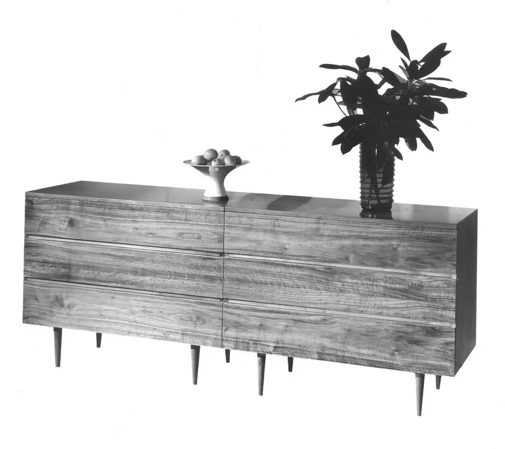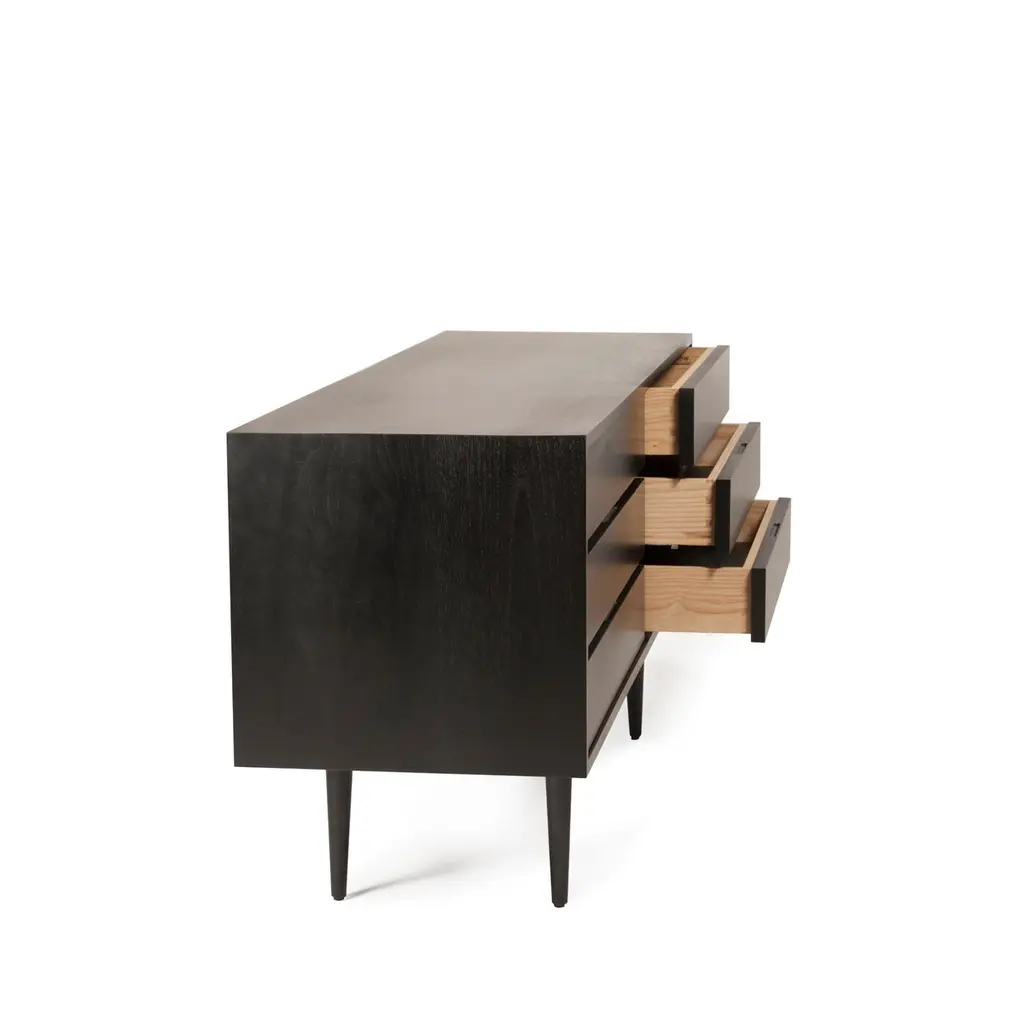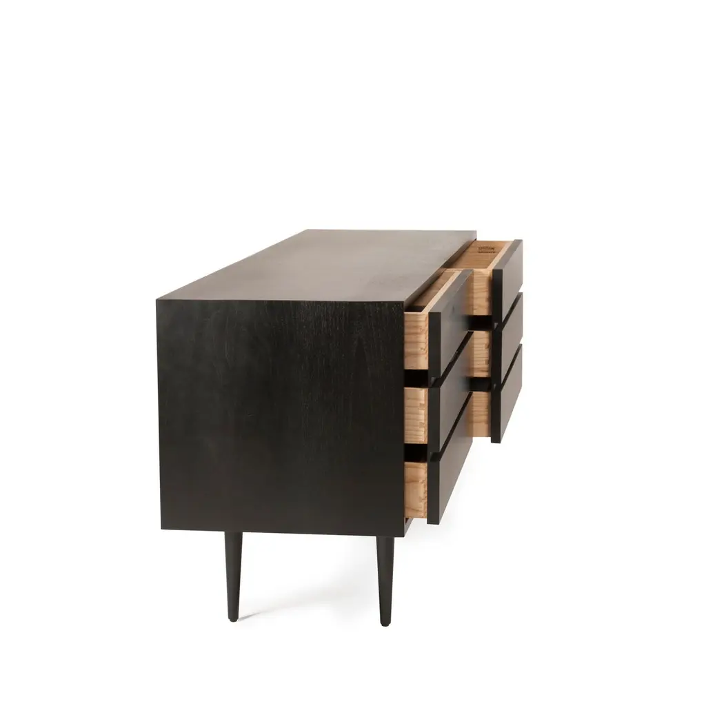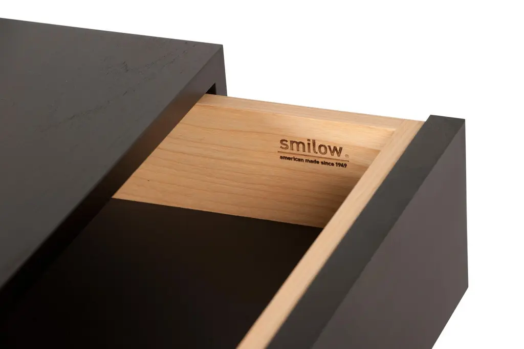 Originally designed by Mel Smilow in 1950 and officially reintroduced by his daughter Judy Smilow in 2017, the solid wood Six Drawer Dresser with leather-lined drawers has a beautifully finished front and back in ebonized walnut. The focal point of any mid-century modern home, its simplistic beauty, fine craftsmanship, and exceptional detail is present from every angle. Made in America since 1949 and made to last a lifetime, Smilow Furniture defines: Enduring Modern Classics.Measures: 65" w, 19" d, 28.5" hSmilow Design is a third-generation family-owned company, that continues a legacy of producing fine and timeless designs for Modern Living.Judy Smilow (1958–2018), designer and founder of Smilow Design LLC, grew up “modern” in a Frank Lloyd Wright cooperative community surrounded by her father’s artwork and furniture. Through the glass walls of her family home, she looked upon wooded surroundings and integrated architecture that would define her own design aesthetic: natural, simple, and modern.Her father, Mel Smilow (1922–2002) designed and retailed modern furnishings through his six independently owned stores from 1949 through the late 1970s. A champion of affordable, finely crafted, modern design—his work has been recognized and coveted by collectors and well appreciated by his loyal customers for over 50 years.Now, with the reintroduction of this authentic midcentury brand, handcrafted in America since 1949, the designs and manufacture prove to have truly stood the test of time. Still handcrafted in America, our products fit what Mel used to say about his furniture: enduring. Modern. Classic.It is with great privilege and pride that Judy’s Husband Steven Schoenfelder and children Maia and Aaron Schoenfelder continuing on as a family-owned business, producing beautiful, enduring, modern design for a new generation of customers.