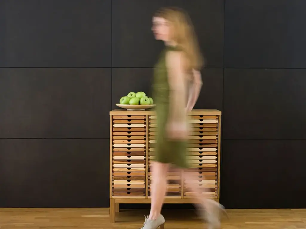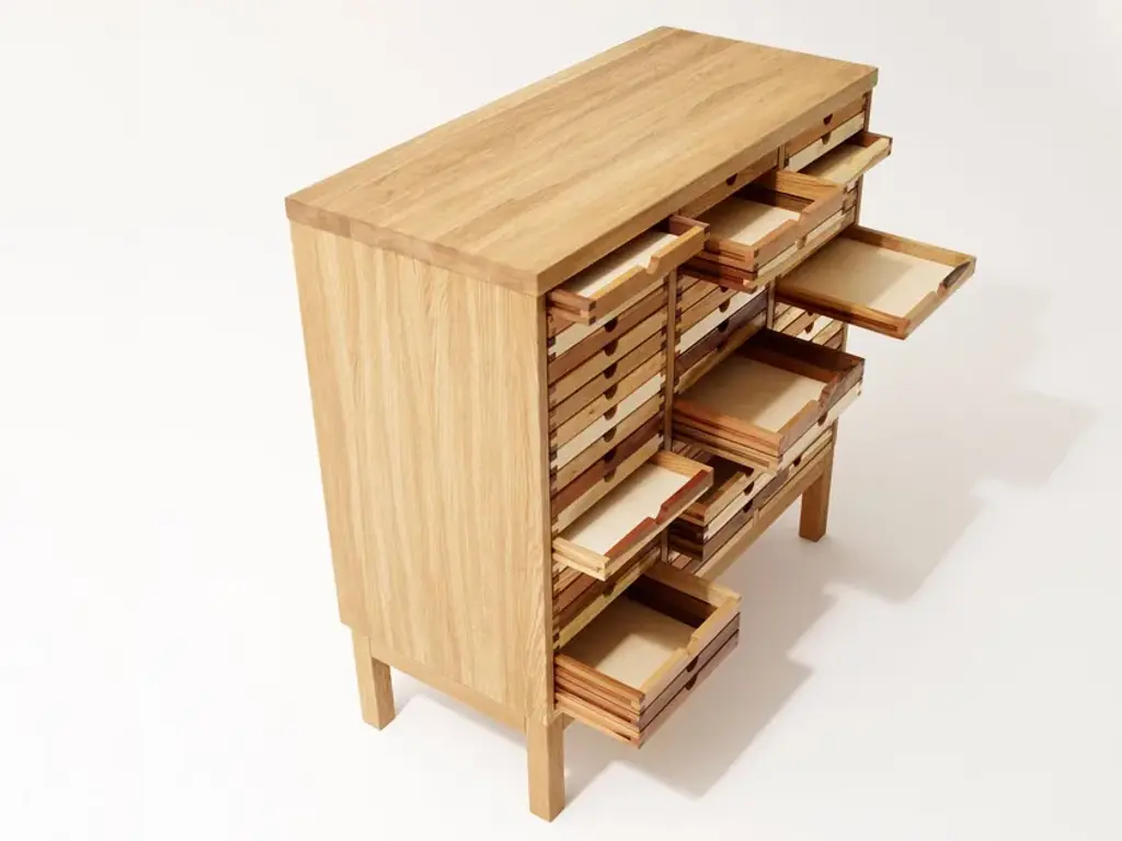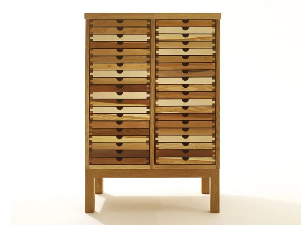 The clean-lined design and intricate detail of this chest of drawers, together with the variety of colours due to the drawers made from different types of wood yield a delightful combination. The thin drawers are perfectly suited for storing documents, sketches, drawings, brochures and other treasured pieces such as jewellery, watches and various collectibles. The drawers of the standard design are A4-sized. However, several drawers may be combined into one, resulting in a deeper storage space without changing the appearance. Types of timber available: beech, core beech, oak, maple, ash, cherry, pear and walnutDrawers height: single (2,2 cm), double (5,5 cm) e triple (8,8 cm).Drawers arrangement:COMP.A - 8xsingle + 3xdouble + 2xtripleCOMP.B - 4xsingle + 5xdouble + 2xtripleCOMP.C - 5xsingle + 3xdouble + 3xtripleSIXtematic