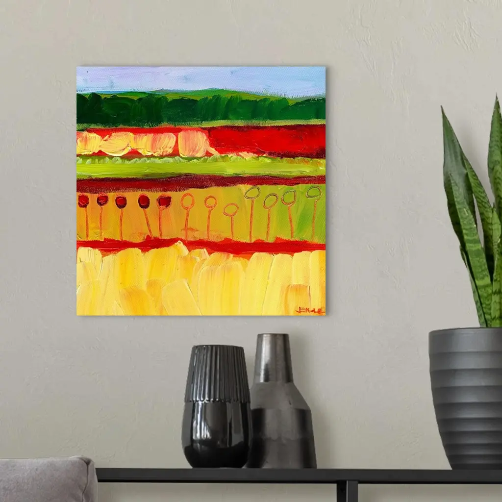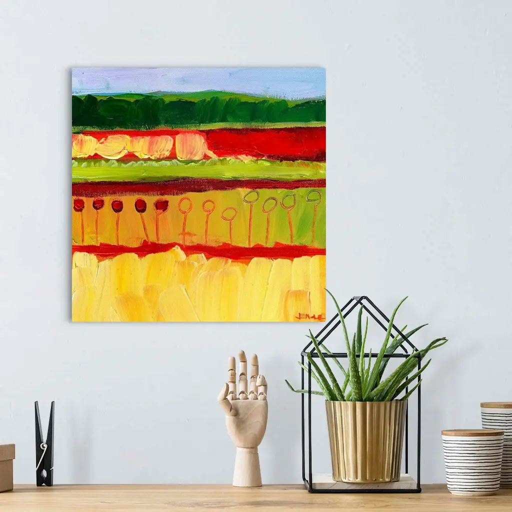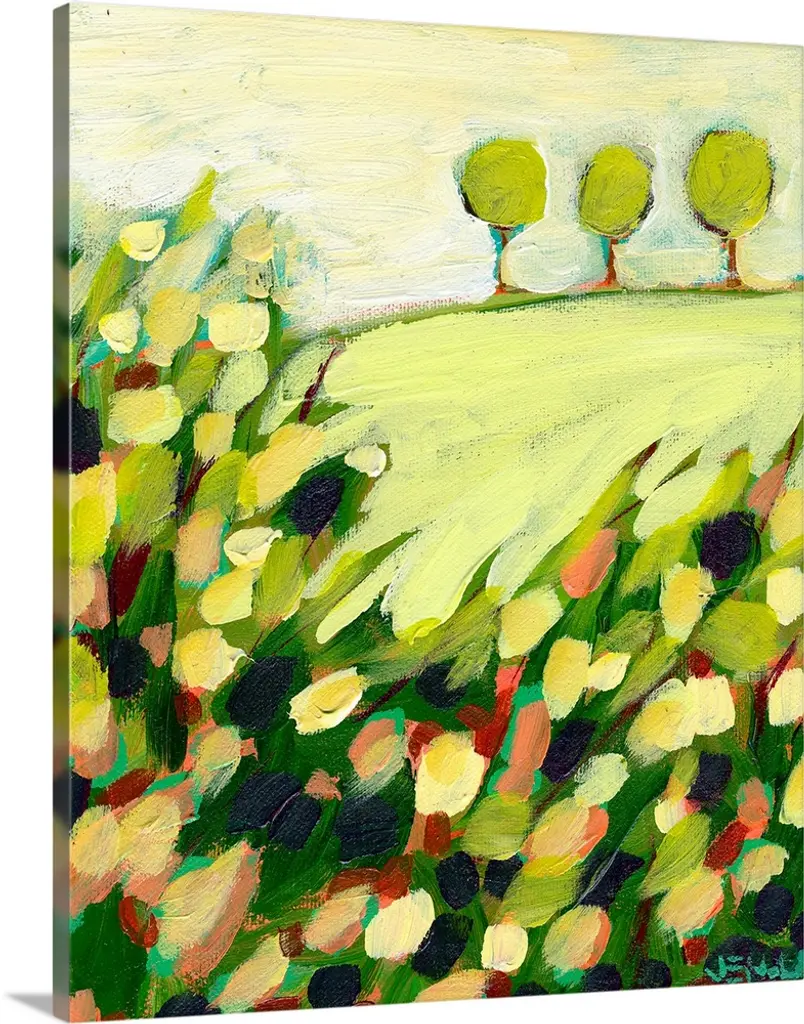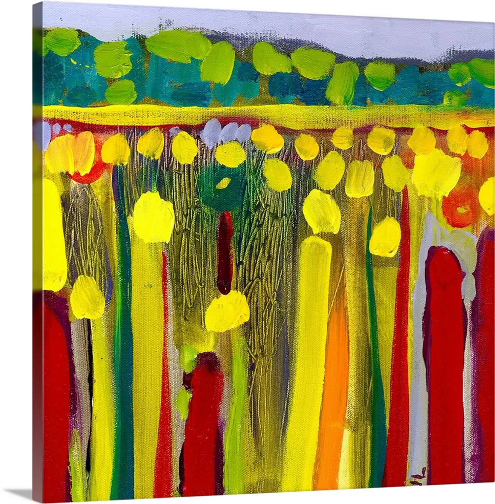 Abstract painting of colorful fields with vegetation created with broad textured brush strokes.