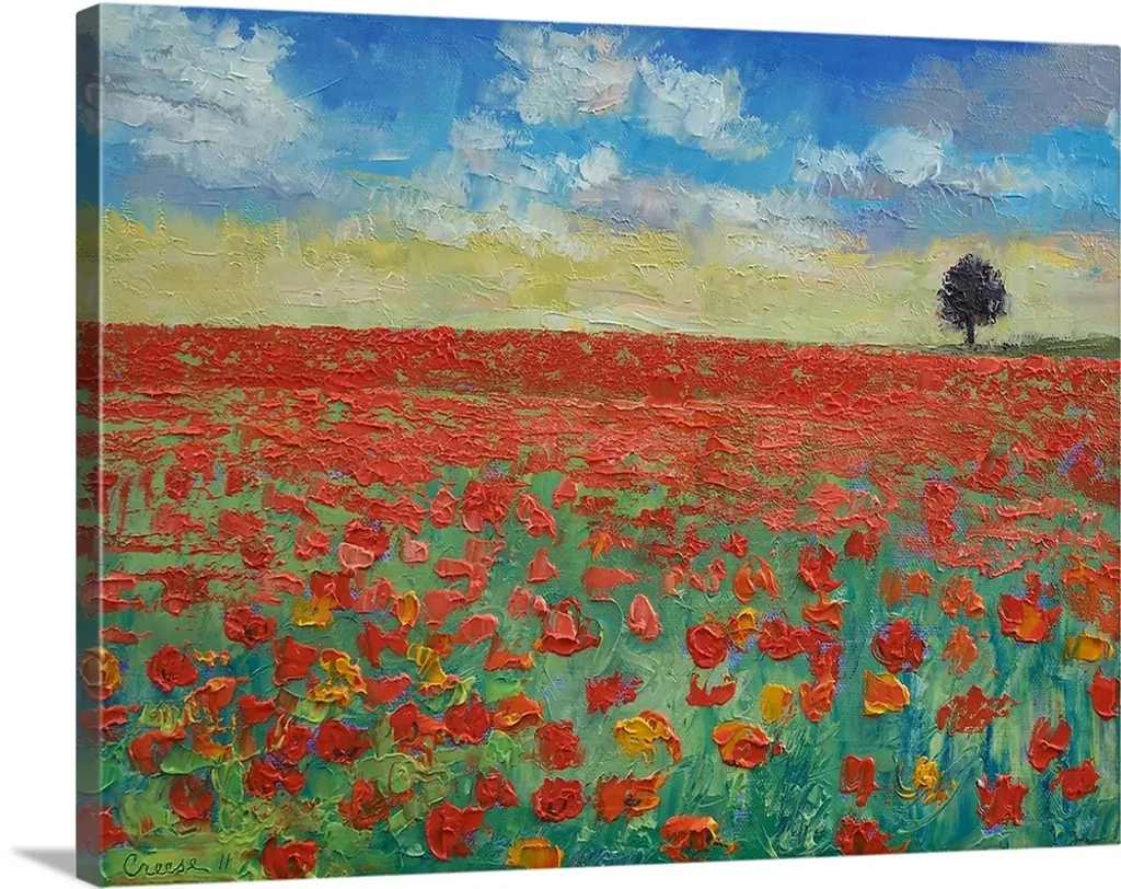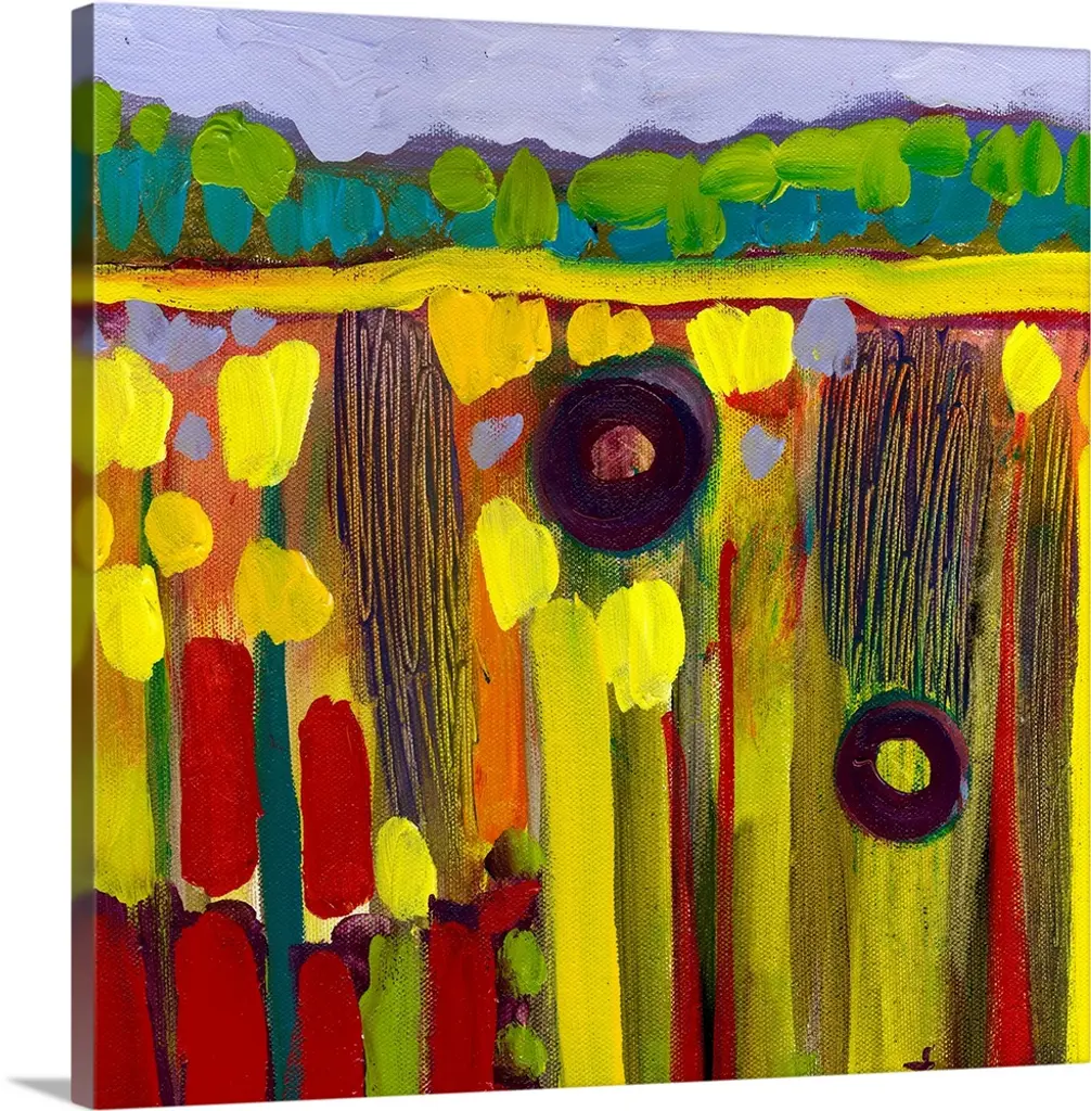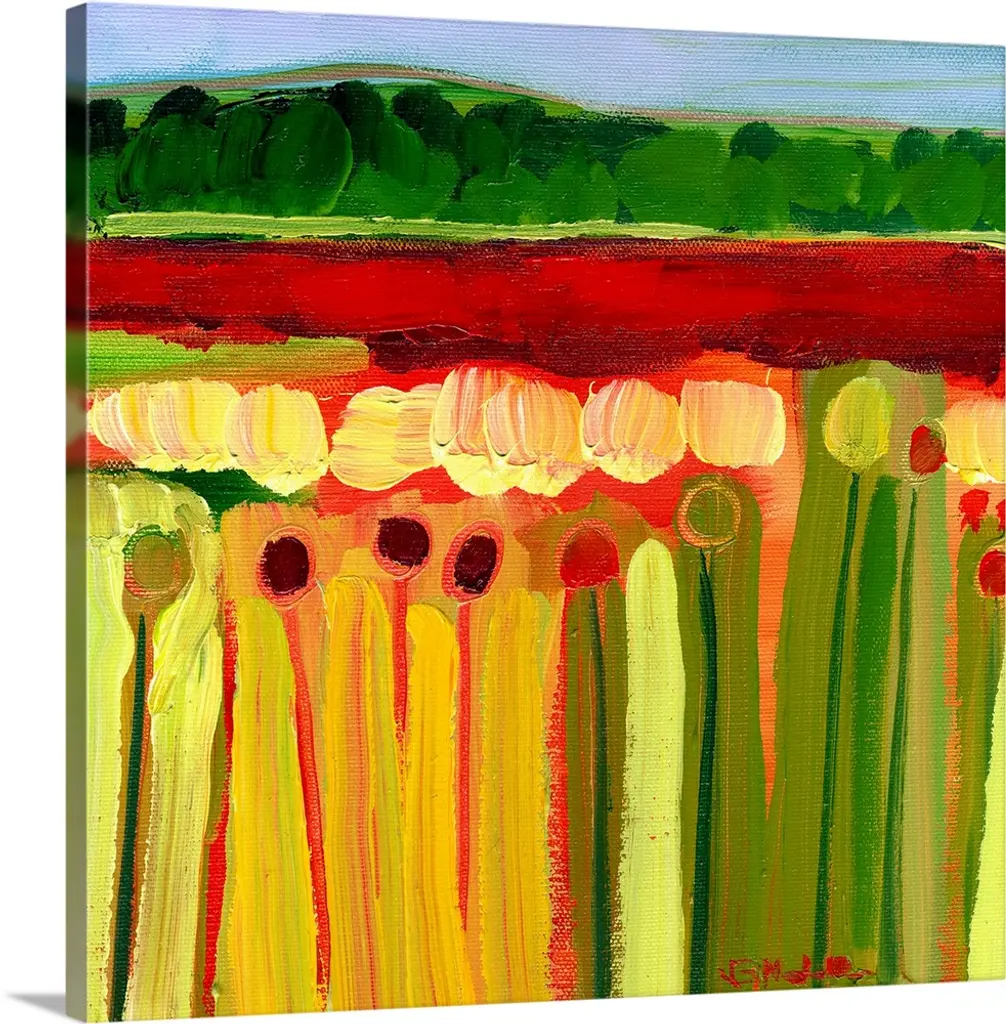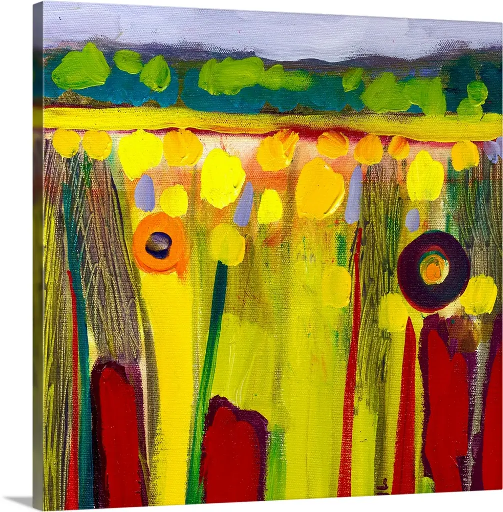 Abstract painting of colorful fields with vegetation created with broad textured brush strokes.