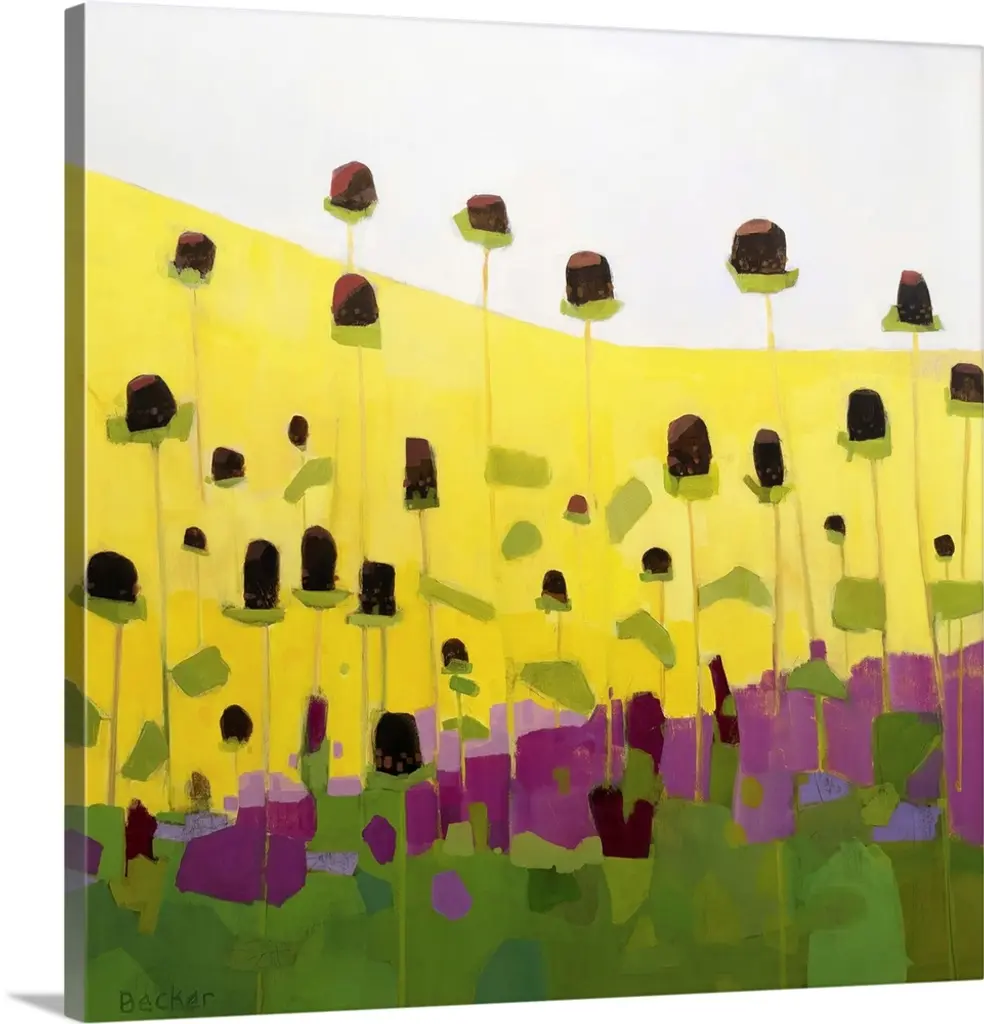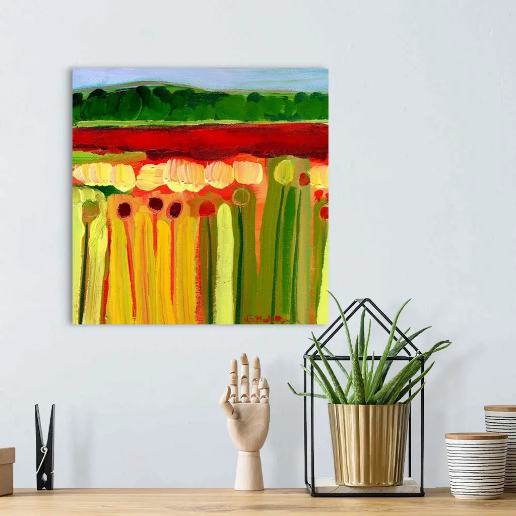 This contemporary wall art is a geometric, abstract painting that is a landscape of flower fields, woods, and a clear sky on the horizon.