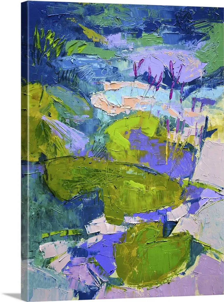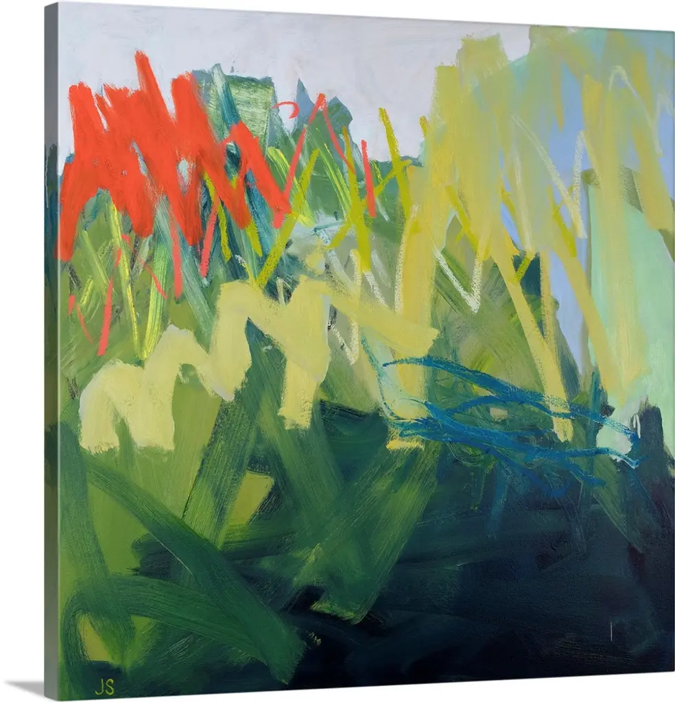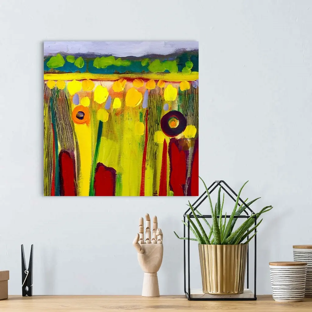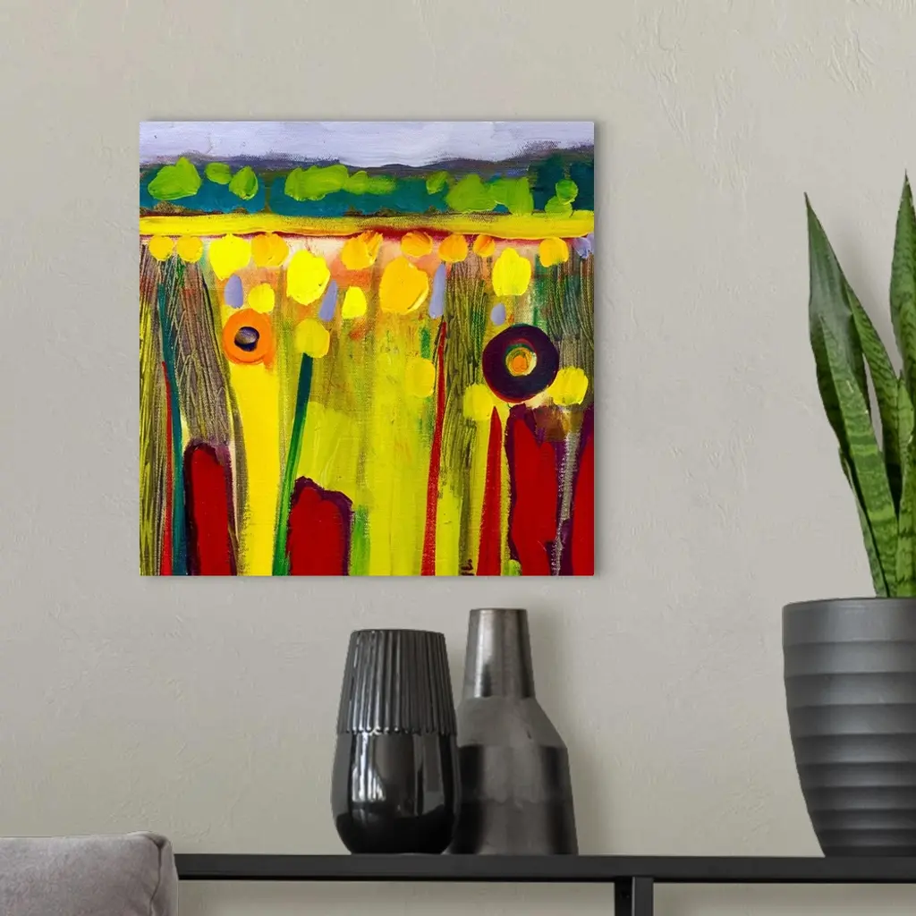 Big, square abstract painting of bright , circular flowers in the lush fields of the Skagit Valley of Northwest Washington.