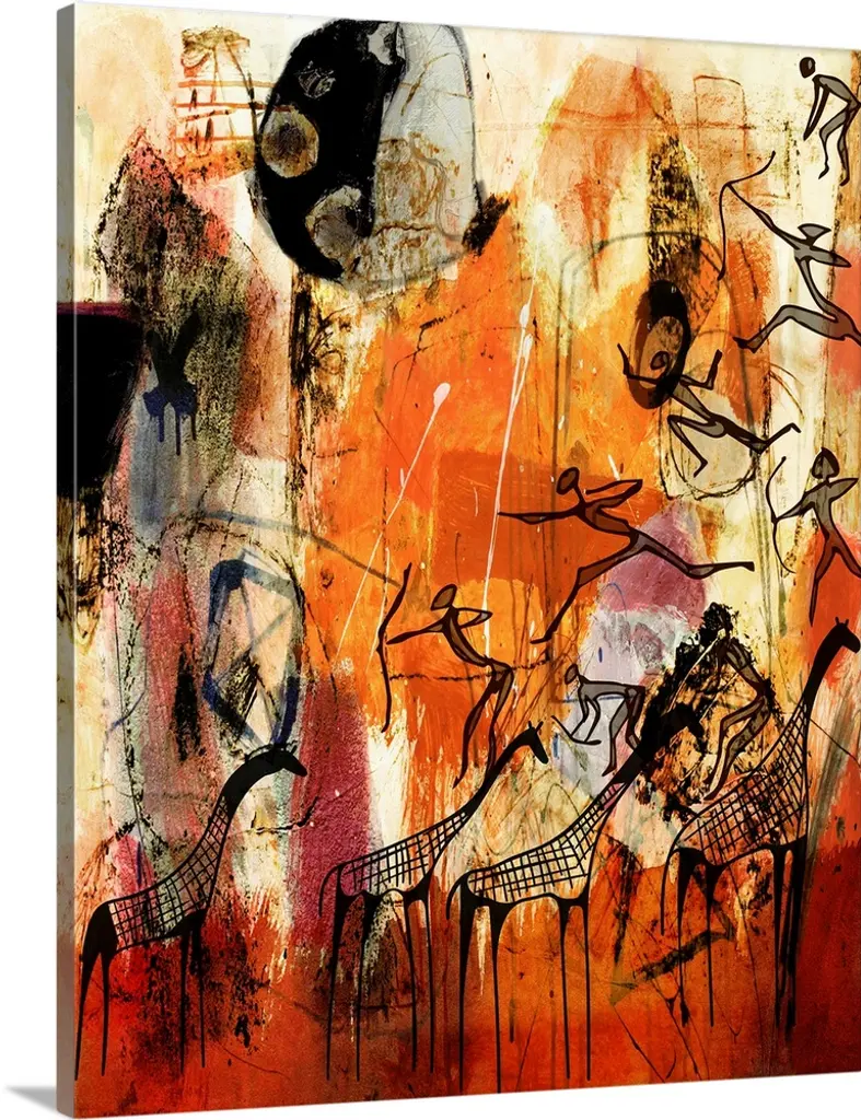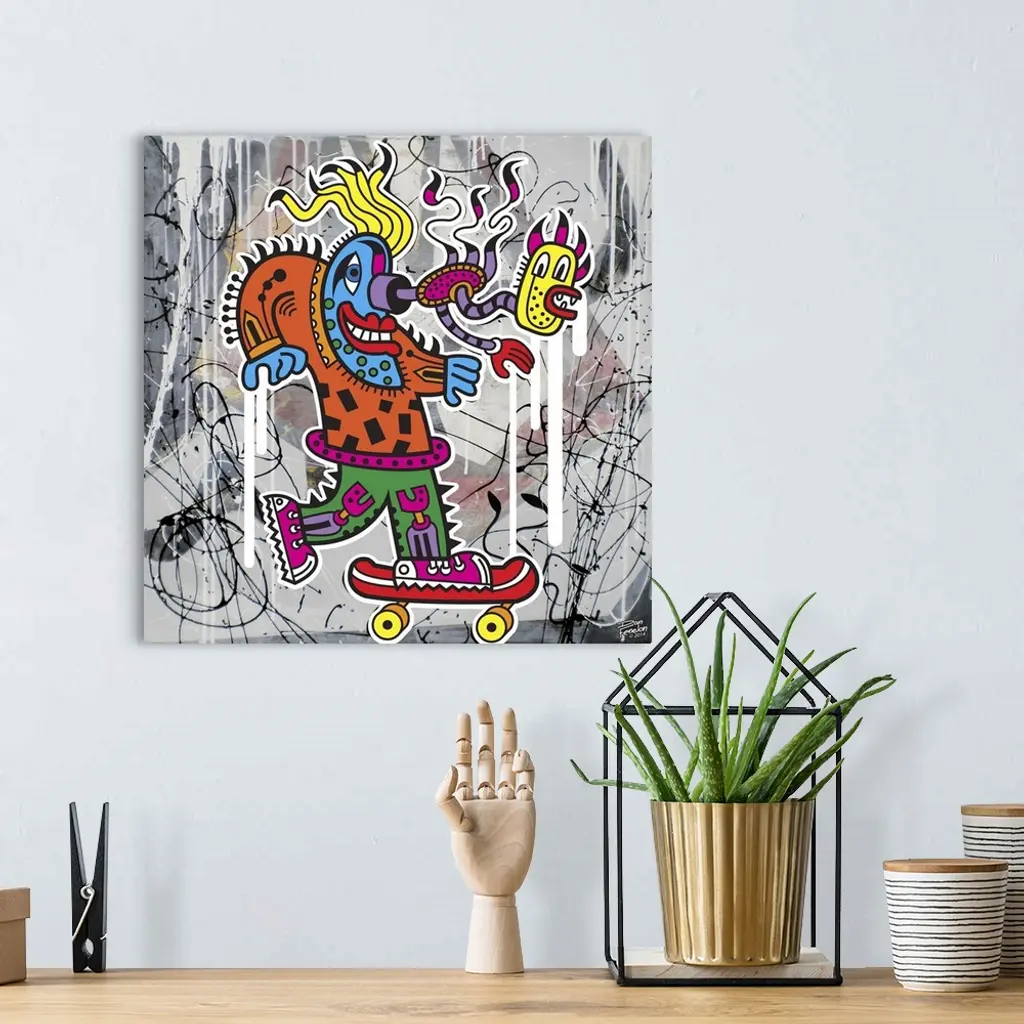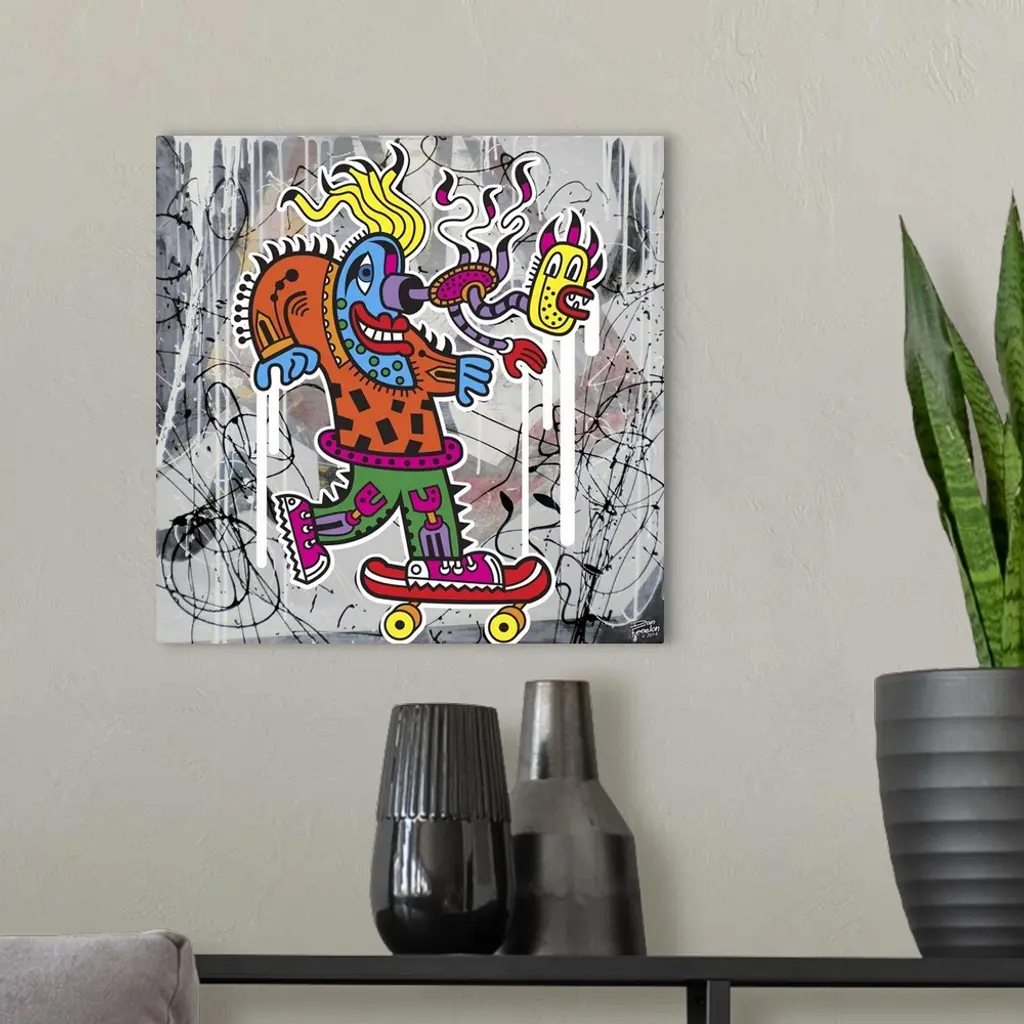 Contemporary painting of a colorful and decorative monster riding a skateboard against an abstract background.