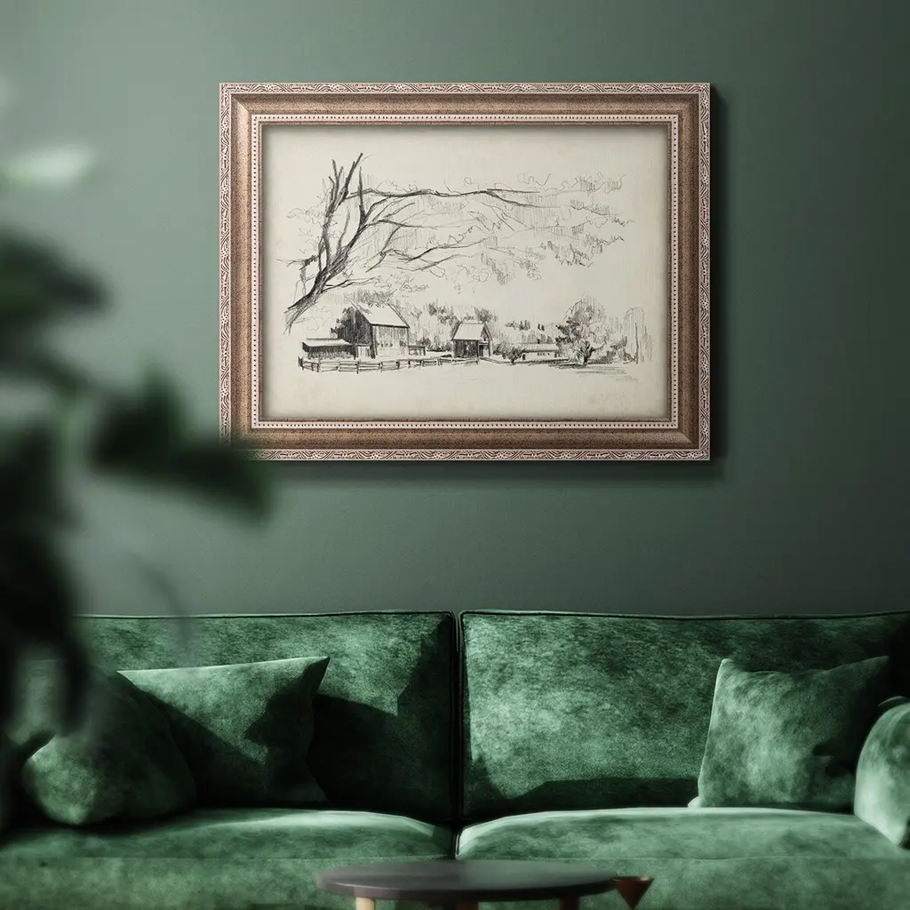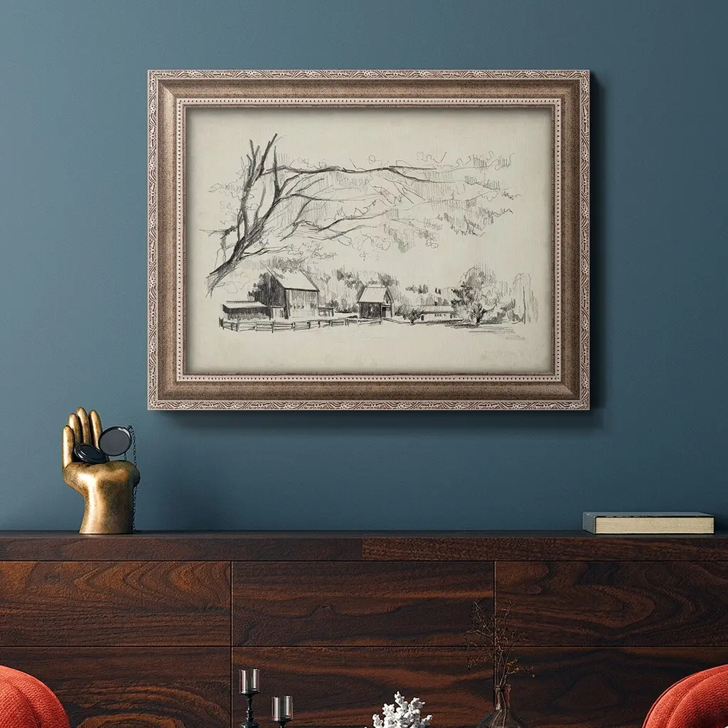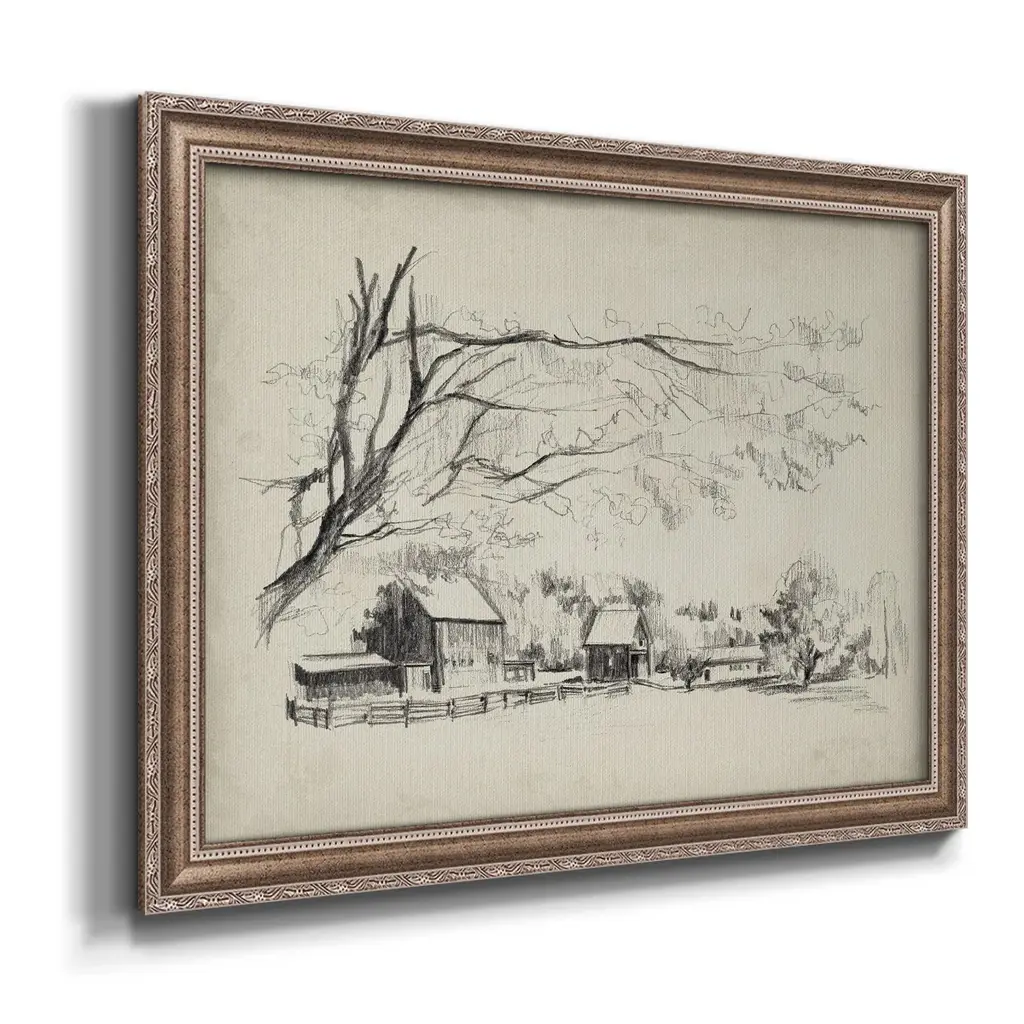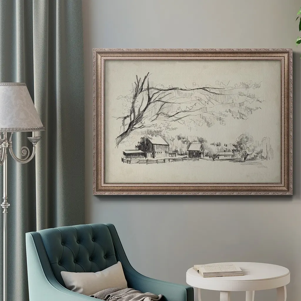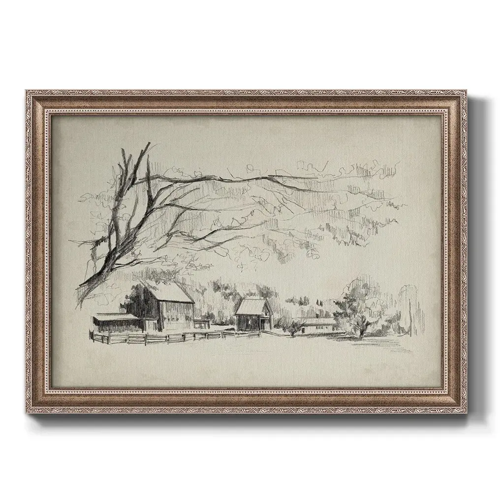 Sketched Barn View I Premium Framed Canvas- Ready to Hang A Premium Framed Canvas created to last. Framed in distressed wood and available in an array of sizes and colors Featuring a beveled a solid wood stretcher bar, each piece comes ready to hand 3 SIZES AVAILABLE 16''X20'' - Overall Size 18'X27'' - Overall Size 24''x36'' - Overall Size Each piece is made to order. Each piece comes with hanging hardware. Made in the USA Ready to Hang Giclee Paper Print Acrylic Glass Beveled Matt Board