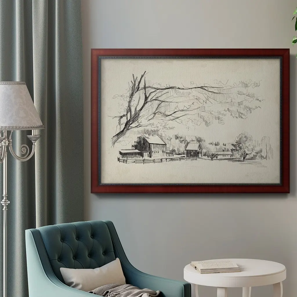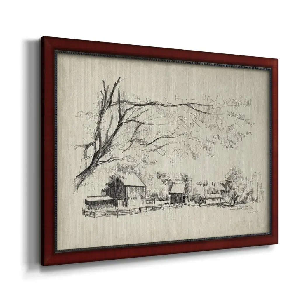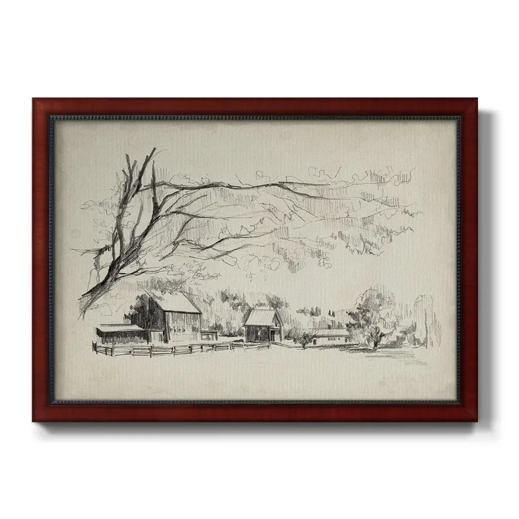 Sketched Barn View I Premium Framed Canvas- Ready to Hang A Premium Framed Canvas created to last. Framed in distressed wood and available in an array of sizes and colors Featuring a beveled a solid wood stretcher bar, each piece comes ready to hand 3 SIZES AVAILABLE 16''X20'' - Overall Size 18'X27'' - Overall Size 24''x36'' - Overall Size Each piece is made to order. Each piece comes with hanging hardware. Made in the USA Ready to Hang Giclee Paper Print Acrylic Glass Beveled Matt Board