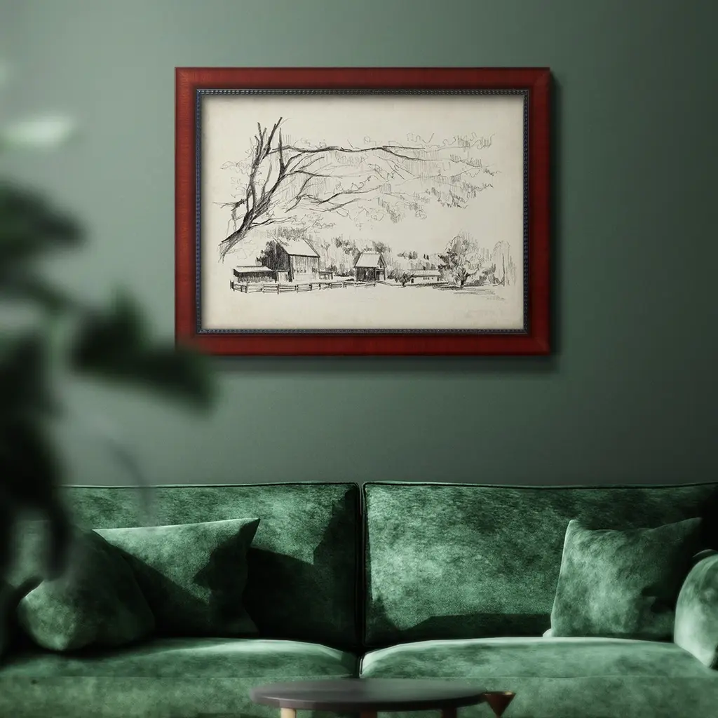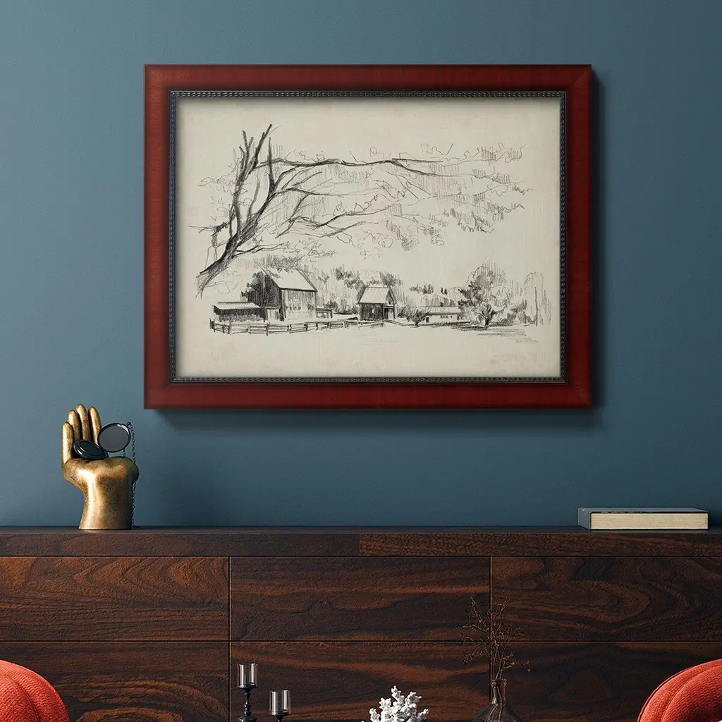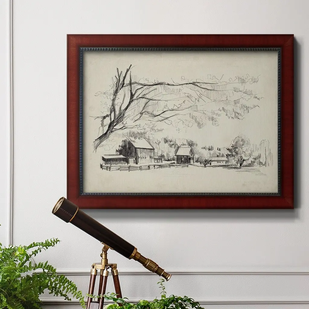 Sketched Barn View I Premium Framed Canvas- Ready to Hang A Premium Framed Canvas created to last. Framed in distressed wood and available in an array of sizes and colors Featuring a beveled a solid wood stretcher bar, each piece comes ready to hand 3 SIZES AVAILABLE 16''X20'' - Overall Size 18'X27'' - Overall Size 24''x36'' - Overall Size Each piece is made to order. Each piece comes with hanging hardware. Made in the USA Ready to Hang Giclee Paper Print Acrylic Glass Beveled Matt Board