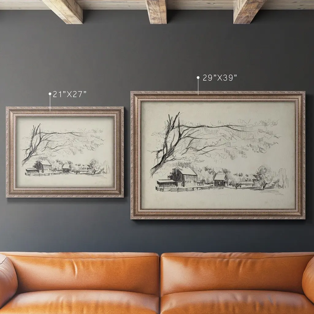 Sketched Barn View I Premium Framed Canvas- Ready to Hang A Premium Framed Canvas created to last. Framed in distressed wood and available in an array of sizes and colors Featuring a beveled a solid wood stretcher bar, each piece comes ready to hand 3 SIZES AVAILABLE 16''X20'' - Overall Size 18'X27'' - Overall Size 24''x36'' - Overall Size Each piece is made to order. Each piece comes with hanging hardware. Made in the USA Ready to Hang Giclee Paper Print Acrylic Glass Beveled Matt Board