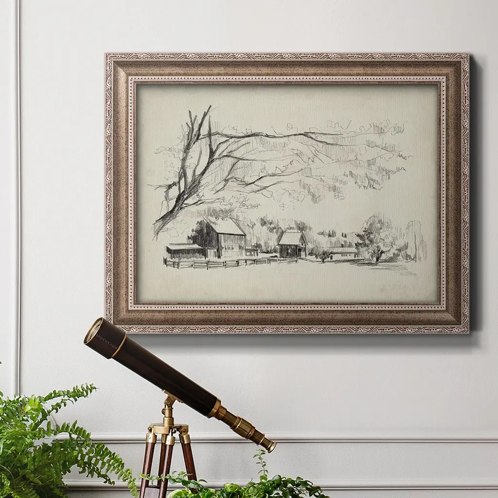 Sketched Barn View I Premium Framed Canvas- Ready to Hang A Premium Framed Canvas created to last. Framed in distressed wood and available in an array of sizes and colors Featuring a beveled a solid wood stretcher bar, each piece comes ready to hand 3 SIZES AVAILABLE 16''X20'' - Overall Size 18'X27'' - Overall Size 24''x36'' - Overall Size Each piece is made to order. Each piece comes with hanging hardware. Made in the USA Ready to Hang Giclee Paper Print Acrylic Glass Beveled Matt Board