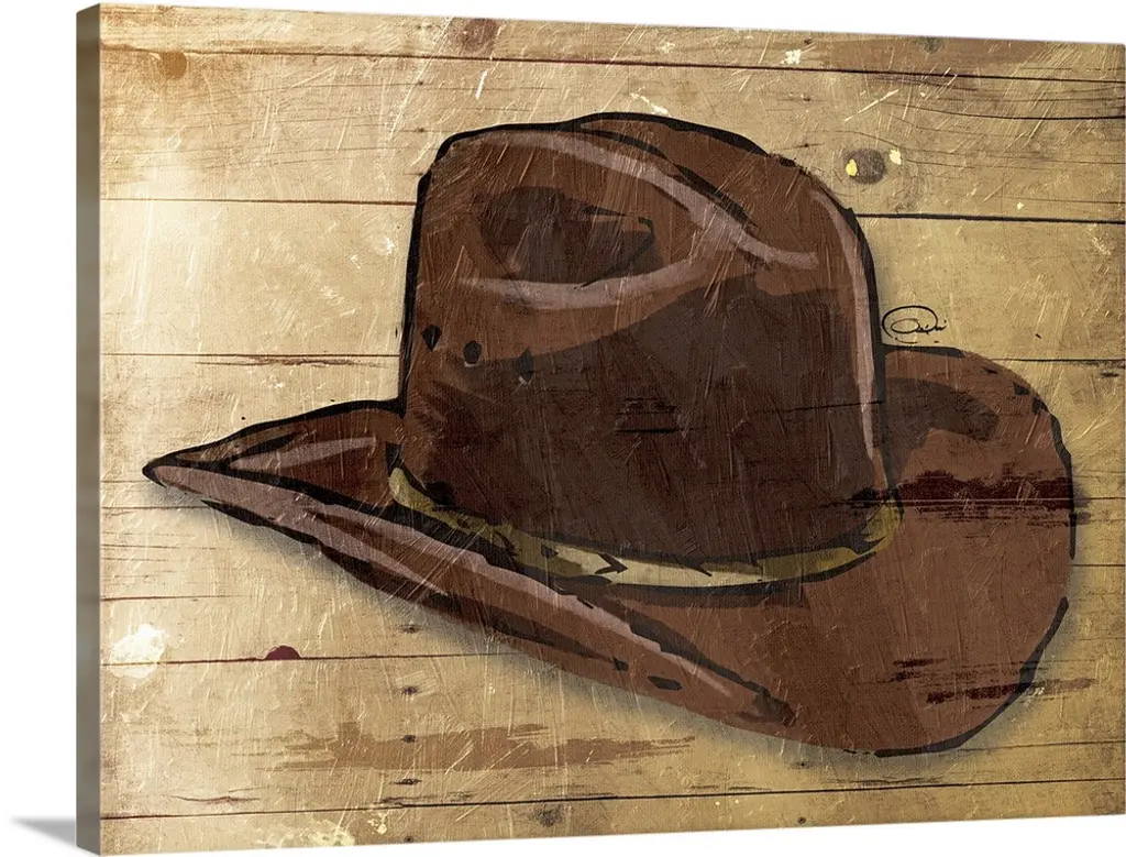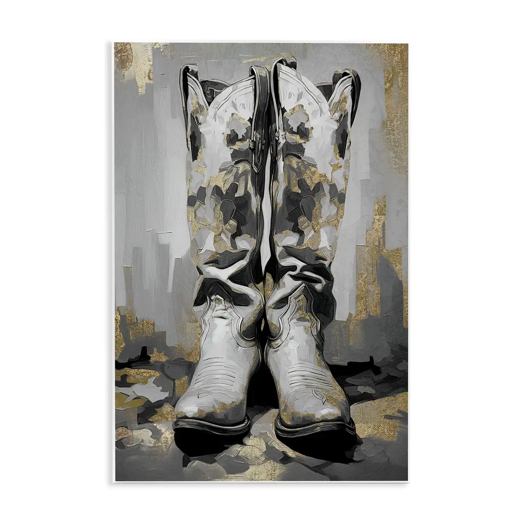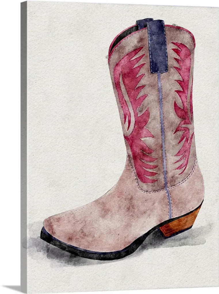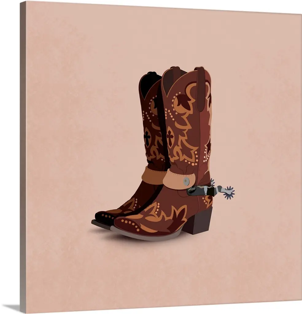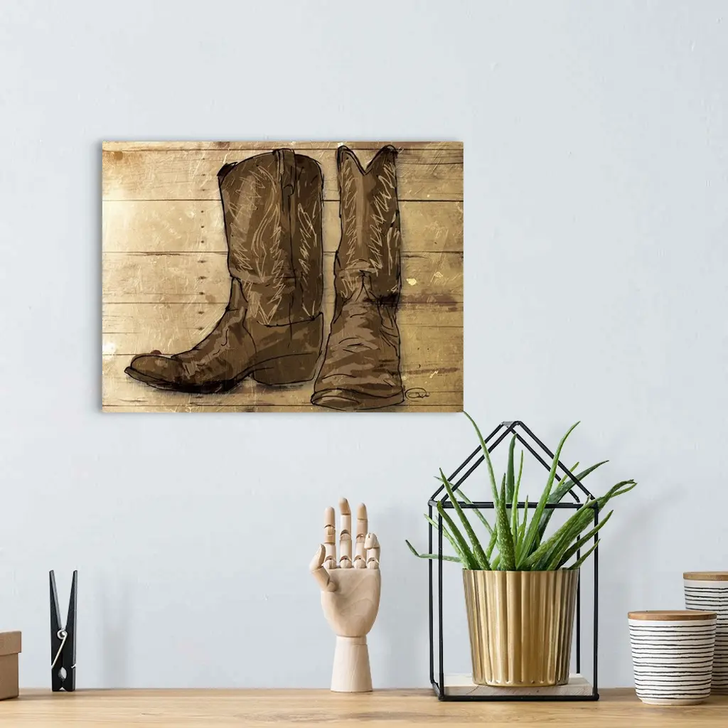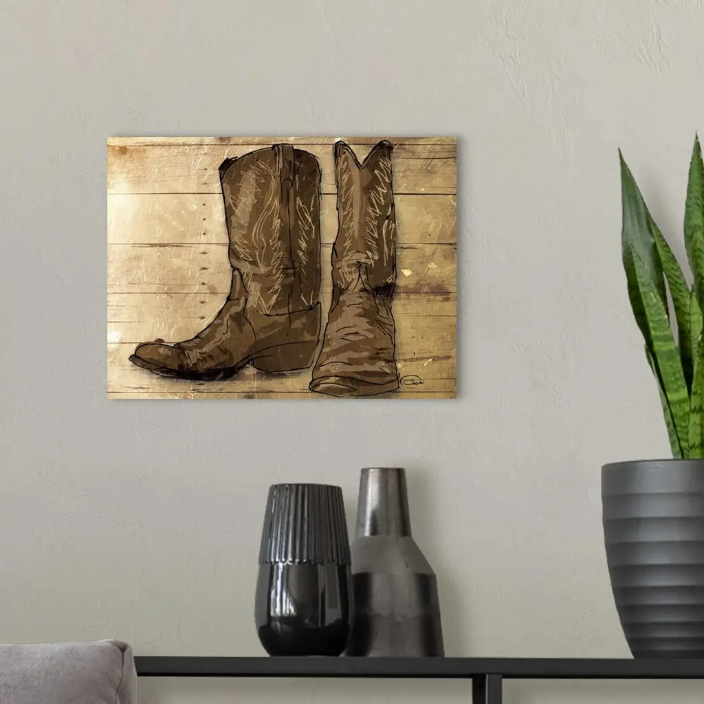 A sketch of brown cowboy boots on a rustic wood paneled background.