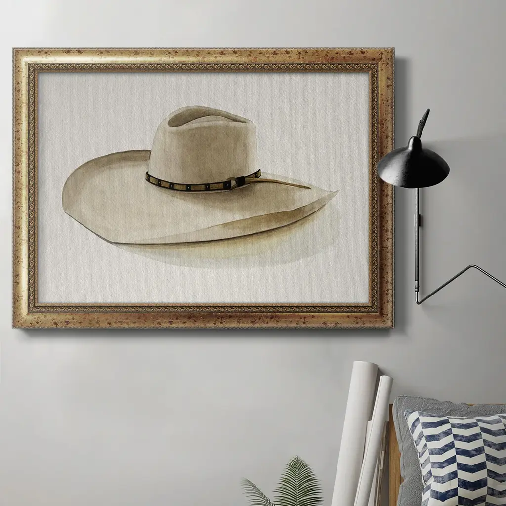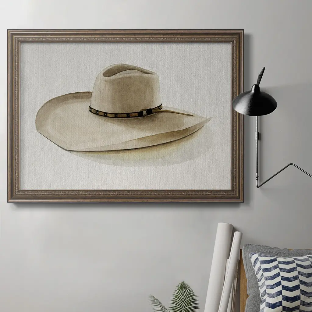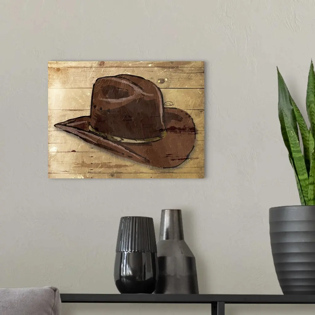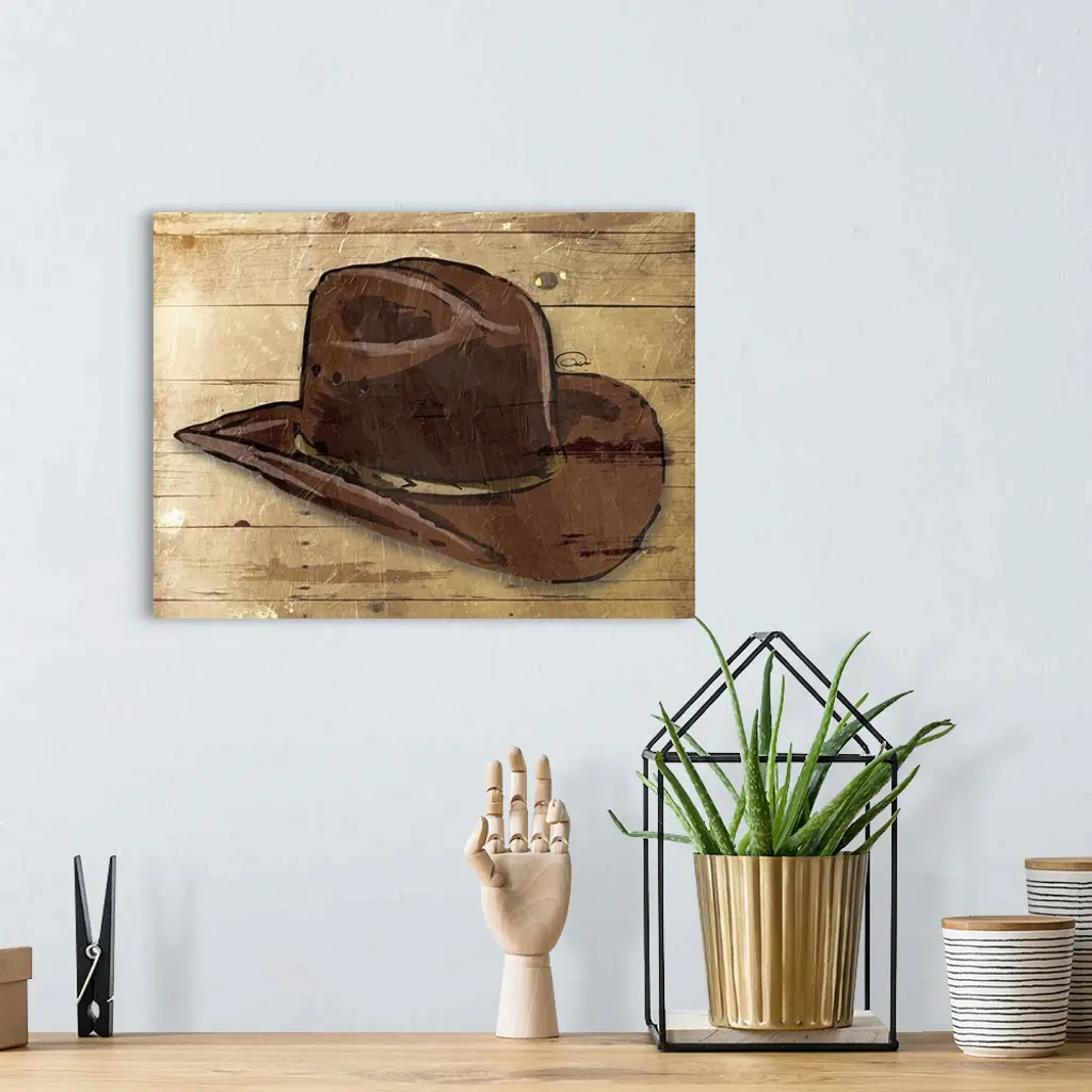 A sketch of a brown cowboy hat on a rustic wood paneled background.