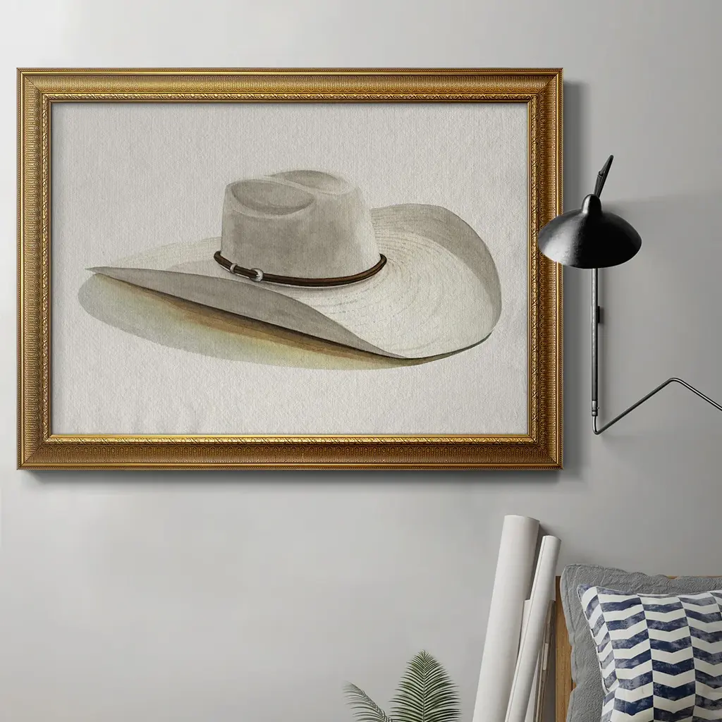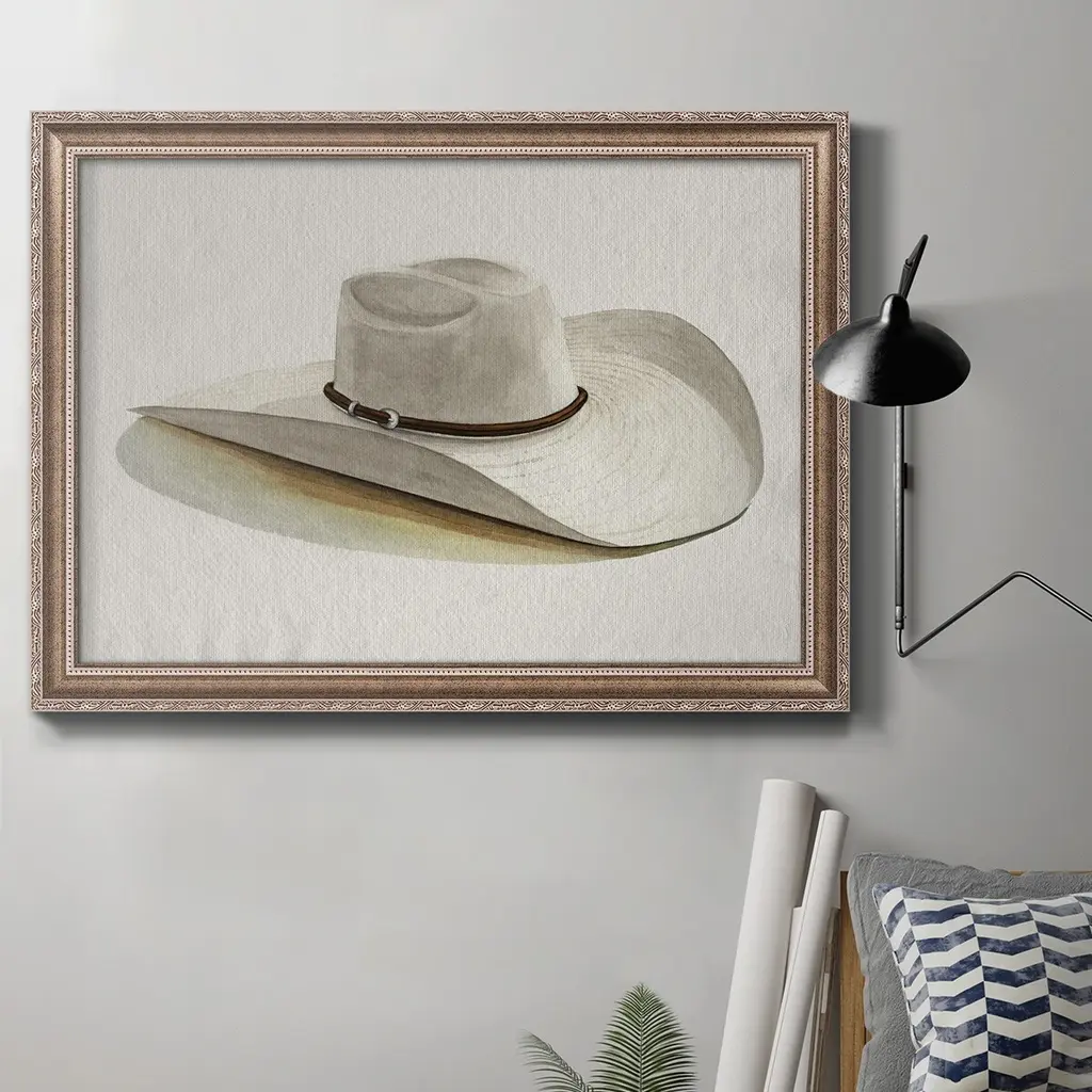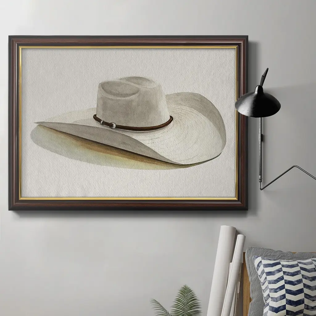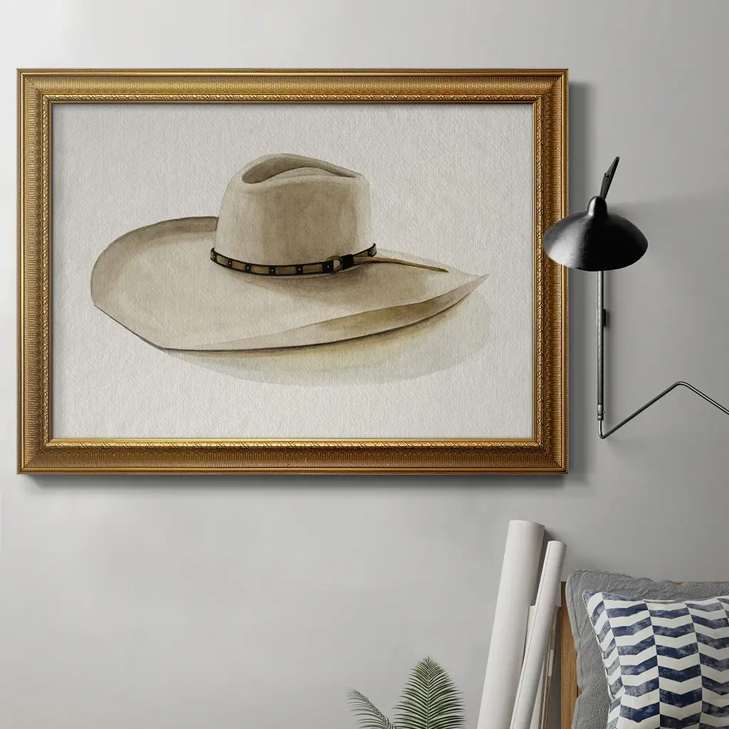 A sketch of a brown cowboy hat on a rustic wood paneled background.
