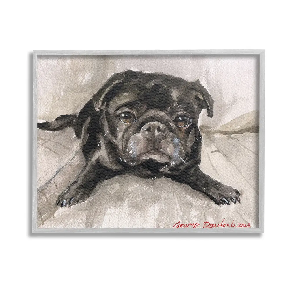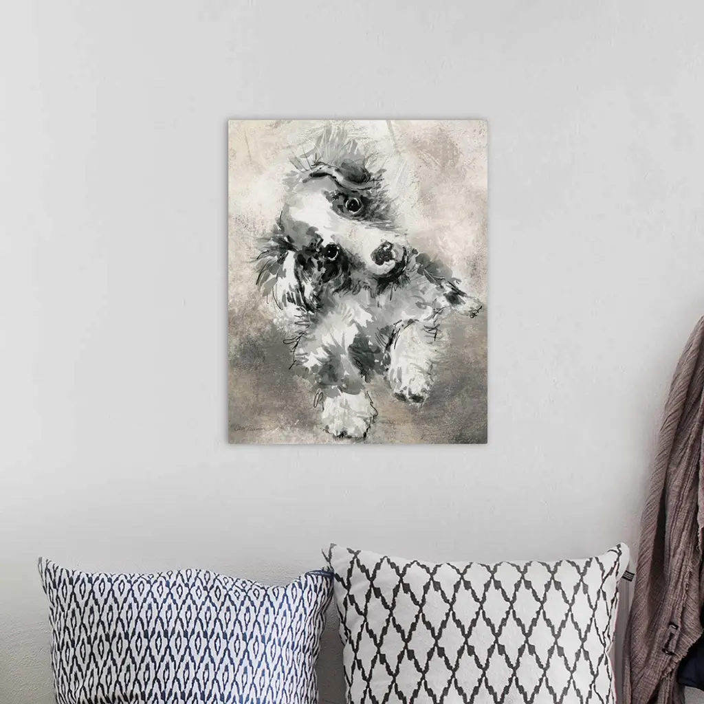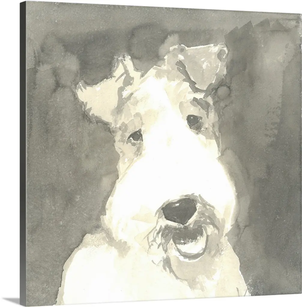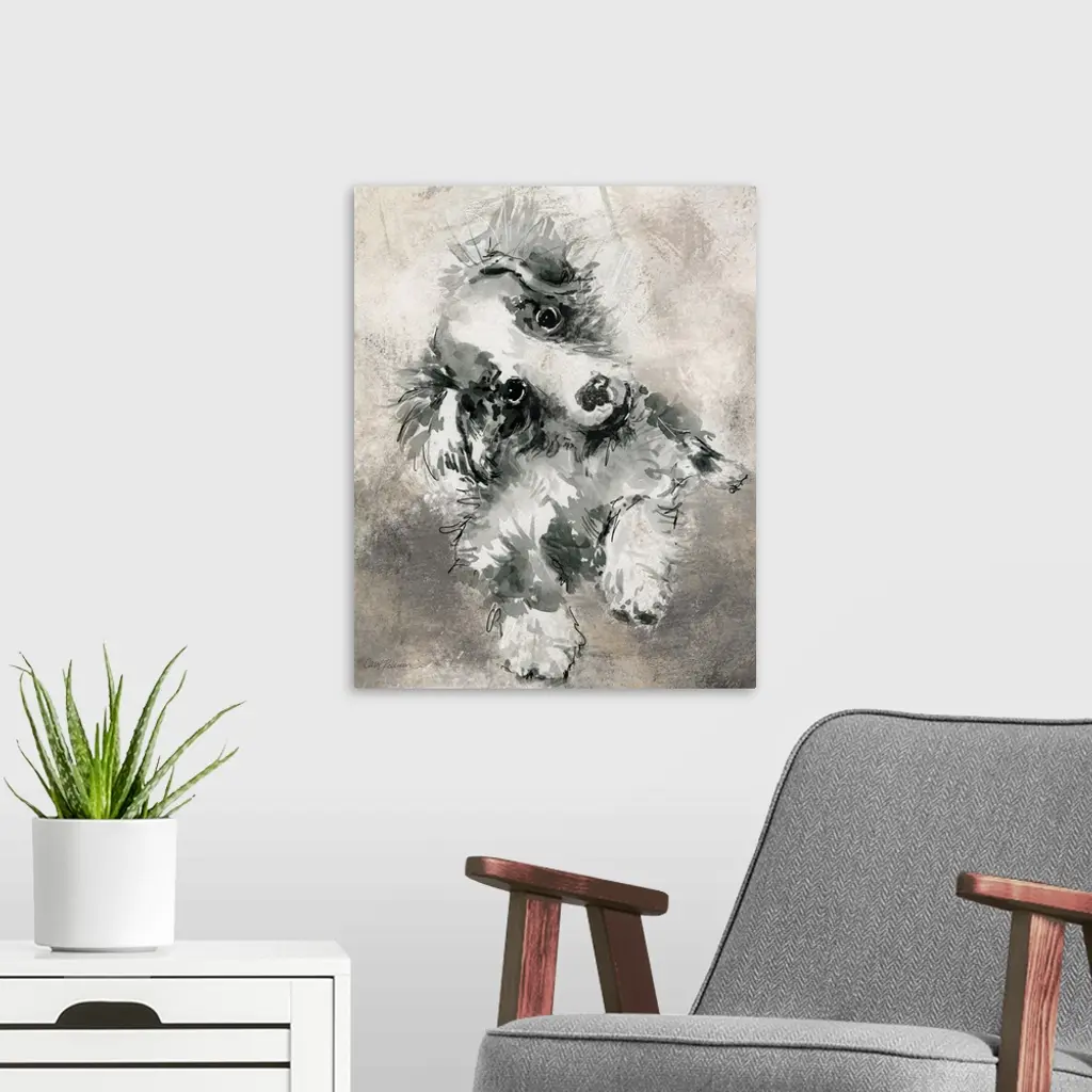 Watercolor painting of a cute collie in grey, black, and white tones on a mixed neutral colored background.