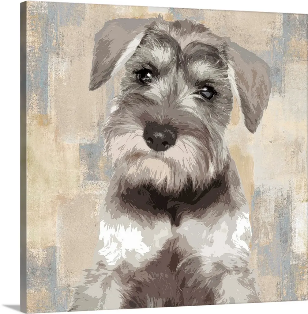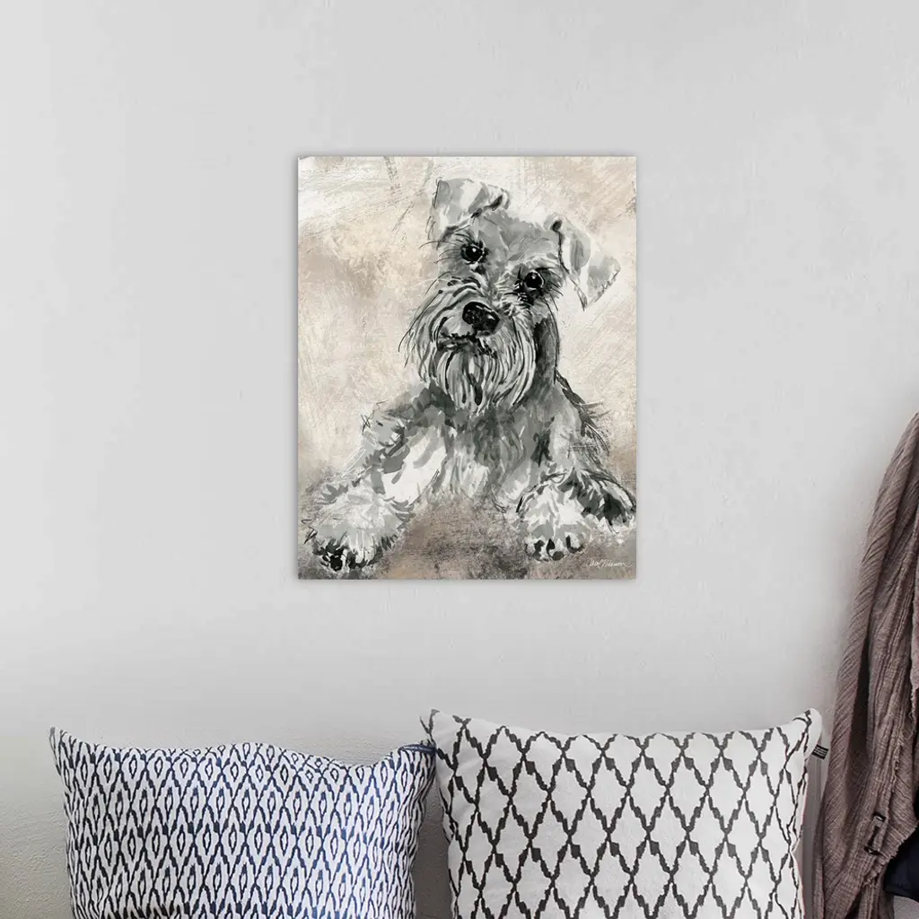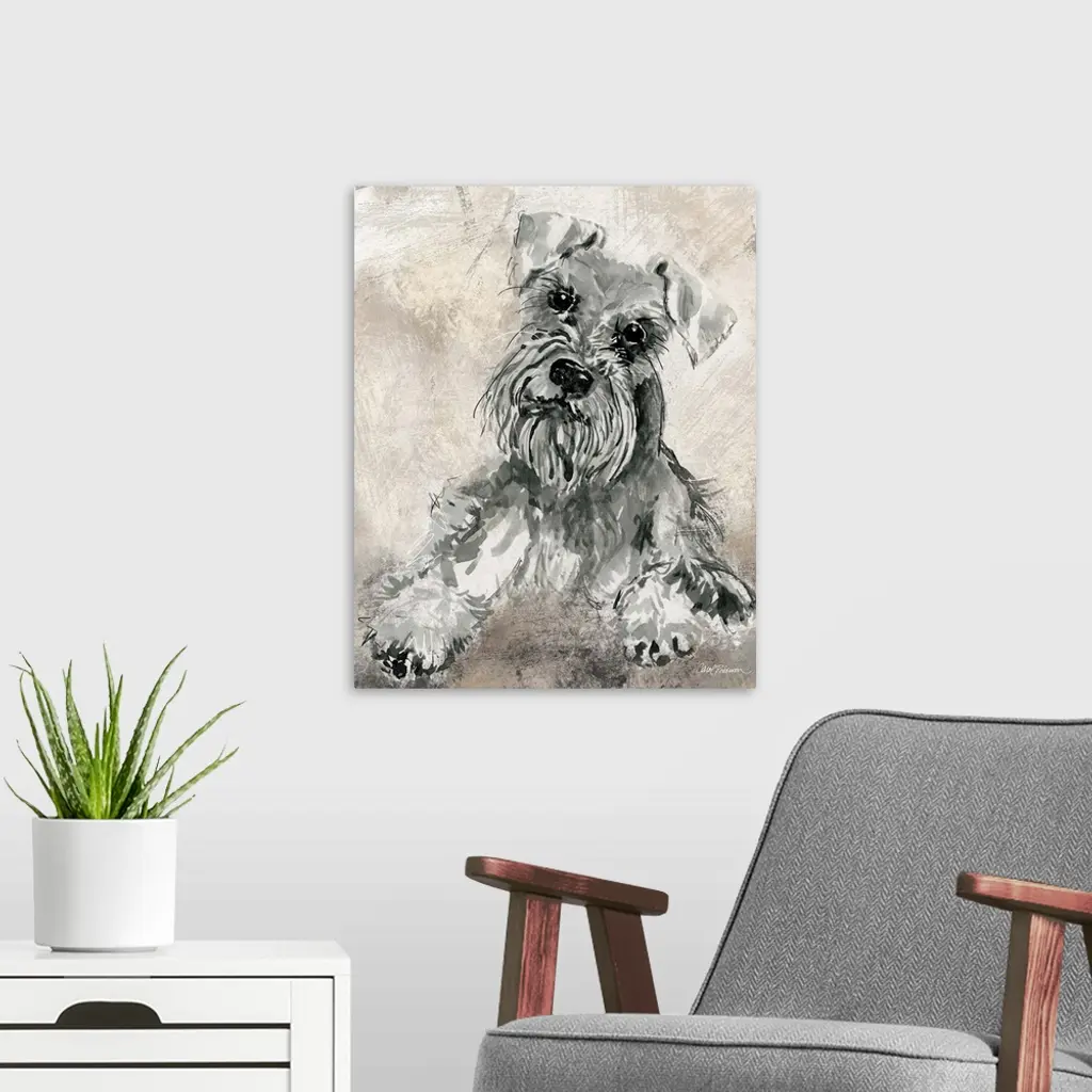 Watercolor painting of a cute schnauzer in grey, black, and white tones on a mixed neutral colored background.