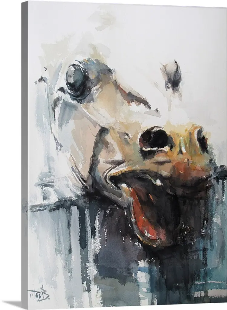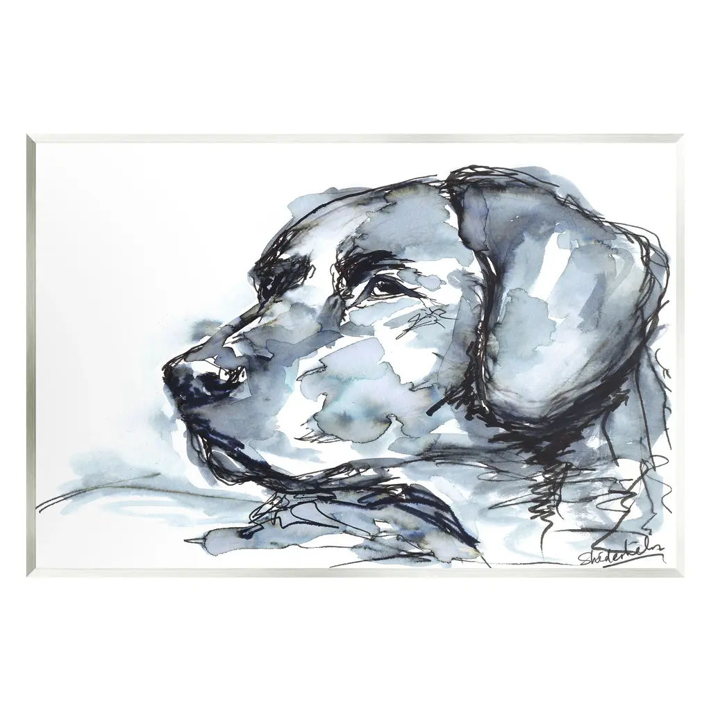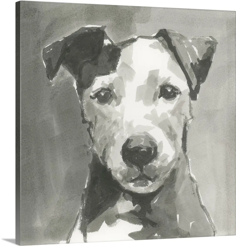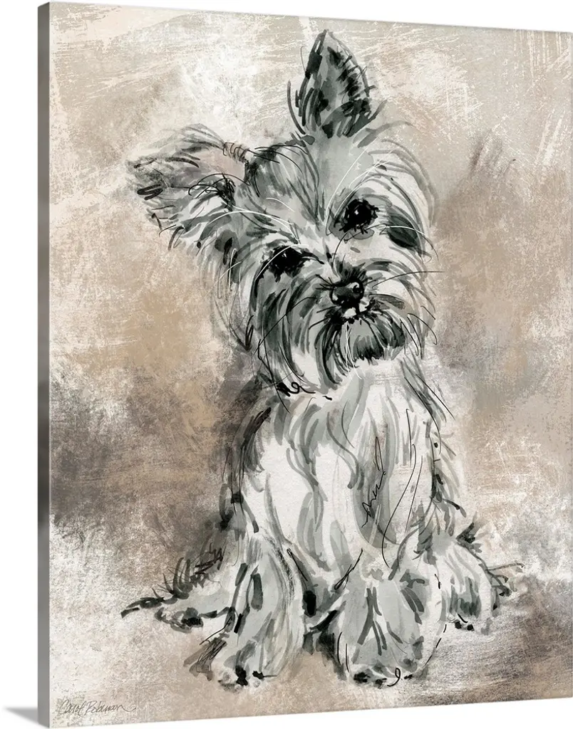 Watercolor painting of a cute schnauzer in grey, black, and white tones on a mixed neutral colored background.