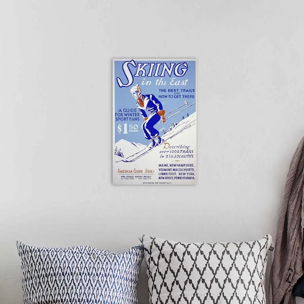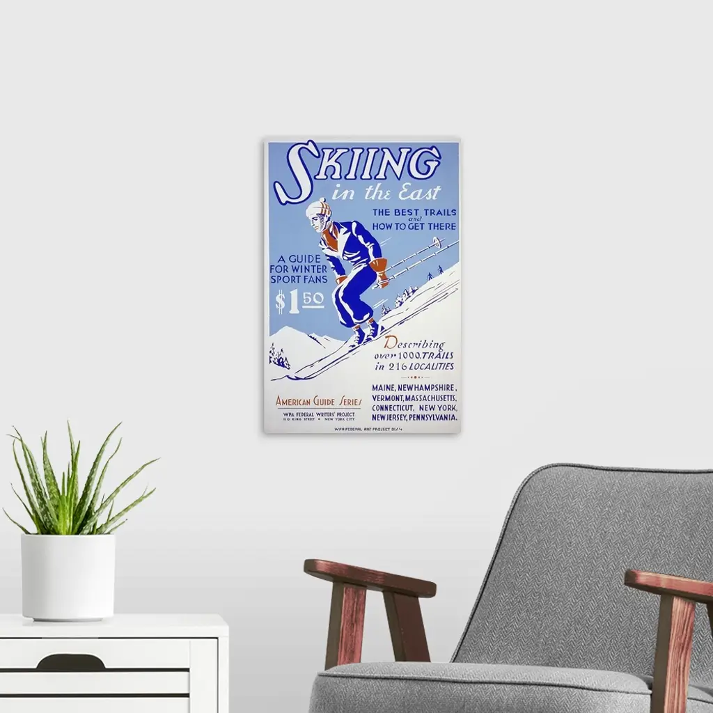 Skiing in the East. The best trails and how to get there: A guide for winter sport fans. Describing over 1000 trails in 216 localities. Poster for WPA Federal Writers' Project, 110 King Street, New York City, American Guide Series guide to winter sports in the East (from Pennsylvania to Maine), showing a man skiing. Library of Congress, Prints and Photographs Division, WPA Poster Collection.