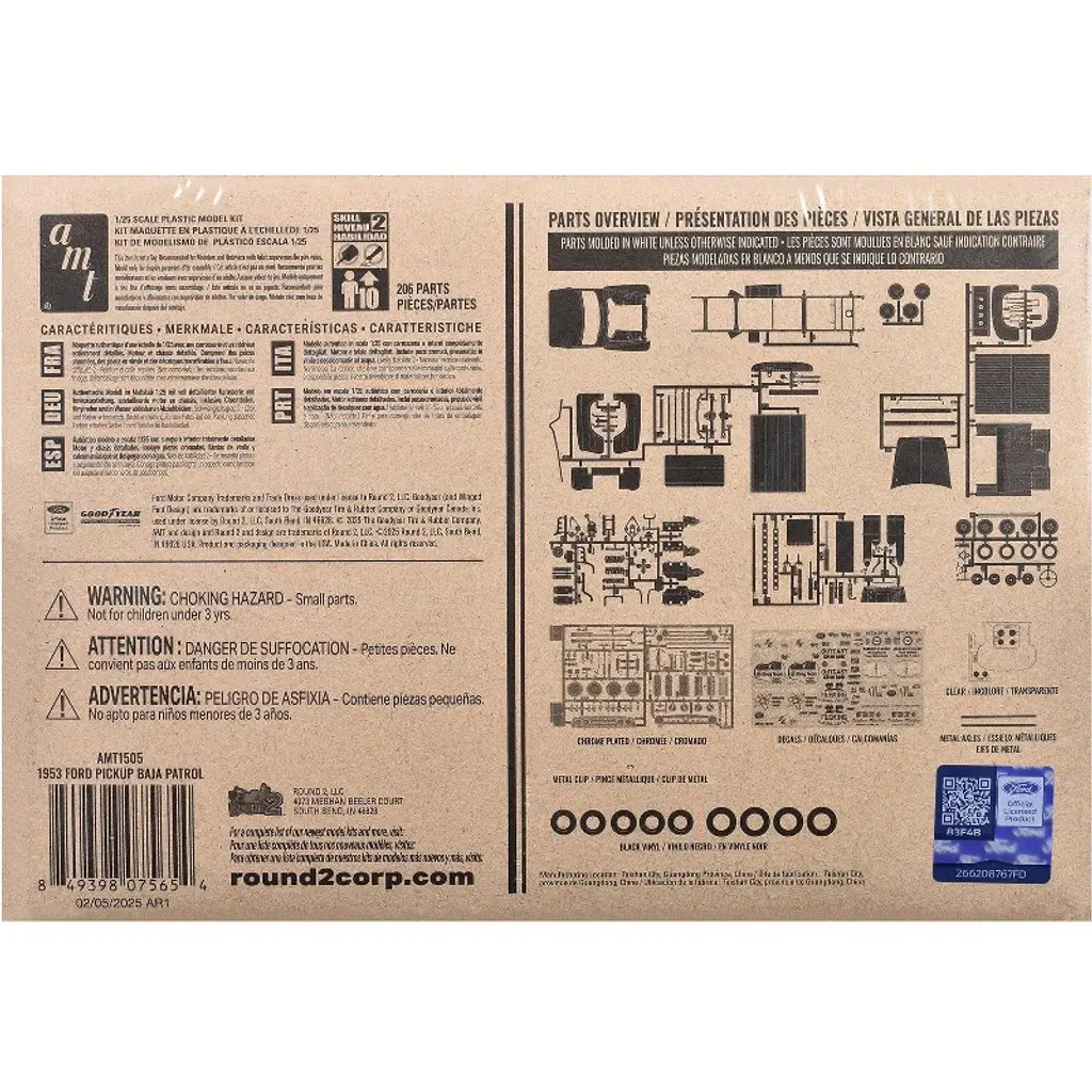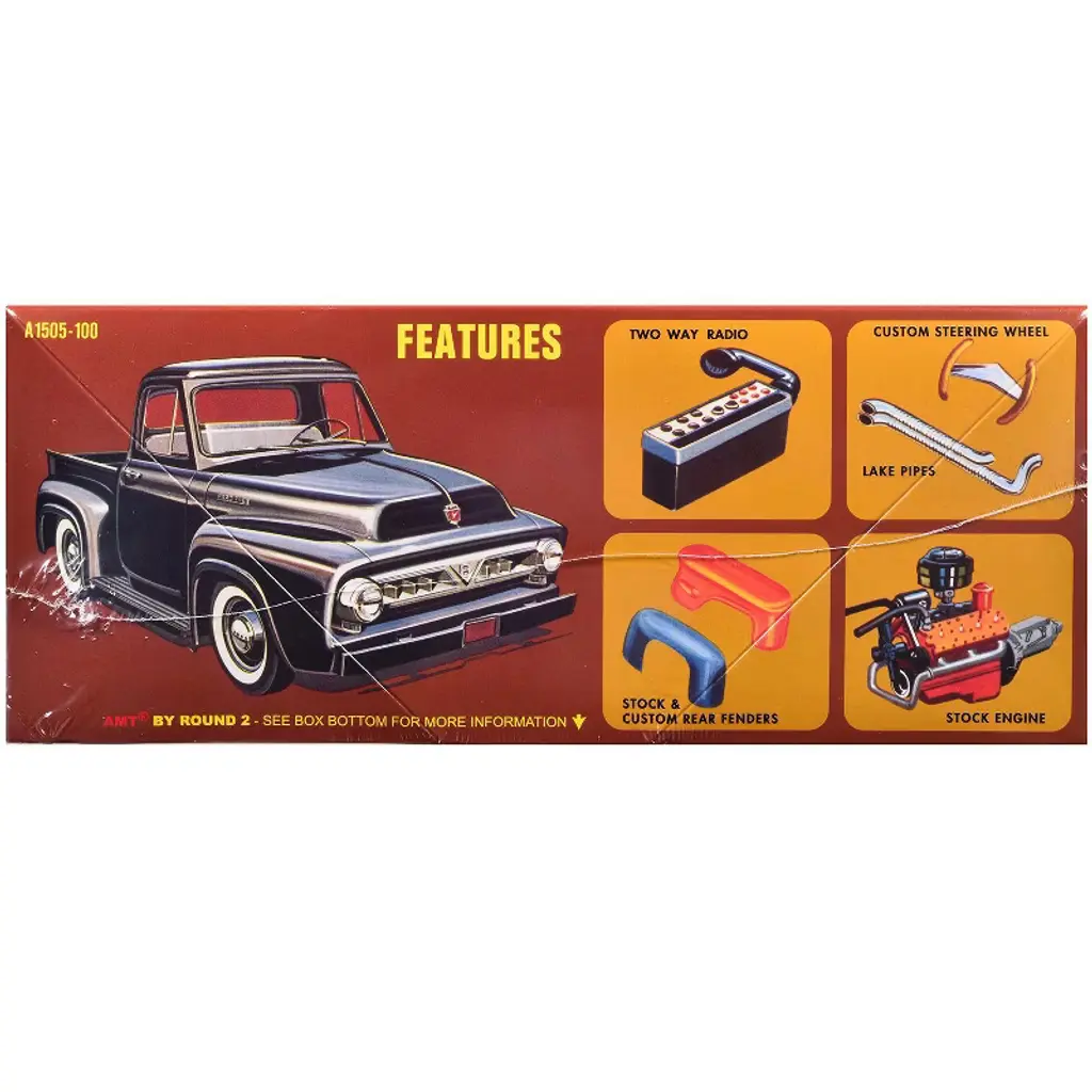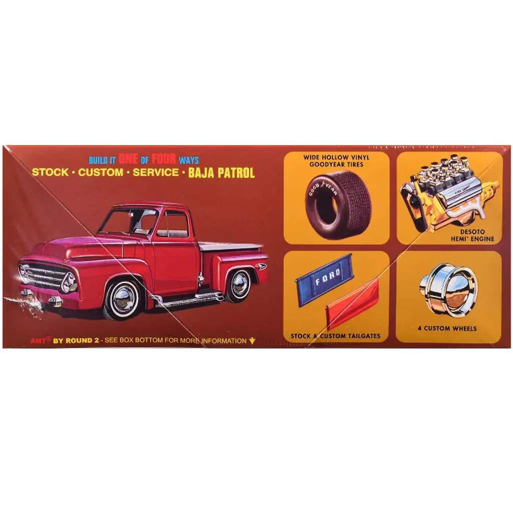 Brand new 1/25 scale plastic model kit of 1953 Ford Pickup Truck "Baja Patrol" (Skill 2) 1/25 plastic model kit by AMT. Brand new box. Two way radio. Desoto HEMI engine. Colorful decal artwork. Custom steering wheel. Vintage style packaging. Officially licensed product. Stock and custom fenders. Chrome plated small parts. Stock and custom tailgates. Contains 206 detailed parts. Black vinyl tires and metal axles. Paint and cement required (not included). Manufacturer's original unopened packaging. Parts molded in WHITE, unless otherwise indicated. Wide hollow vinyl Goodyear tires and custom wheels. Build your kit one of four ways: Stock, Custom, Service, Baja Patrol.