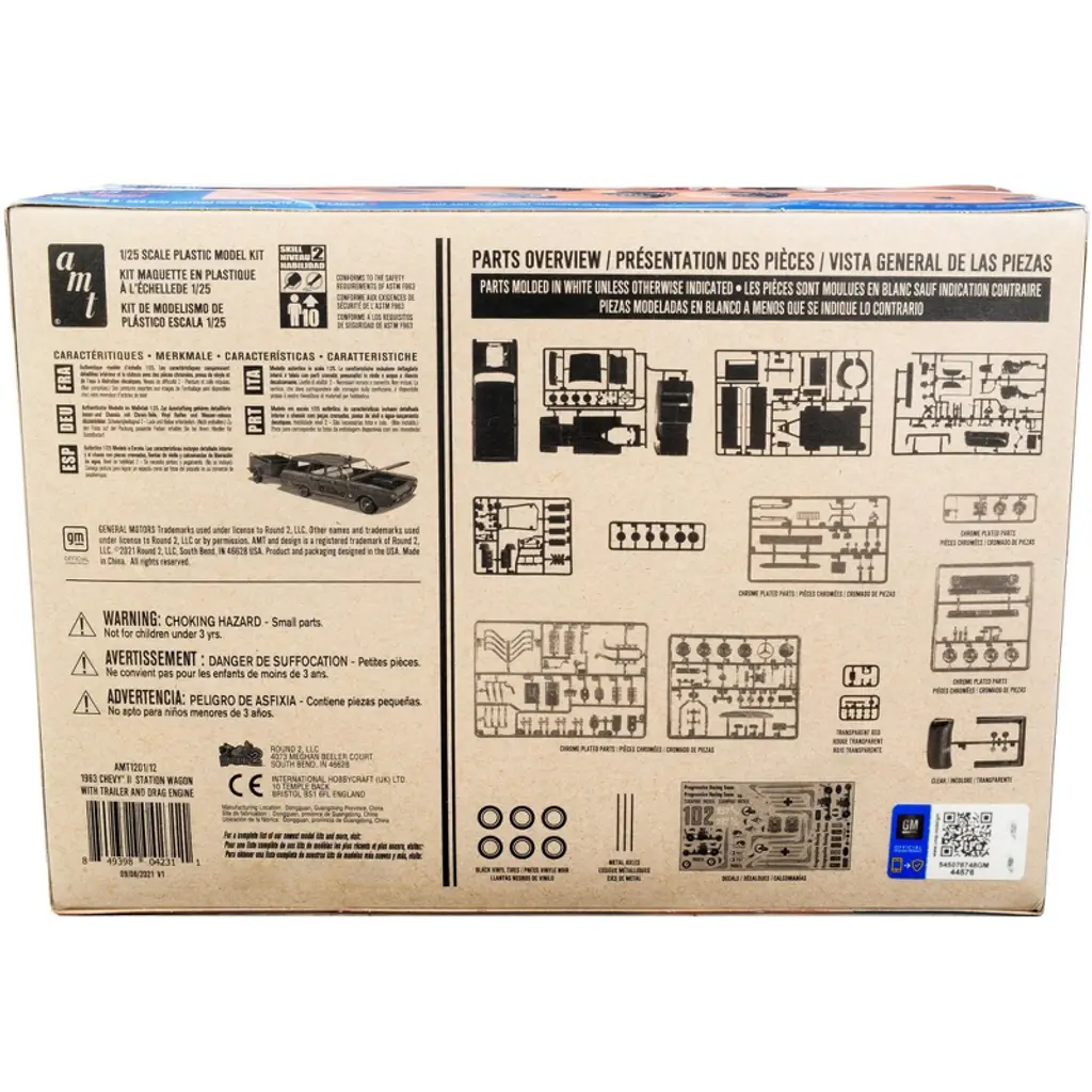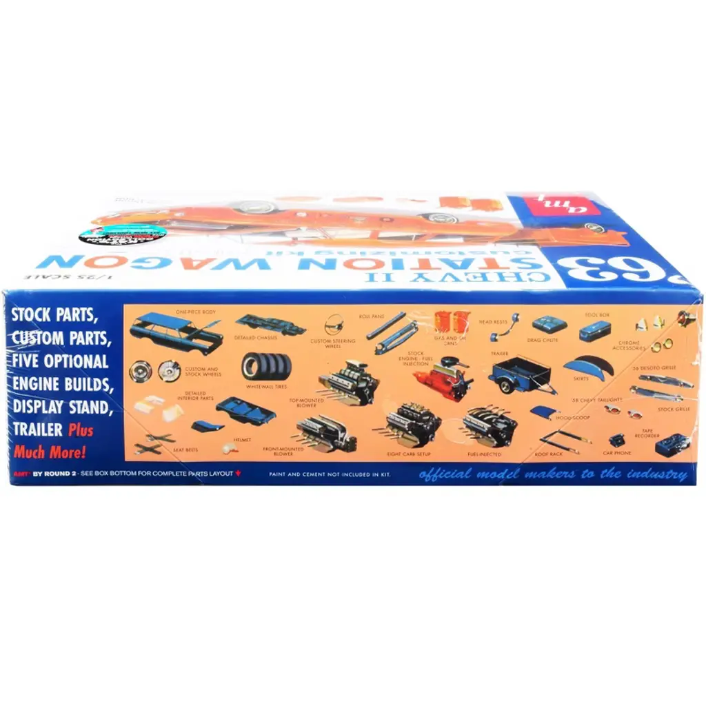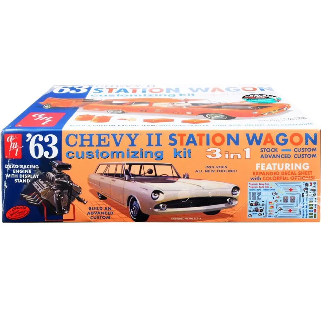 Brand new 1/25 scale plastic model kit of 1963 Chevrolet II Station Wagon with Trailer 3-in-1 Kit (Skill 2) 1/25 plastic model kit by AMT. Brand new box. Colorful decal artwork. Includes all new tooling. Vintage style packaging. Racing team accessories. Officially licensed product. Chrome plated small parts. Stock engine with fuel injection. Black vinyl tires and metal axles. Drag racing engine with display stand. Paint and cement required (not included). Parts molded in WHITE, unless otherwise indicated. Featuring expanded decal sheet with colorful options. "Chrome" trim detail can be striped on with silver paint. Build your kit one of three ways: Stock, Custom and Advanced Custom. Build a Custom Racing Team: includes trailer, tool box, helmet and parachute. Stock parts, custom parts, five optional engine builds, display stand, trailer plus much more! One-piece body, custom and stock wheels, detailed interior parts, seat belts, helmet, detailed chassis, Whitewall tires, top-mounted blower, front-mounted blower, custom steering wheel, roll pans, stock engine fuel-injection, gas and oil cans, eight carb setup, head rests, trailer, drag chute, fuel-injection, tool box, skirts, '58 Chevy taillights, hood scoop, roof rack, chrome accessories, car phone, tape recorder, stock grille, '56 Desoto grille.