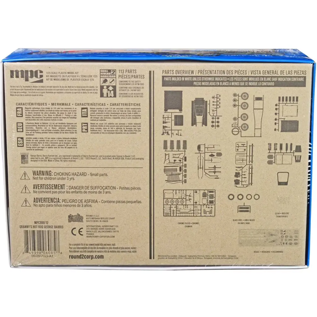 Brand new 1/25 scale plastic model kit of Granny's Hot Rod By George Barris 2-in-1 Kit (Skill 2) 1/25 plastic model kit by MPC. Brand new box. Black vinyl tires. Colorful decal artwork. MAG and spoke wheels. Vintage style packaging. Officially licensed product. Chrome plated small parts. Contains 113 detailed parts. Barrels, jugs, and tool case. Roll bars, rear spoiler and bulb horn. High velocity stacks and chrome exhausts. Stock engine and injected V-8 racing engine. Paint and cement required (not included). Manufacturer's original unopened packaging. Four custom bucket seats and Granny's bench. Parts molded in WHITE, unless otherwise indicated. Build your kit one of two ways: Granny's Hot Rod, Family Car.