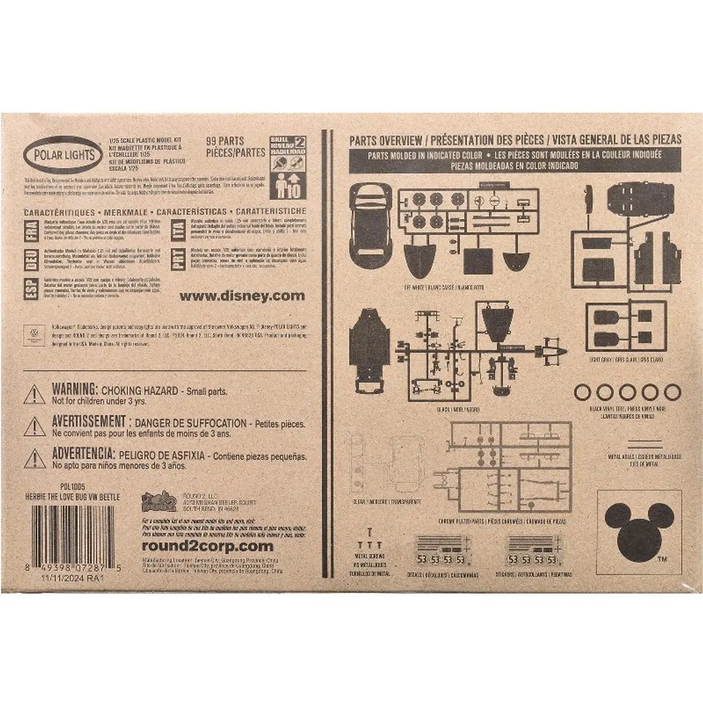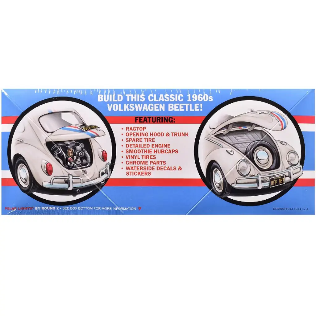 Brand new 1/25 scale plastic snap model kit of Volkswagen Beetle Herbie "The Love Bug" (1969) Movie (Skill 2) 1/25 plastic snap model kit by Polar Lights. Brand new box. Ragtop and spare tire. Colorful decal artwork. Vintage style packaging. Snap-together assembly. Officially licensed product. Chrome plated small parts. Contains 99 detailed parts. No paint or glue required. Has opening hood and trunk. Black vinyl tires and metal axles. Detailed engine and smoothie hubcaps. Manufacturer's original unopened packaging. Parts molded in COLOR, unless otherwise indicated.