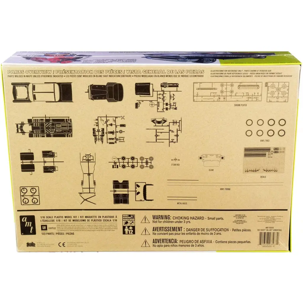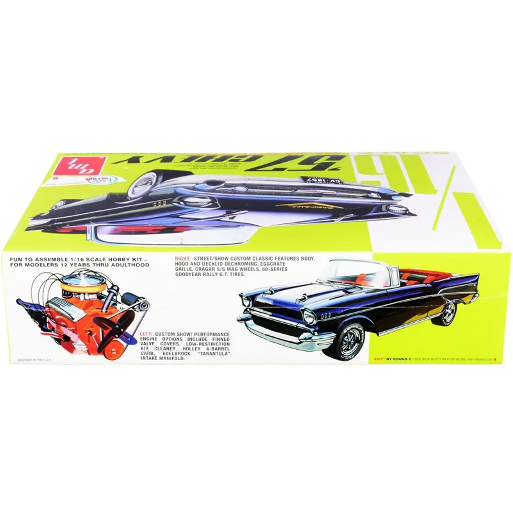 Brand new 1/16 scale plastic model kit of 1957 Chevrolet Bel Air Convertible 2-in-1 Kit (Skill 3) 1/16 plastic model kit by AMT. Brand new box. Whitewall tires. Detailed interior. Colorful decal artwork. Vinyl hoses and wiring. Vintage style packaging. Opening doors and hood. Chrome plated small parts. More than 123 detailed parts. Stock version plus custom parts. Black vinyl tires and metal axles. Model L-12 inches long assembled. Paint and cement required (not included). Parts molded in white, unless otherwise indicated. Build your kit one of two ways: Stock or Custom. Street/Show custom classic features body, hood and decklid dechroming, eggcrate grille, cragar S/S Mag wheels, 60-Series Goodyear rally G.T. tires. Custom Show/ Performance engine options include finned valve covers, low-restriction air cleaner, Holley 4-barrel carb, edelbrock "Tarantule" intake manifold. Superdetailed stock engine - Chevy's high performance "Super Turbo-Fire" 283 cubic inch V-8 engine with dual exhausts, and 4-barrel carb. Kit includes vinyl ignition wiring and radiator hoses for added realism.